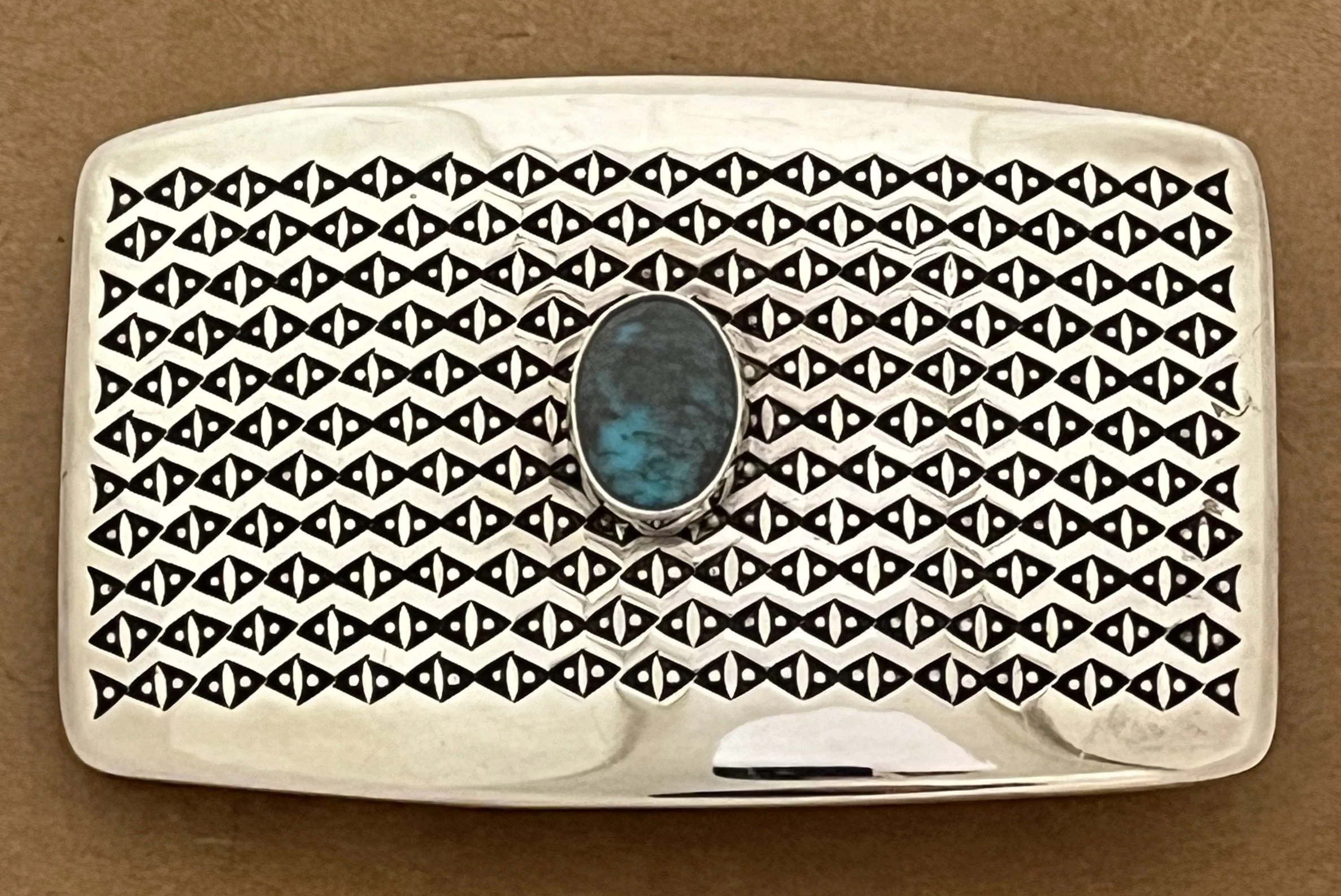 One of Norbert Peshlakai’s great belt buckles, set with an excellent piece of natural Bisbee turquoise. Made for a 1 inch belt, it measure 2.5 by 1.75 inches. $1200 (SANTA FE)