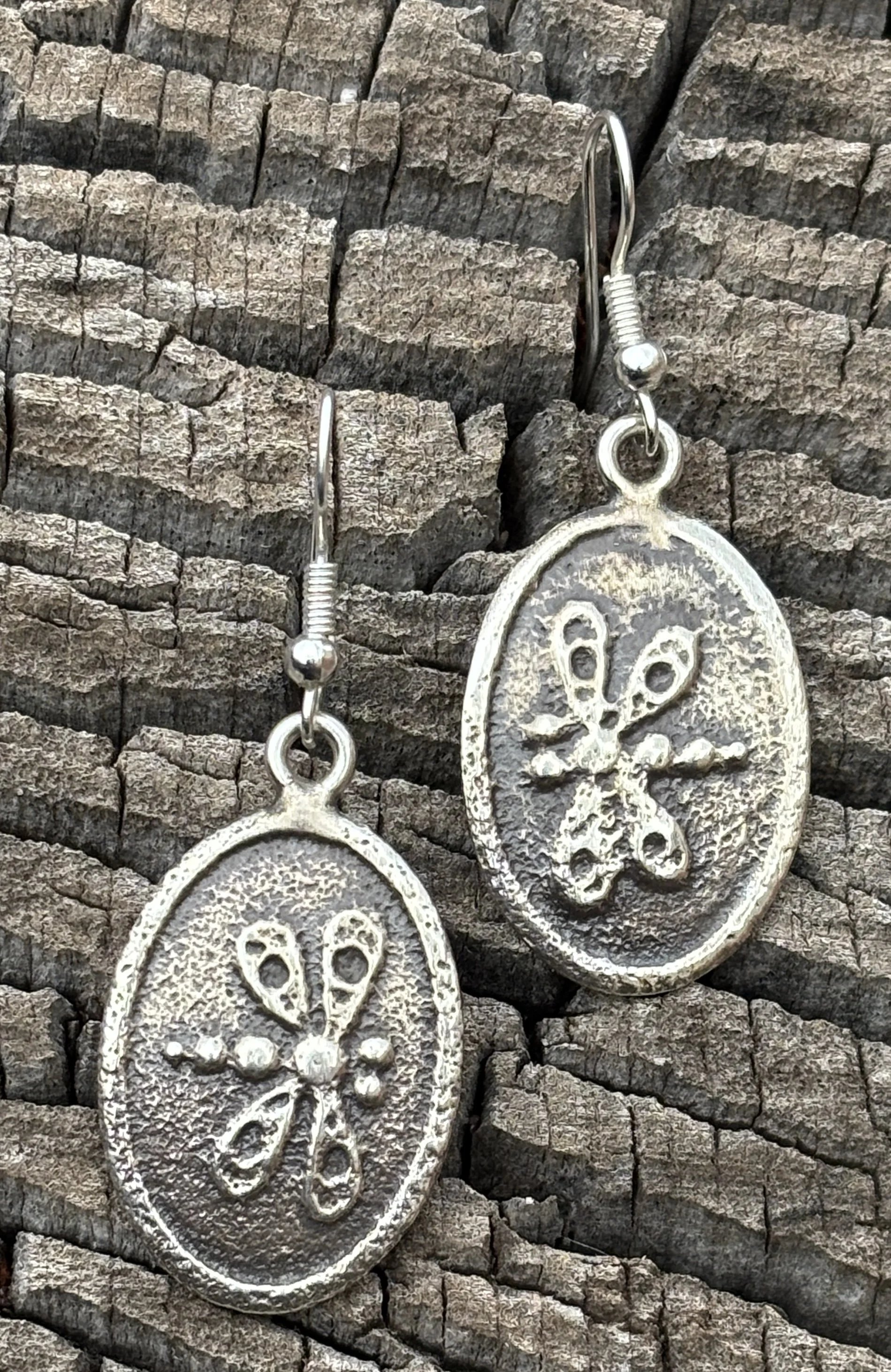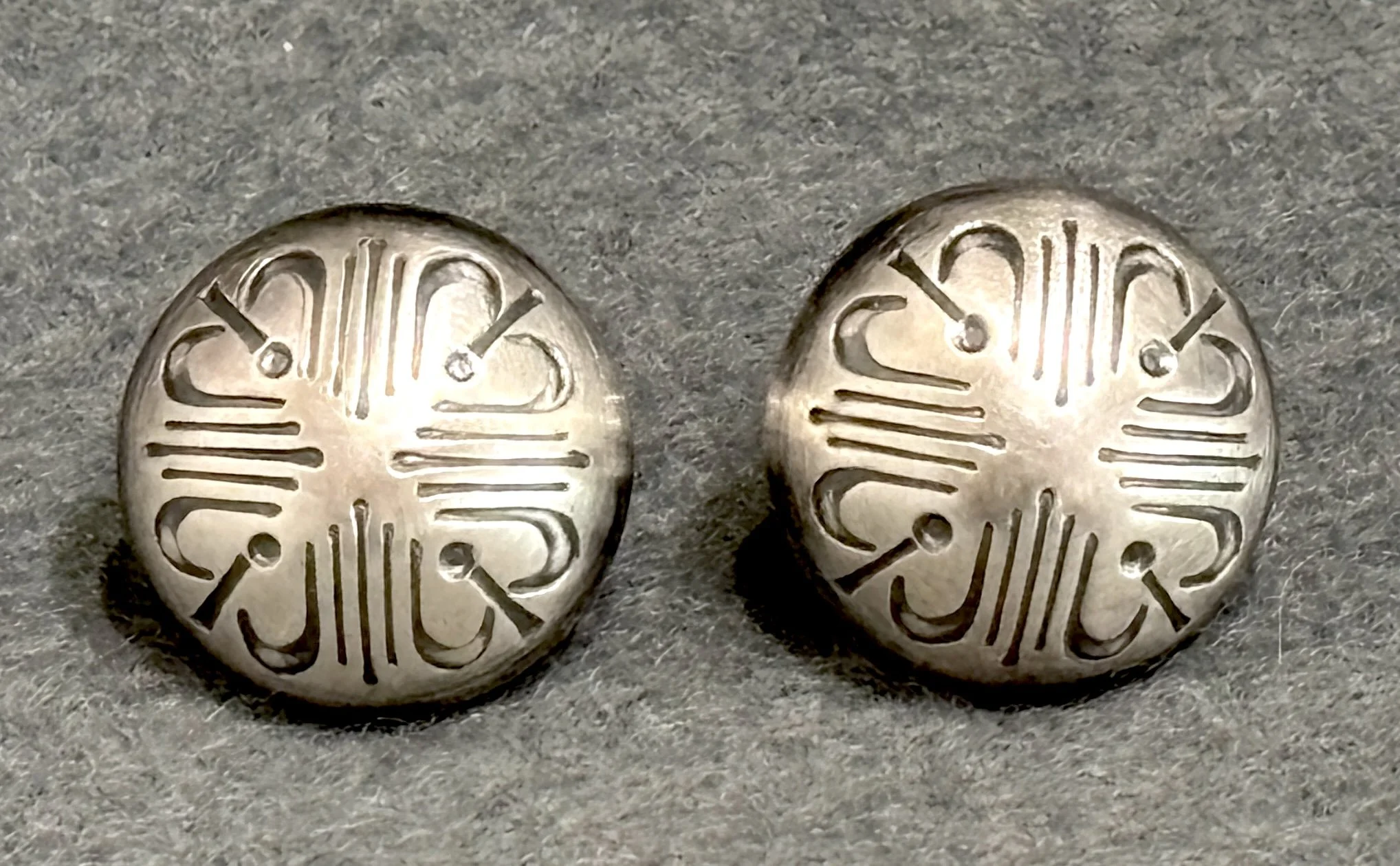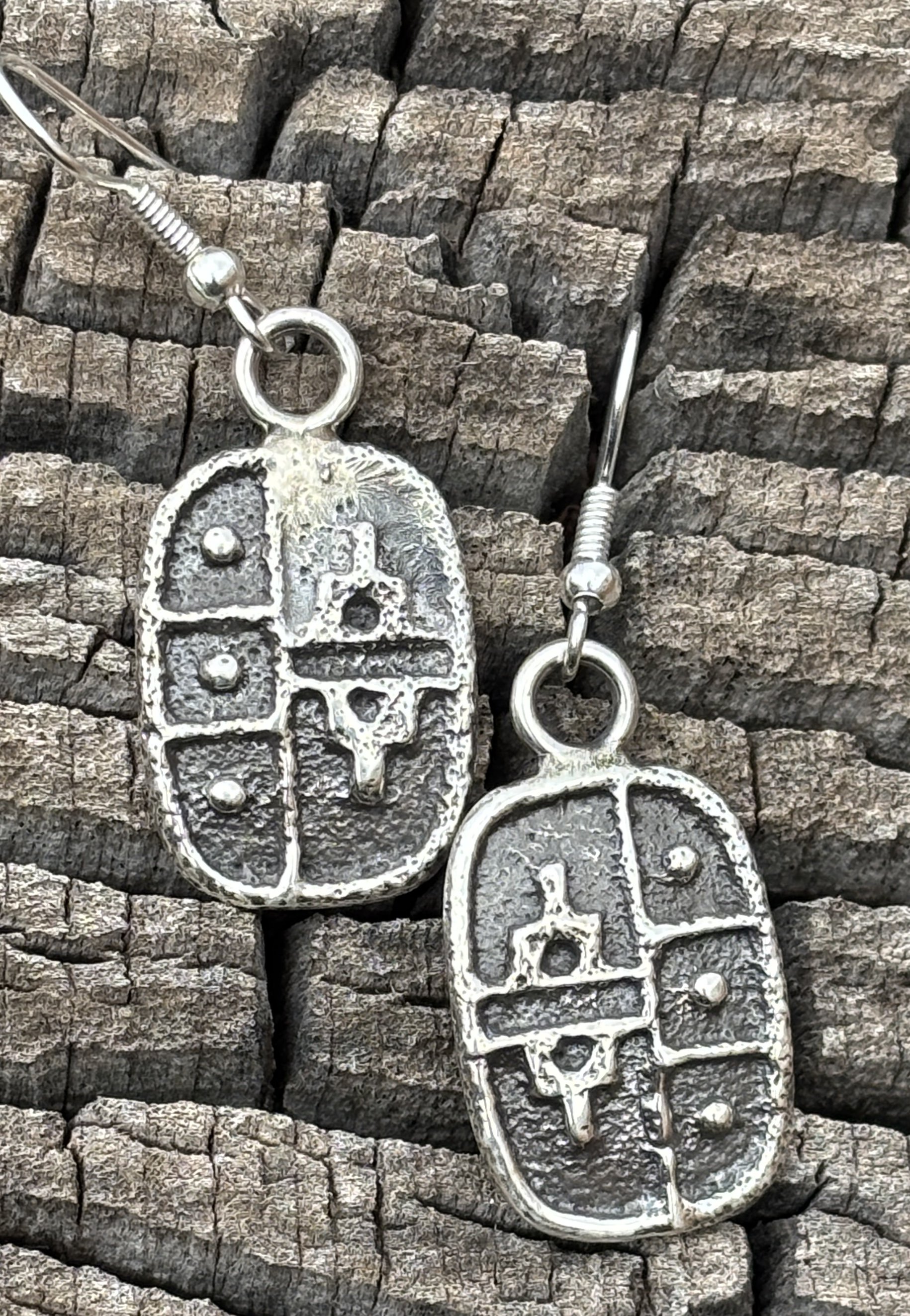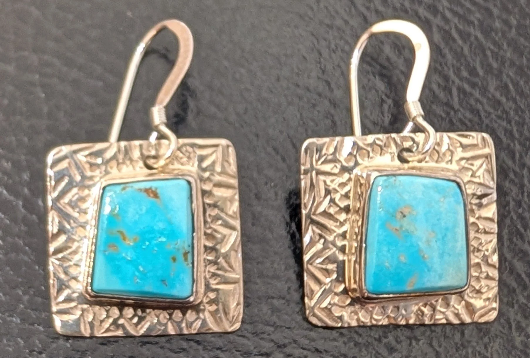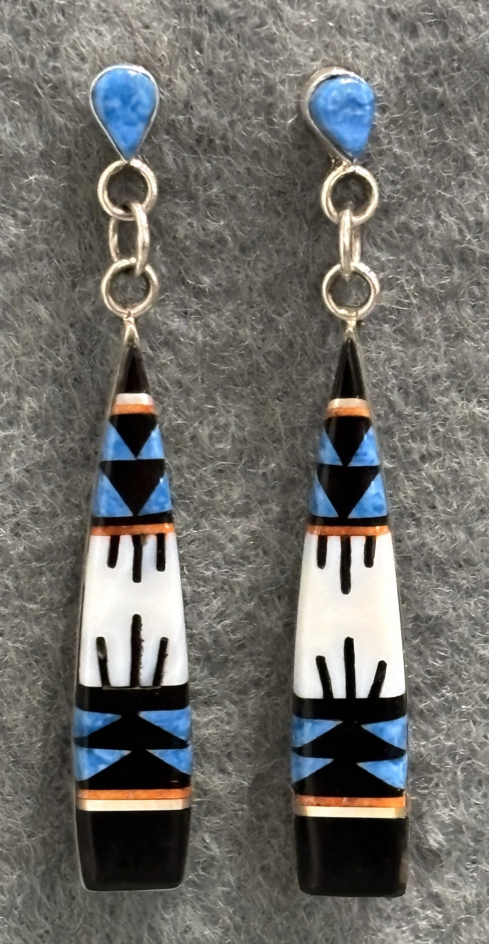 The first pair of earrings in the row above are by Kee Yazzie Jr. Featuring Kee’s “migration” design, they are 1 1/8 inches in diameter and $180. Tim Herrera of Cochiti made this vintage style pair of dangle earrings, 2 inches long and $145. The mosaic inlay pair at right were made by Fernandes Lementino of Zuni. Set with jet, denim lapis, coral and gold lip Mother of Pearl shell. These are 2 1/8 inches long and $90. (ALL in SANTA FE)