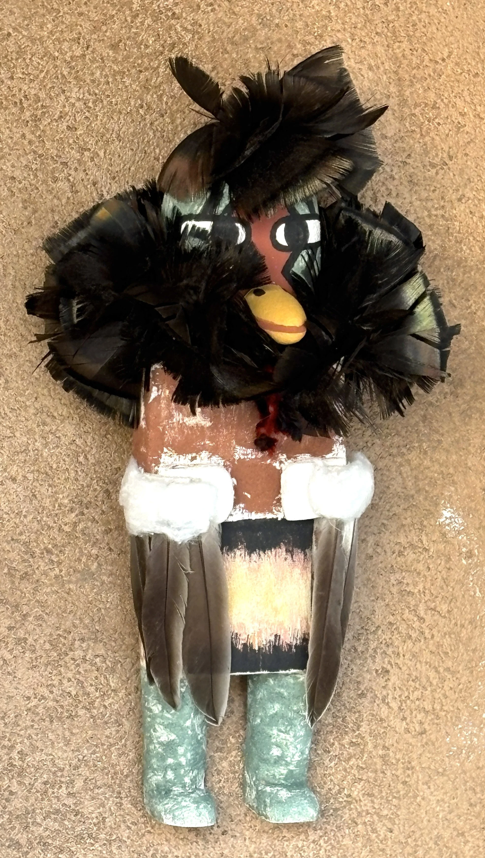 Two “Tewasquaptewa dolls” by Ryon Polequaptewa of the Sun Clan from the village of Songóopavi on Second Mesa. Ryon took inspiration from the dolls carved by his great-grandfather, Wilson Tewaquaptewa (1873-1960), who was the last traditional kikmongwi of Orayvi Village. Ryon created these dolls in Tewaquaptewa’s iconic style, which is a mixture of attributes from several katsinas, something Tewaquaptewa began in the 1920s and were not meant to represent a particular katsina or concept. The range from 10 to 11 inches without the feathers and are $450 each. An Isöö by Ramson Lomatewama, who is also a well-regarded glass artist. 17 inches tall. $300 (ALL IN TUCSON)