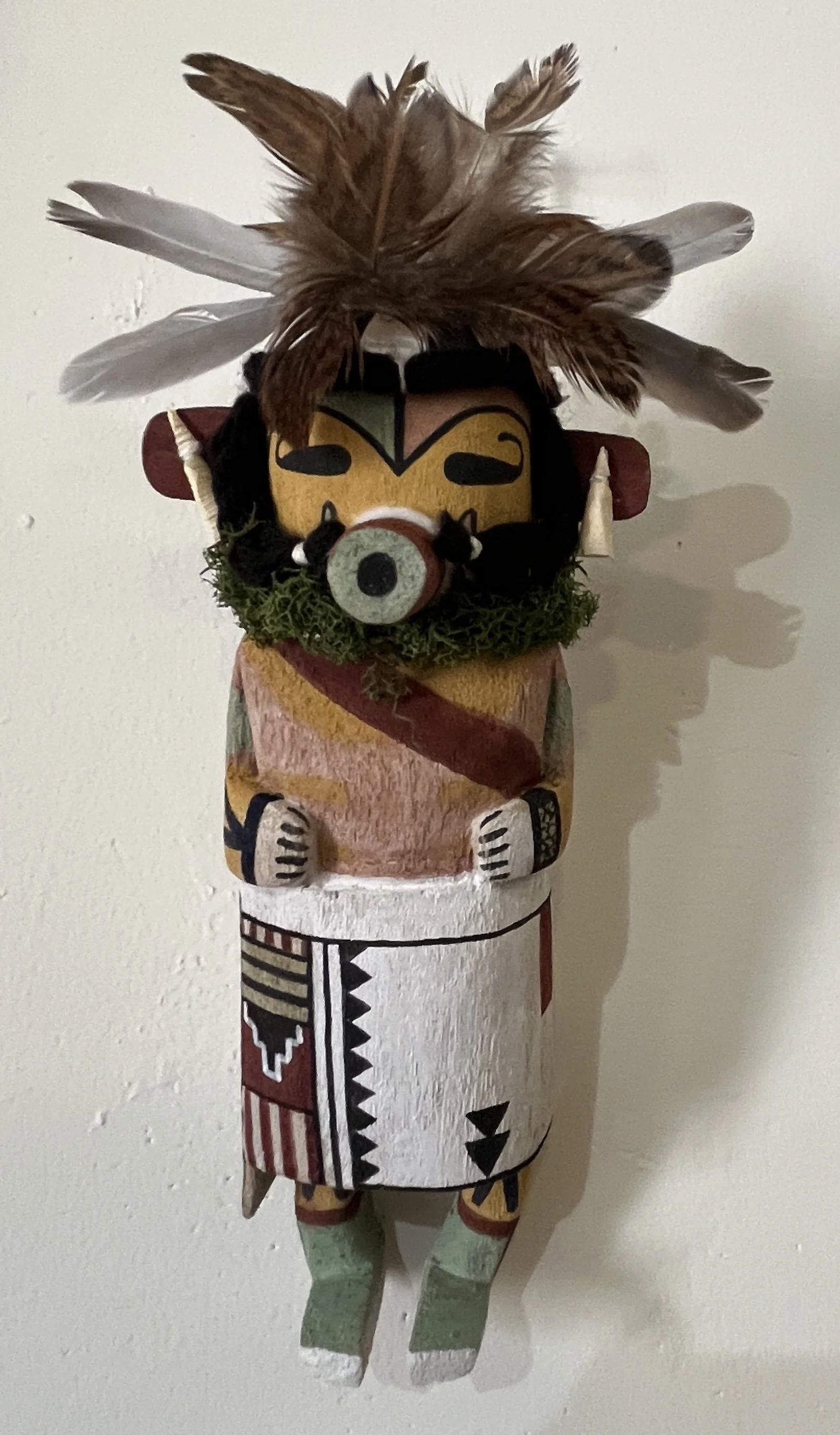 A Sio Ho’ote by Randy Brokeshoulder. 13.5 inches and $600. (TUCSON) In the center is a Talavai’i or Early Morning Katsina by Wally Grover, carved about 20 years ago. 10.75 inches tall. $300 (TUCSON) Last in the row is a Sösöpa or Cricket katsina by Hongvi Marquez. This one is 9.5 inches high to the tips of the grass and $300. (SANTA FE)
