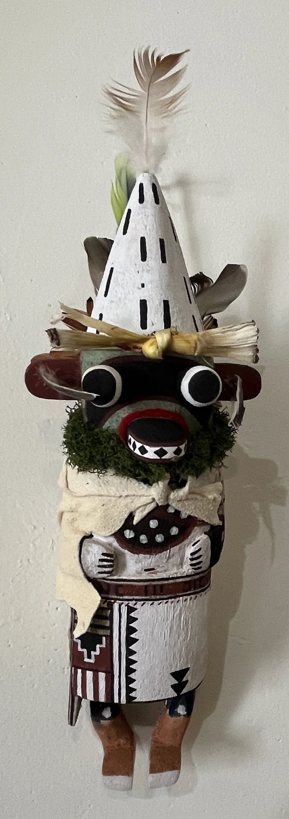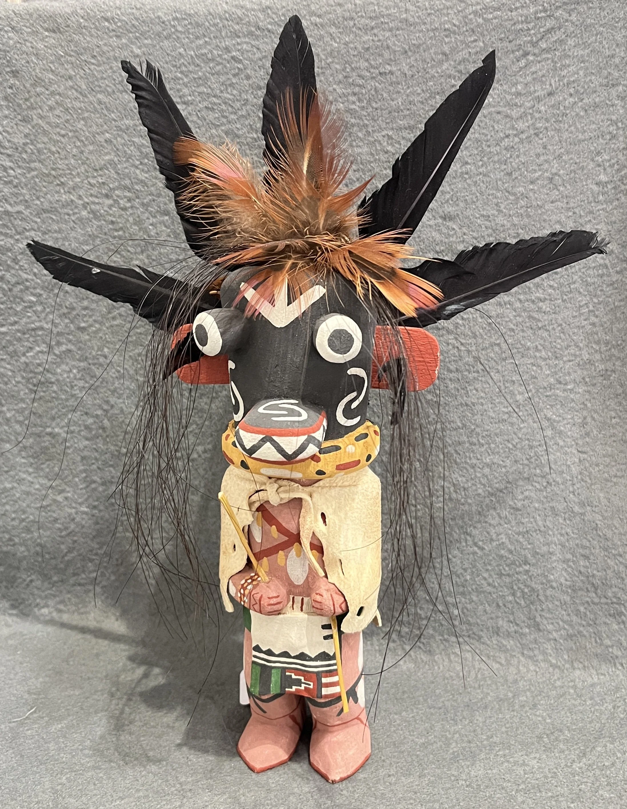 A Ngayayataqa or Swaying Man katsina by Tayron Polequaptewa. 12 inches high to feather tips and $450 ON HOLD. A Hópöngaw or Woodpecker katsina by Randy Brokeshoulder. 11 inches high to feather tips and $300. At right is a Tsü Hilili by Shawn Deel, 10.25 inches high to feather tips and $400. (All in SANTA FE)