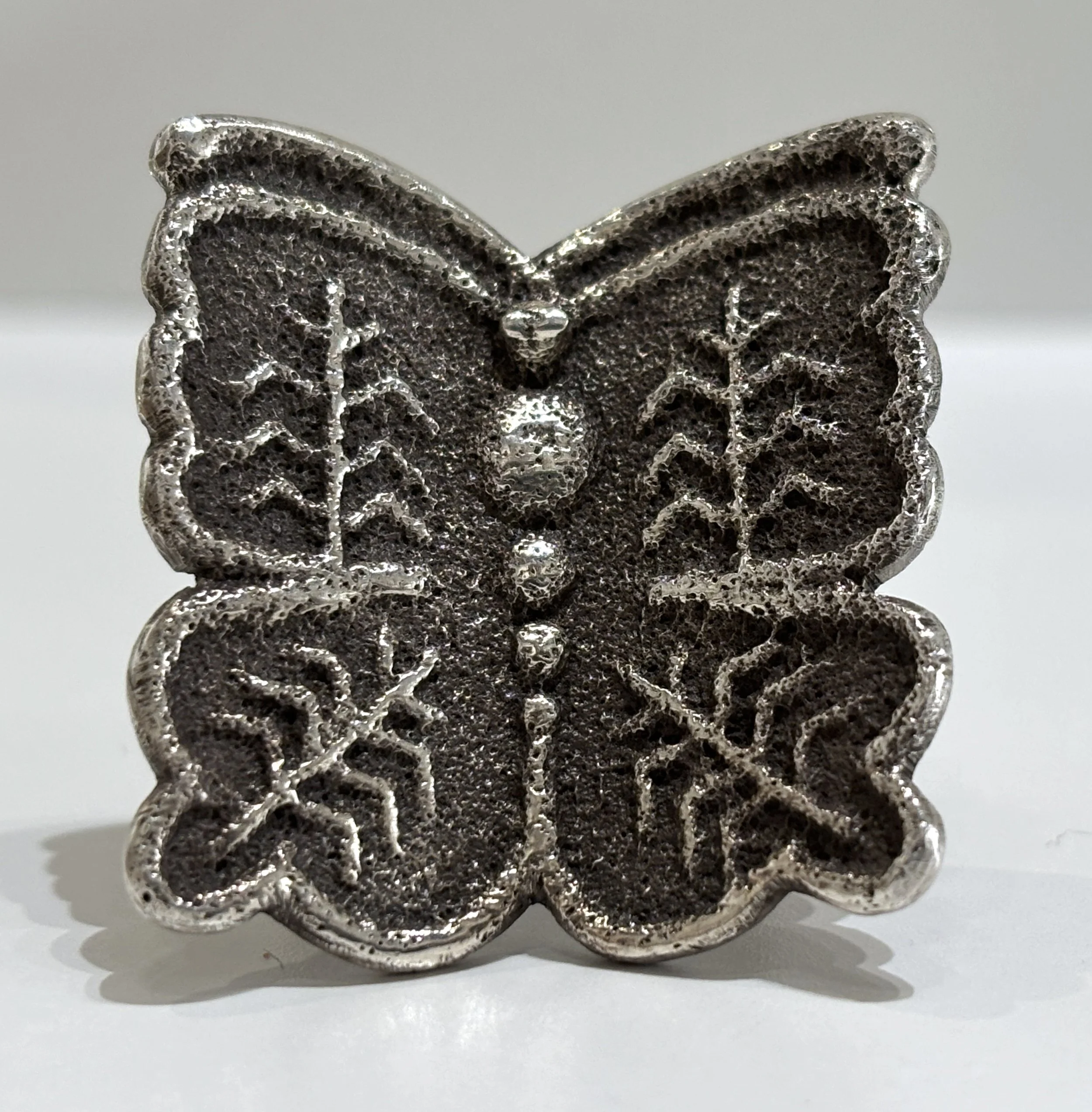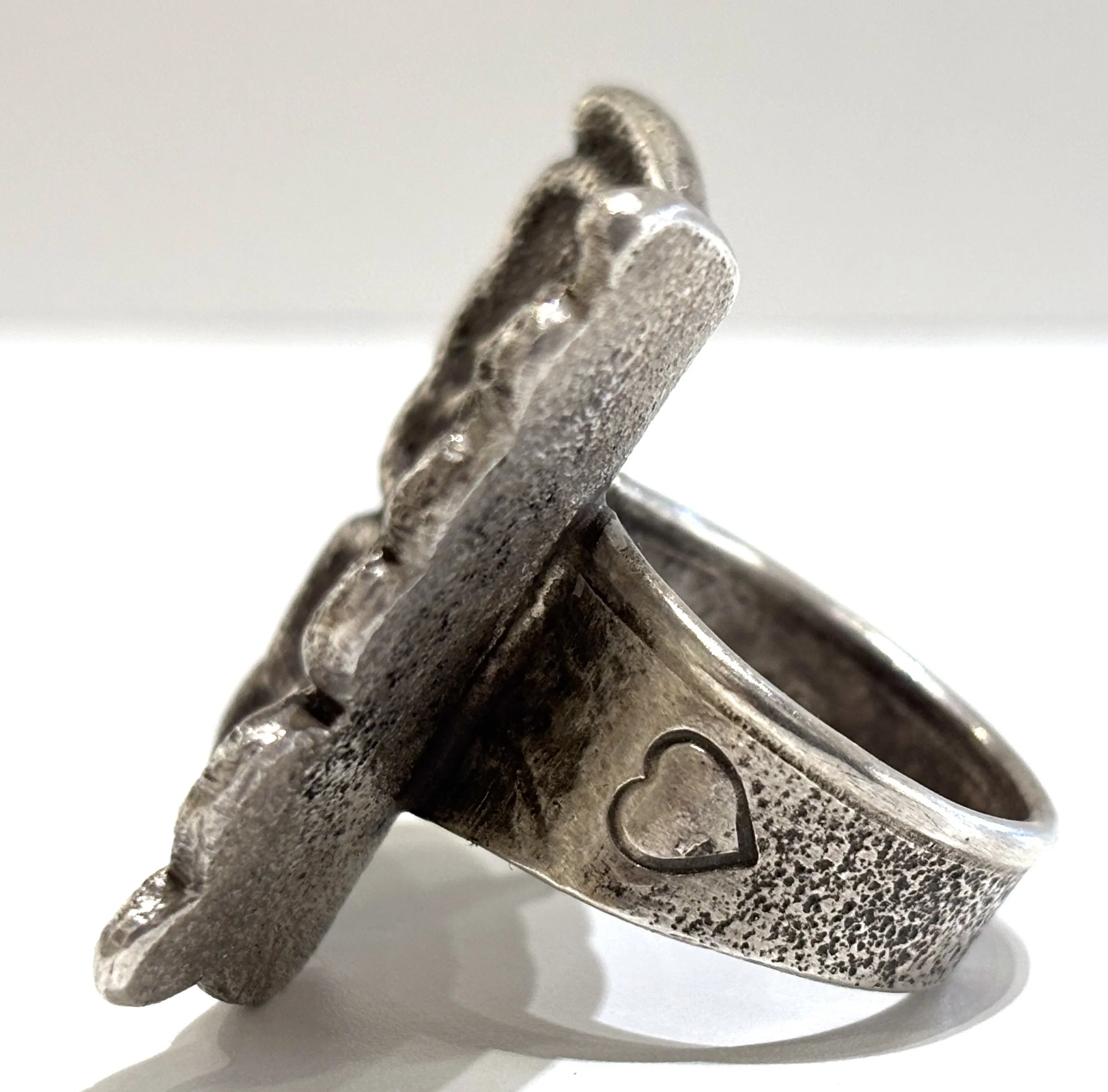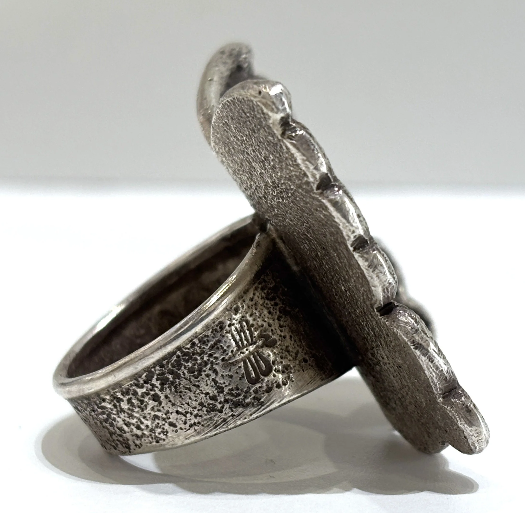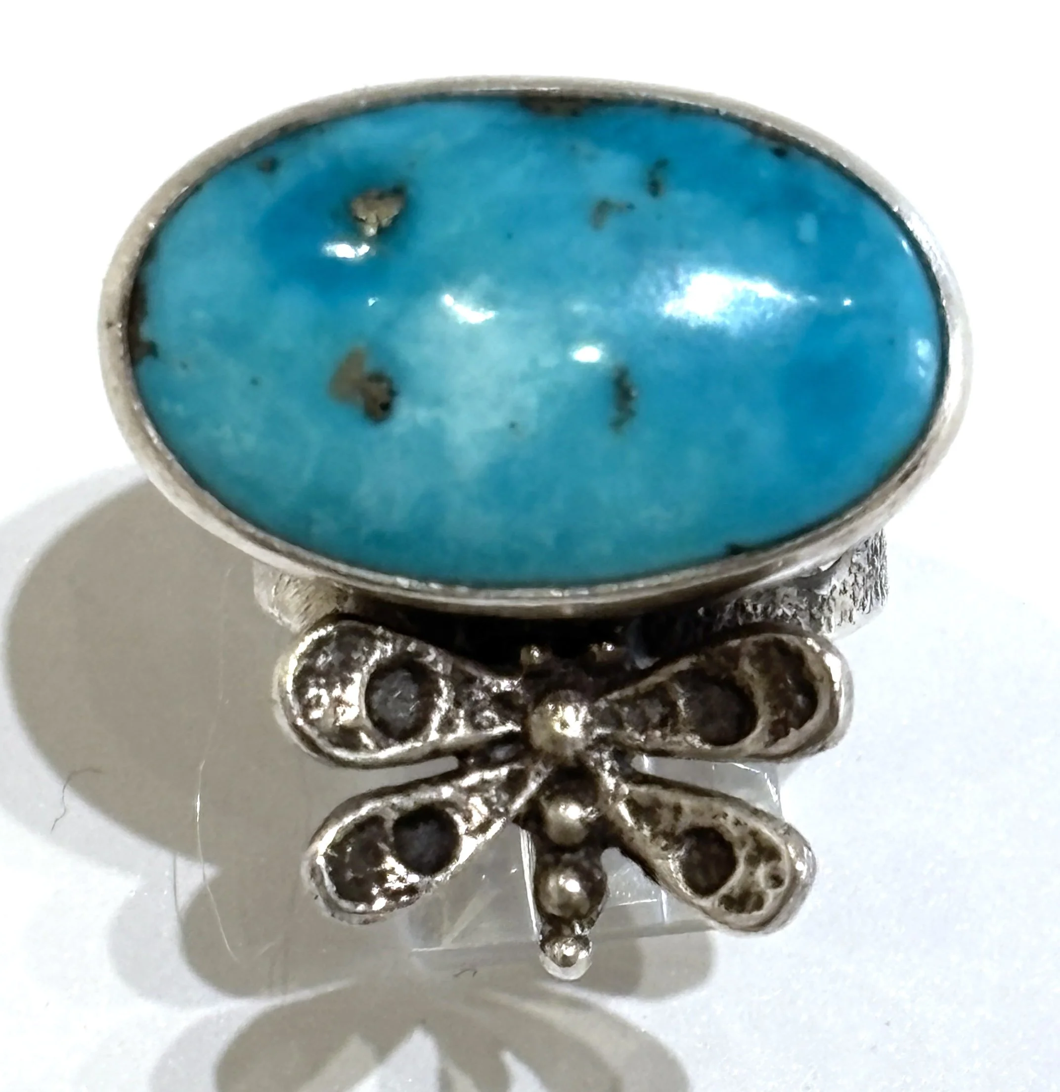 From left to right: Set with an unusual cut natural Royston turquoise, it measures 1.5 by 1 inch and is a size 11. $400. With a chiseled bezel, the next one is a size 9 1/2 and measures 1 1/4 by 1 1/8. Natural turquoise by Craig Agoodie, SOLD. Also by Craig is this ring set with natural turquoise from the Pilot Mountain Mine, size 9.5 and is $520. Lastly, a ring by Dean Brown that is set with natural turquoise from the Kingman region. A size 8, it is 2 by 1.5 inches. $285. (ALL IN TUCSON)