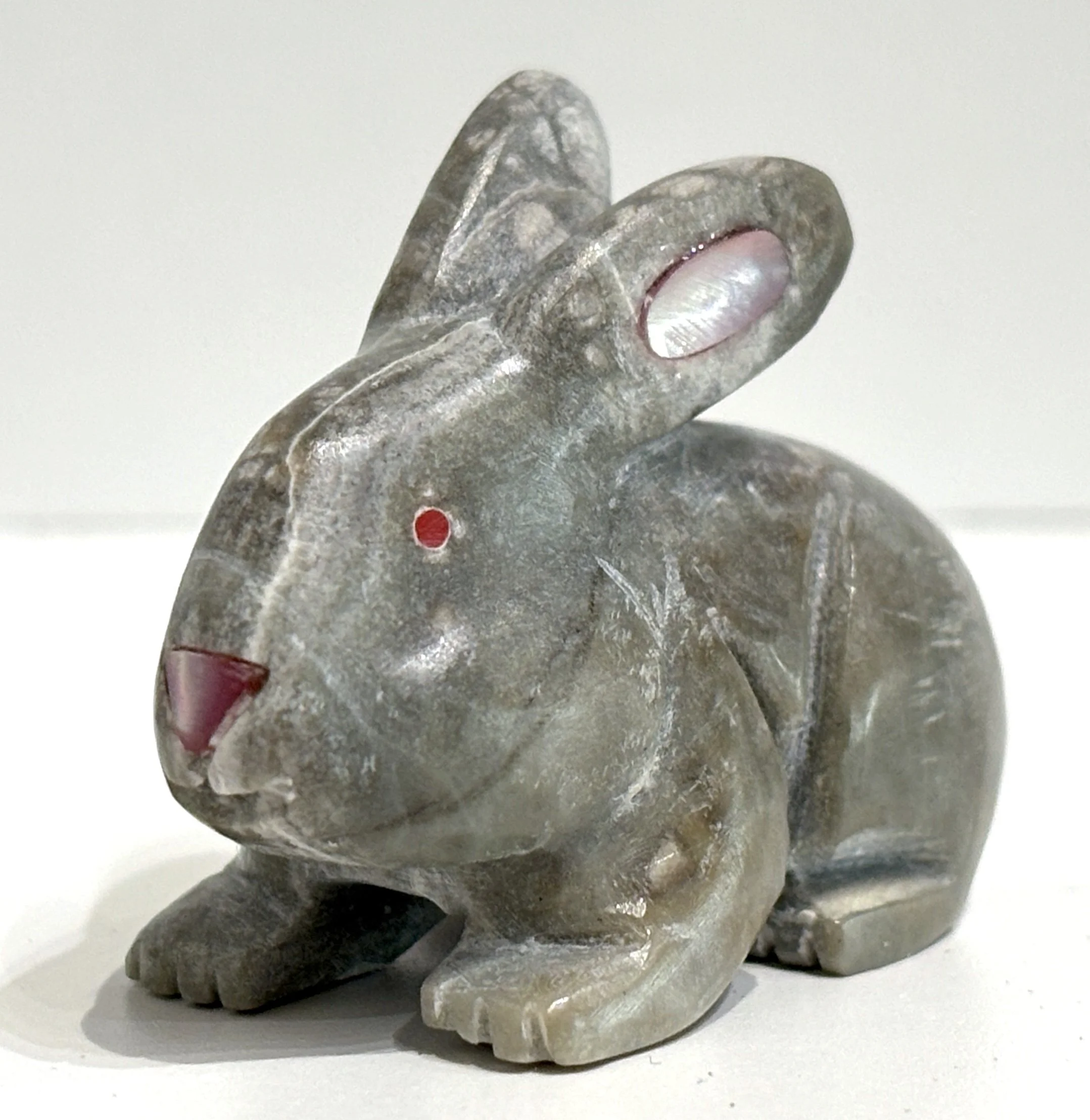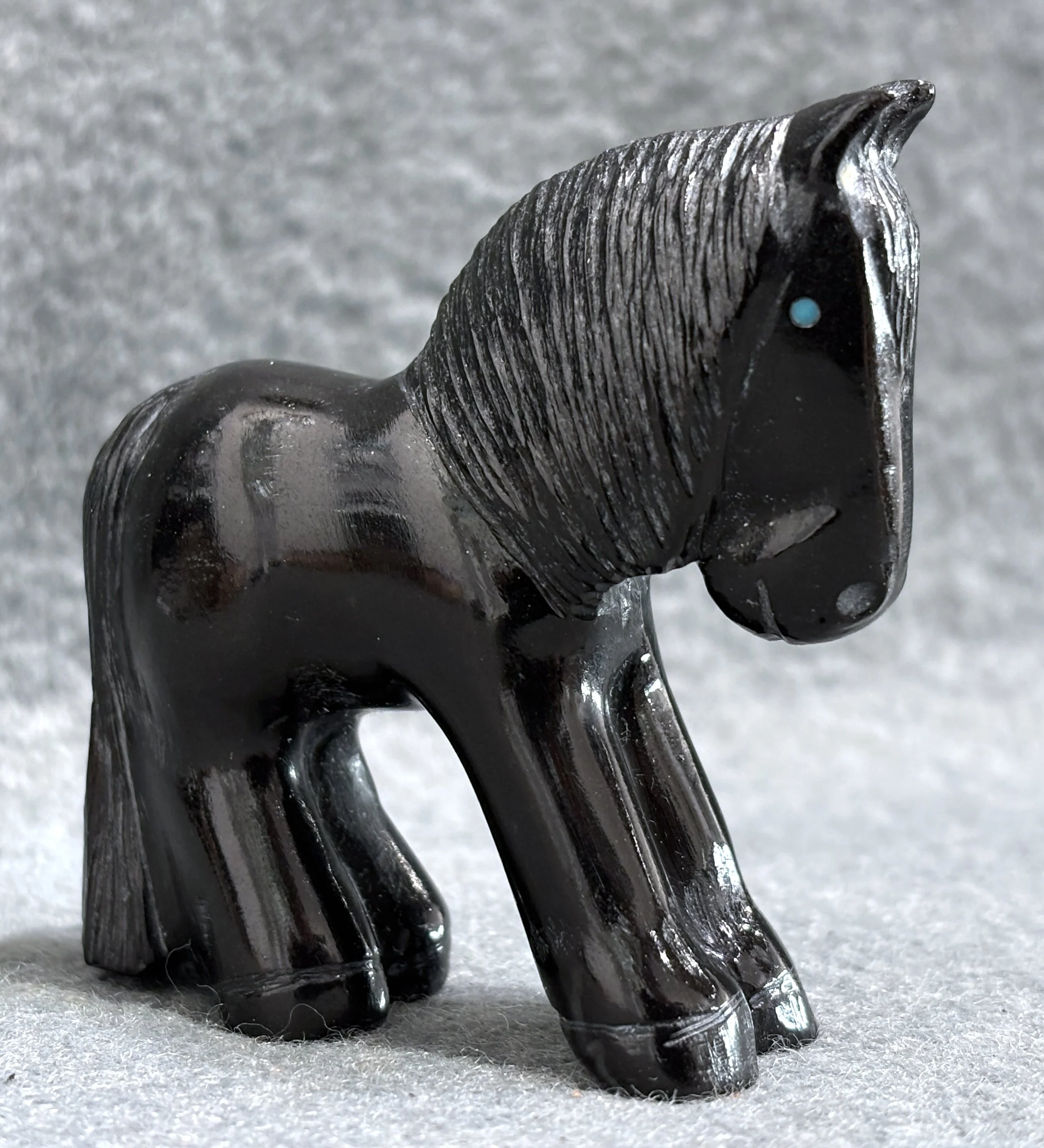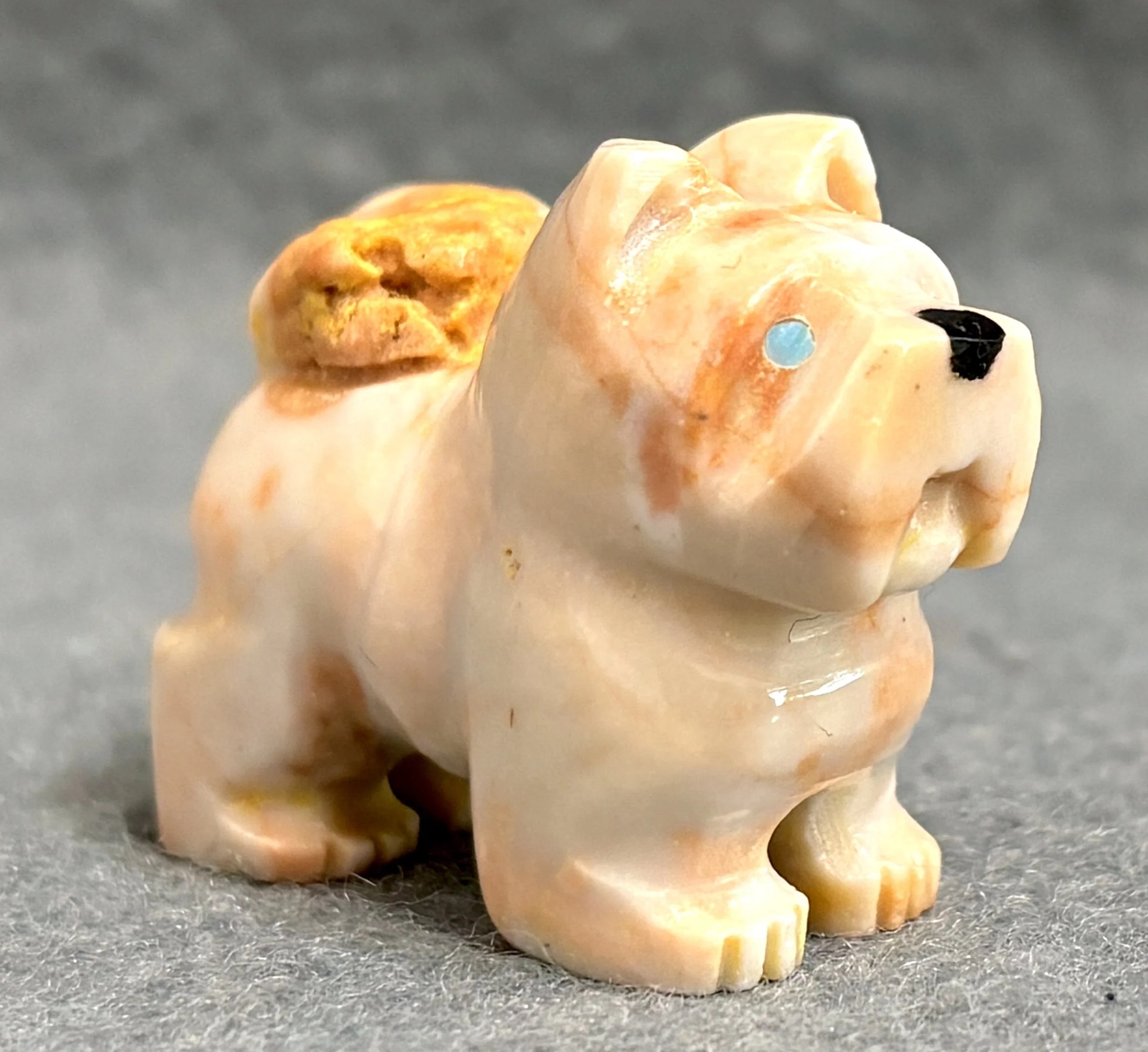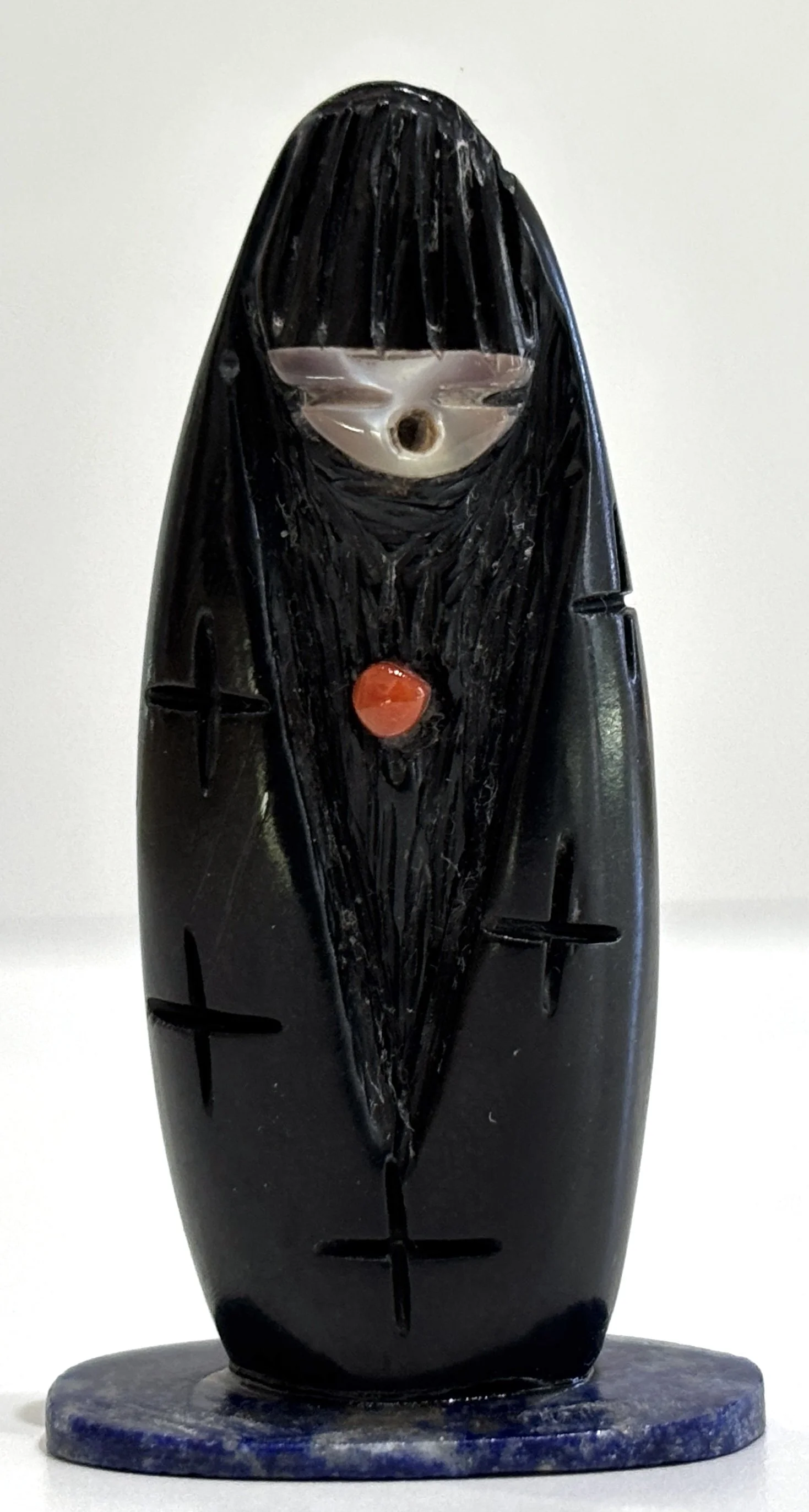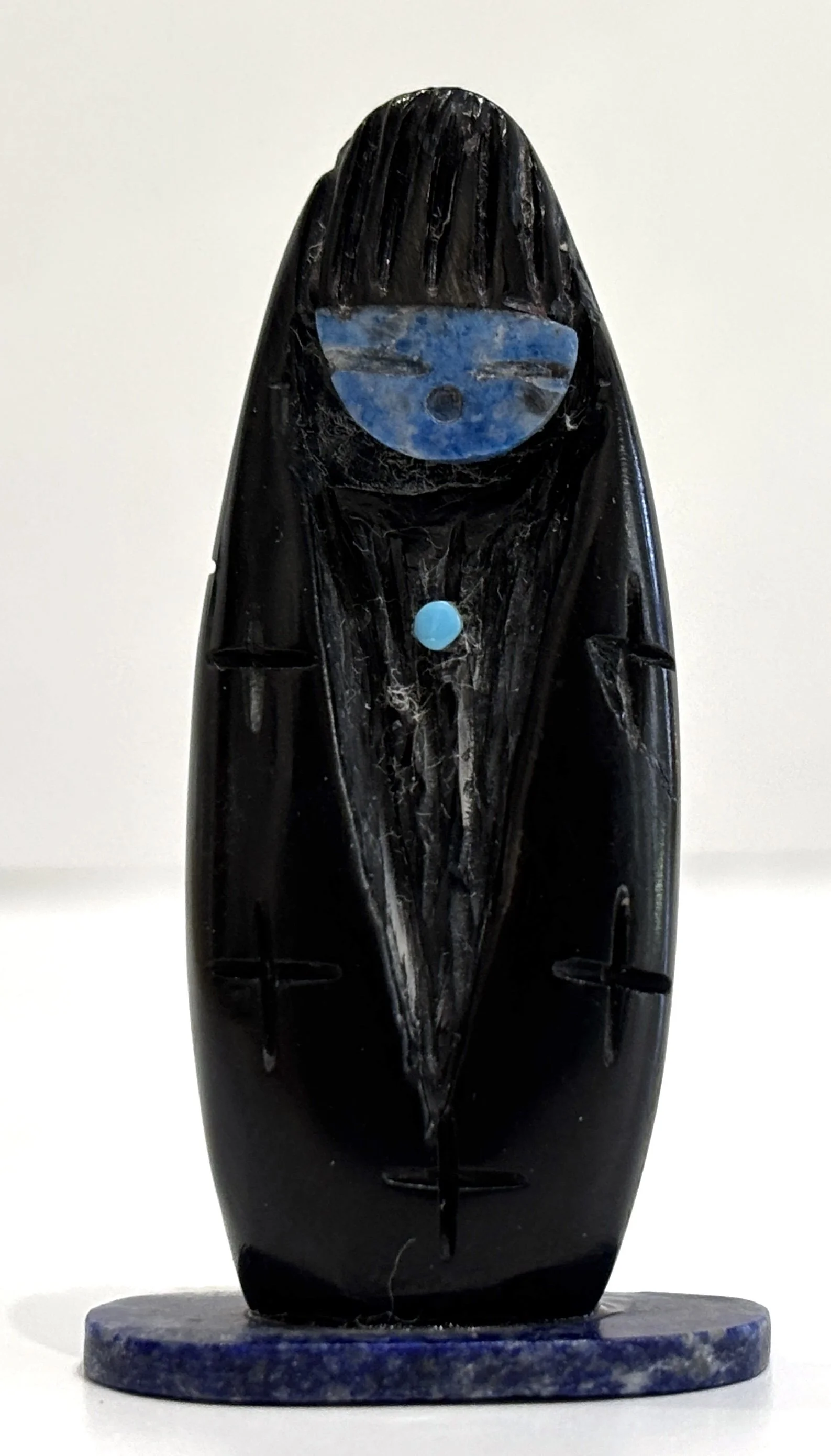An onyx coyote by James Panteah (son of Abby Quam-Panteah and Clayton Panteah). 2.5 inches high and $75. A sweet little butterfly maiden carved from jasper by Danette Laate. She is a smidge over 1.5 inches high and $42. The Picasso marble bear was made by Andres Lementino. The inlaid sunface is made up of shell, apple coral, jet and turquoise. 1 5/8 inches high and $75. The onyx owl is by Evalena Boone, just over 2 inches high and $50.