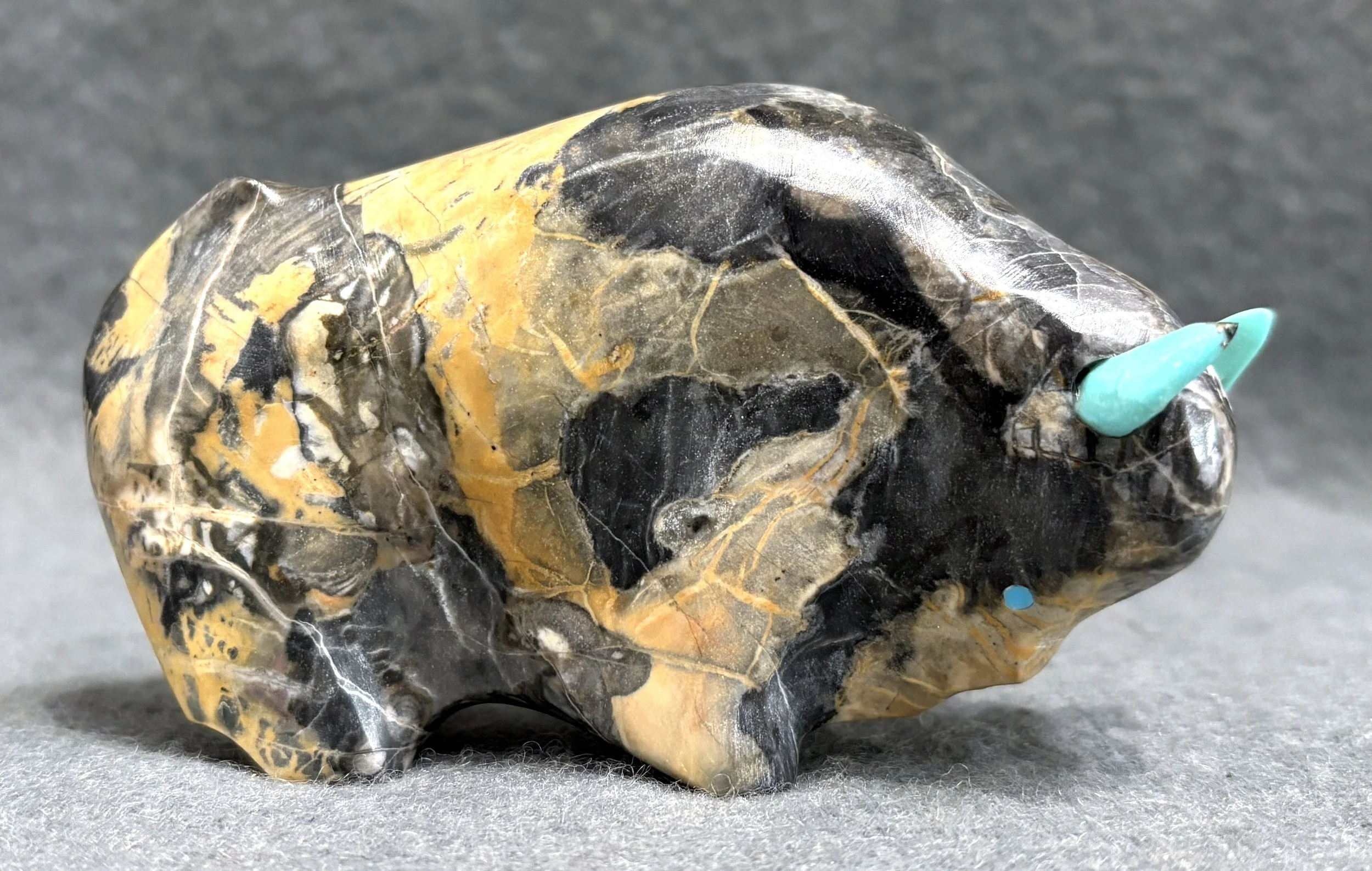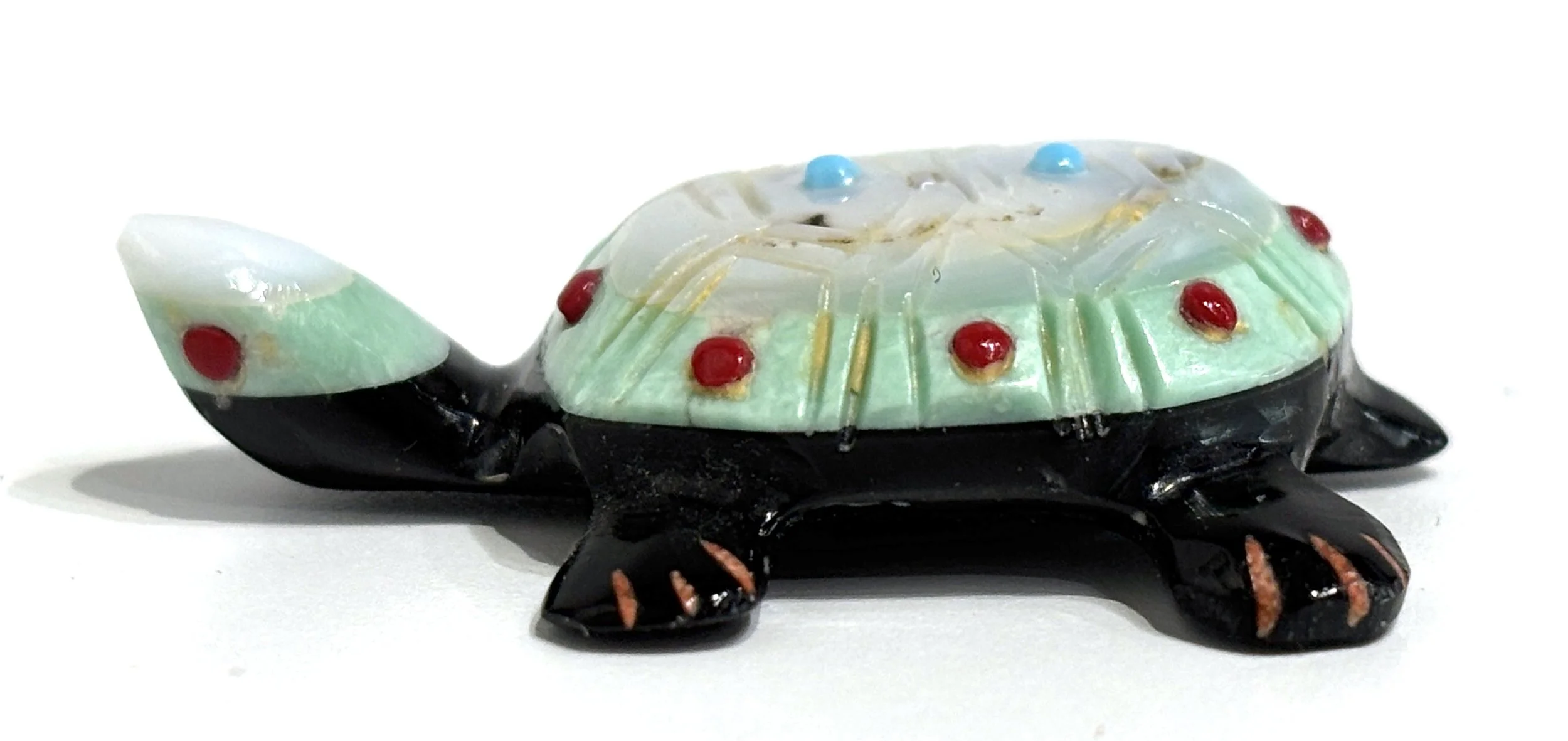Two views of a horned lizard by Sedrick Banteah. Carved from Picasso marble it is 2 1/8 inches long and $90. The turtle at far right was made by Andrew Quam. Silverado jet, Mother of Pearl shell, turquoise and coral make up this cute little guy. Just over 1.5 inches long and SOLD.