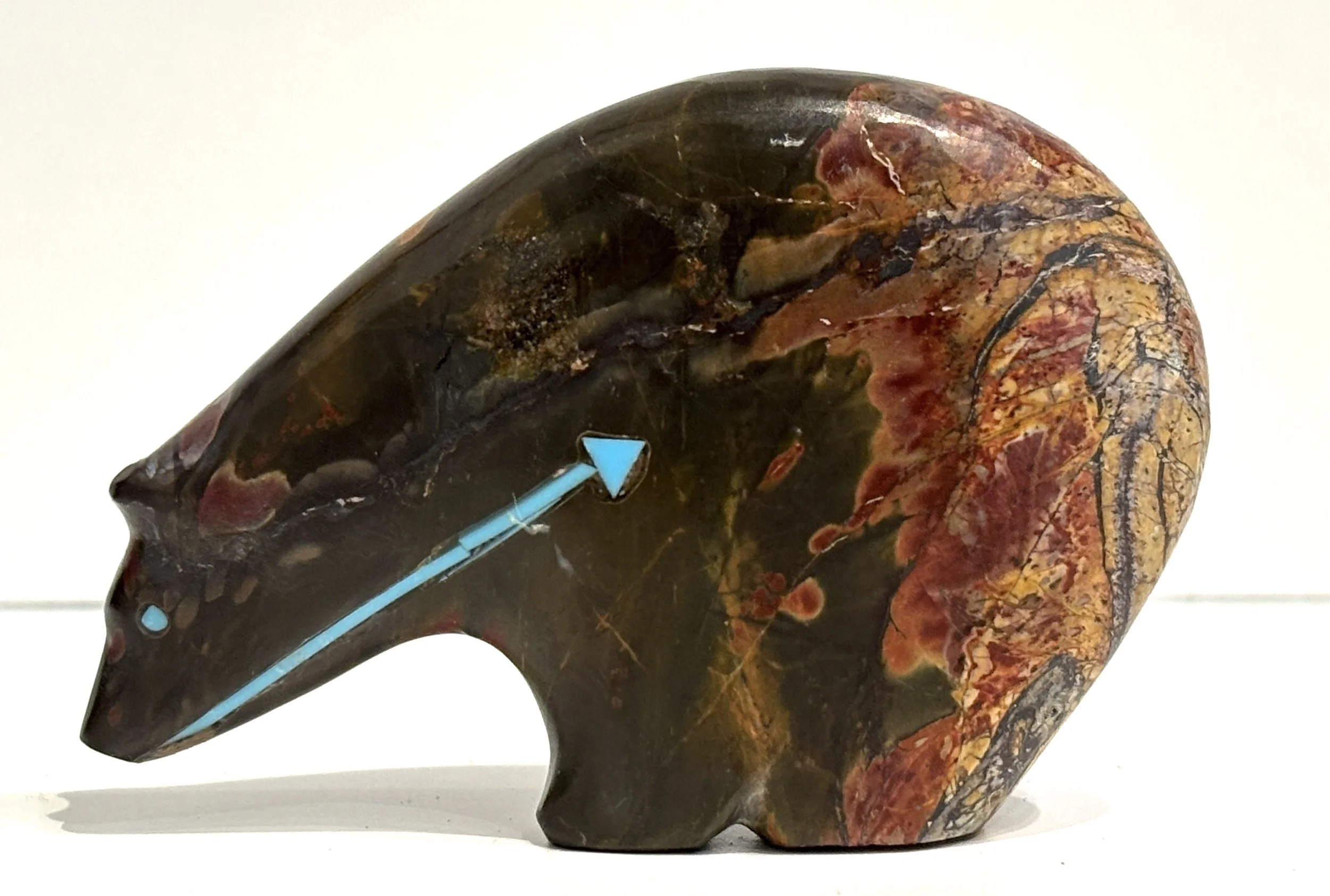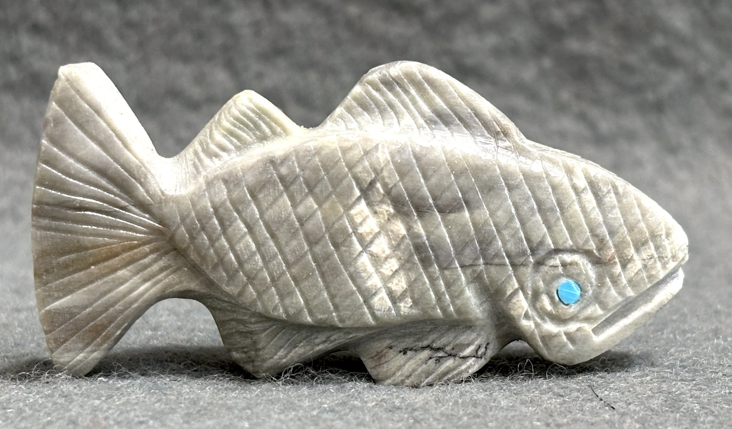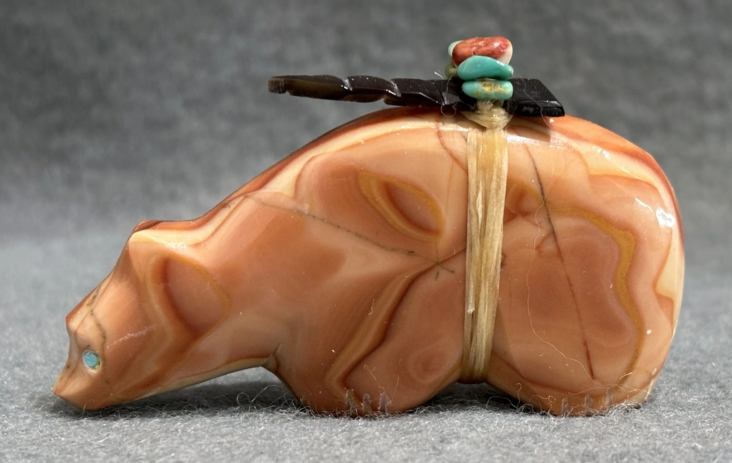 A Zunistone figure carved by Freddie Leekya, he is 4.25 inches high and $150. The fishing bear, complete with his sterling silver fishing rod, was made by Chris Gchachu. The bear is carved of serpentine, while the fish is a piece of shell. Just under 2.5 inches high and is $250.