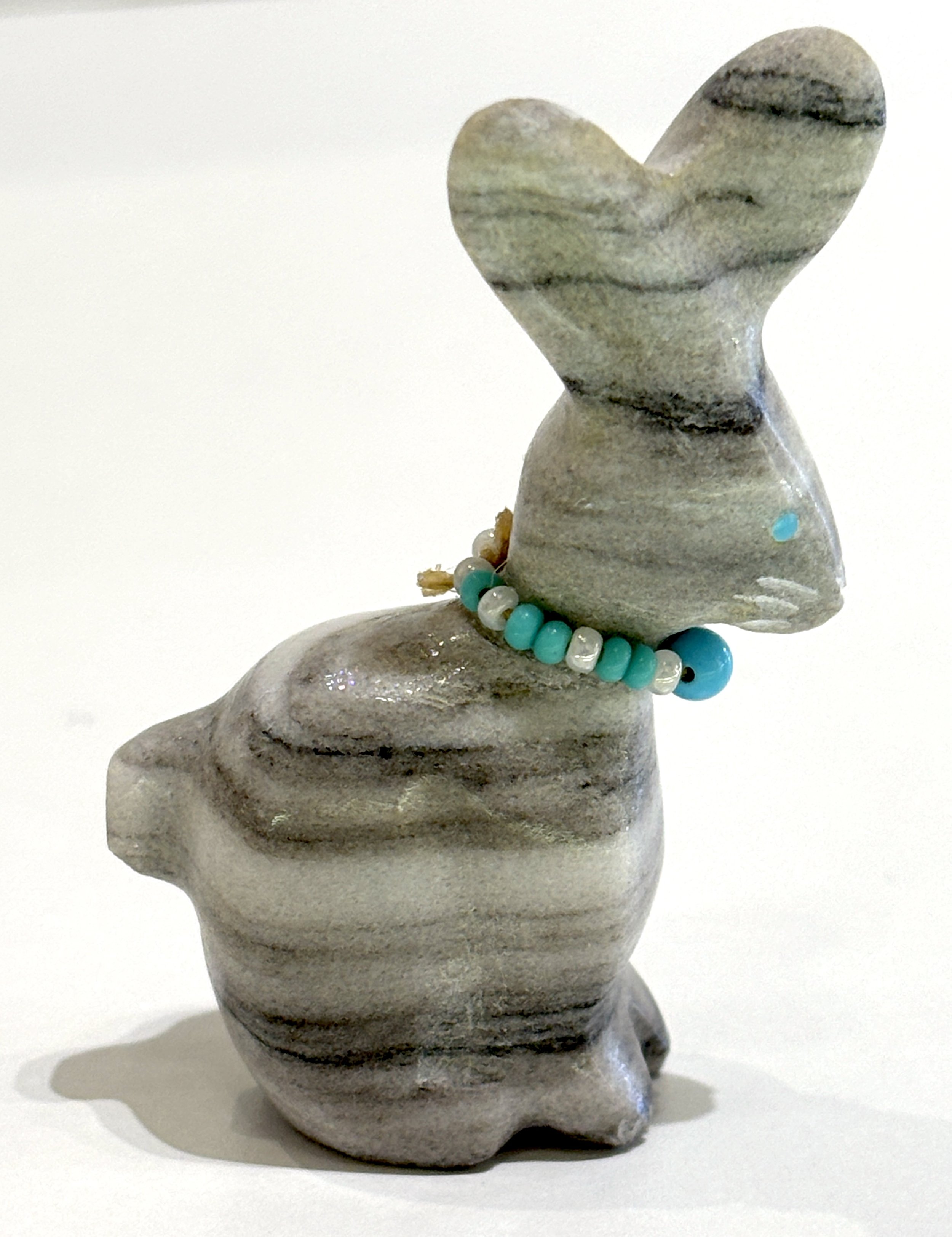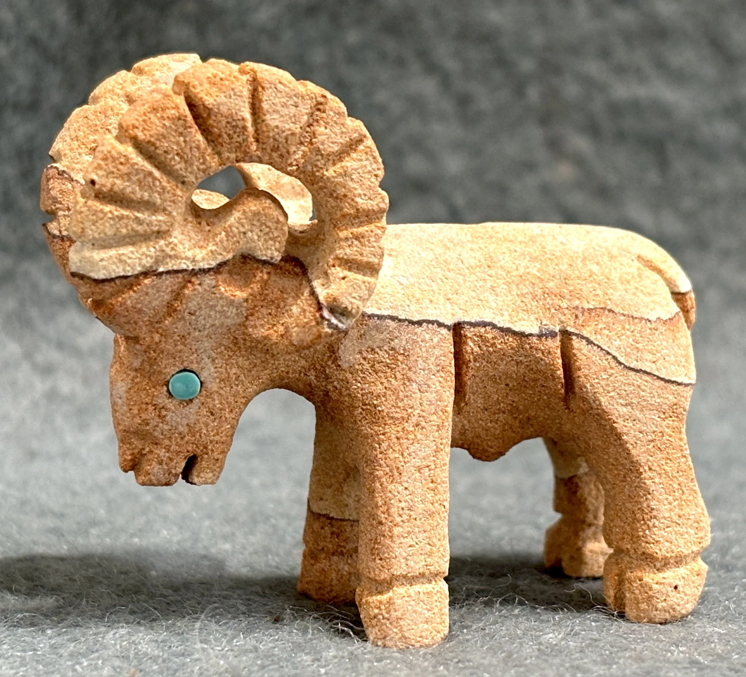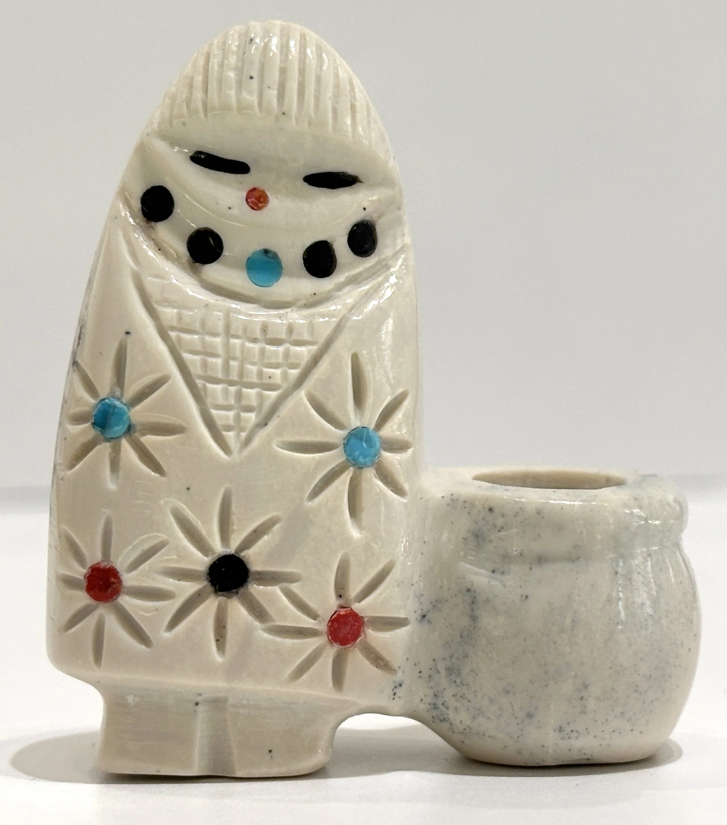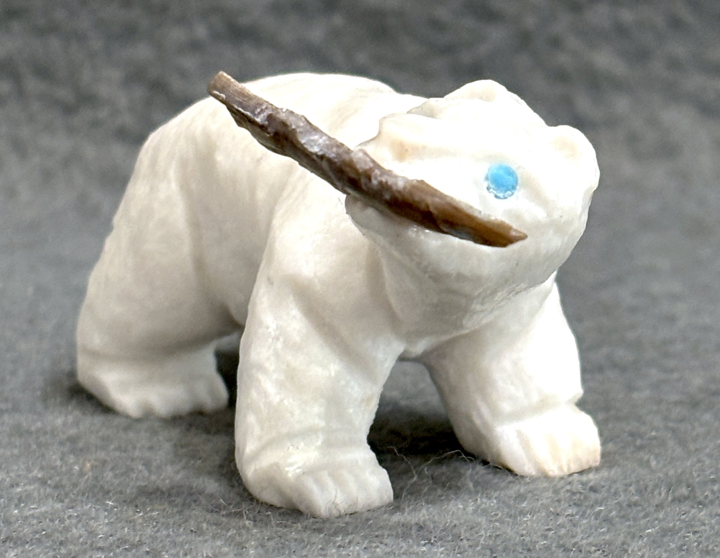 A Zunistone figure carved by Freddie Leekya, he is 4.25 inches high and $150. The fishing bear, complete with his sterling silver fishing rod, was made by Chris Gchachu. The bear is carved of serpentine, while the fish is a piece of shell. Just under 2.5 inches high and is $250.