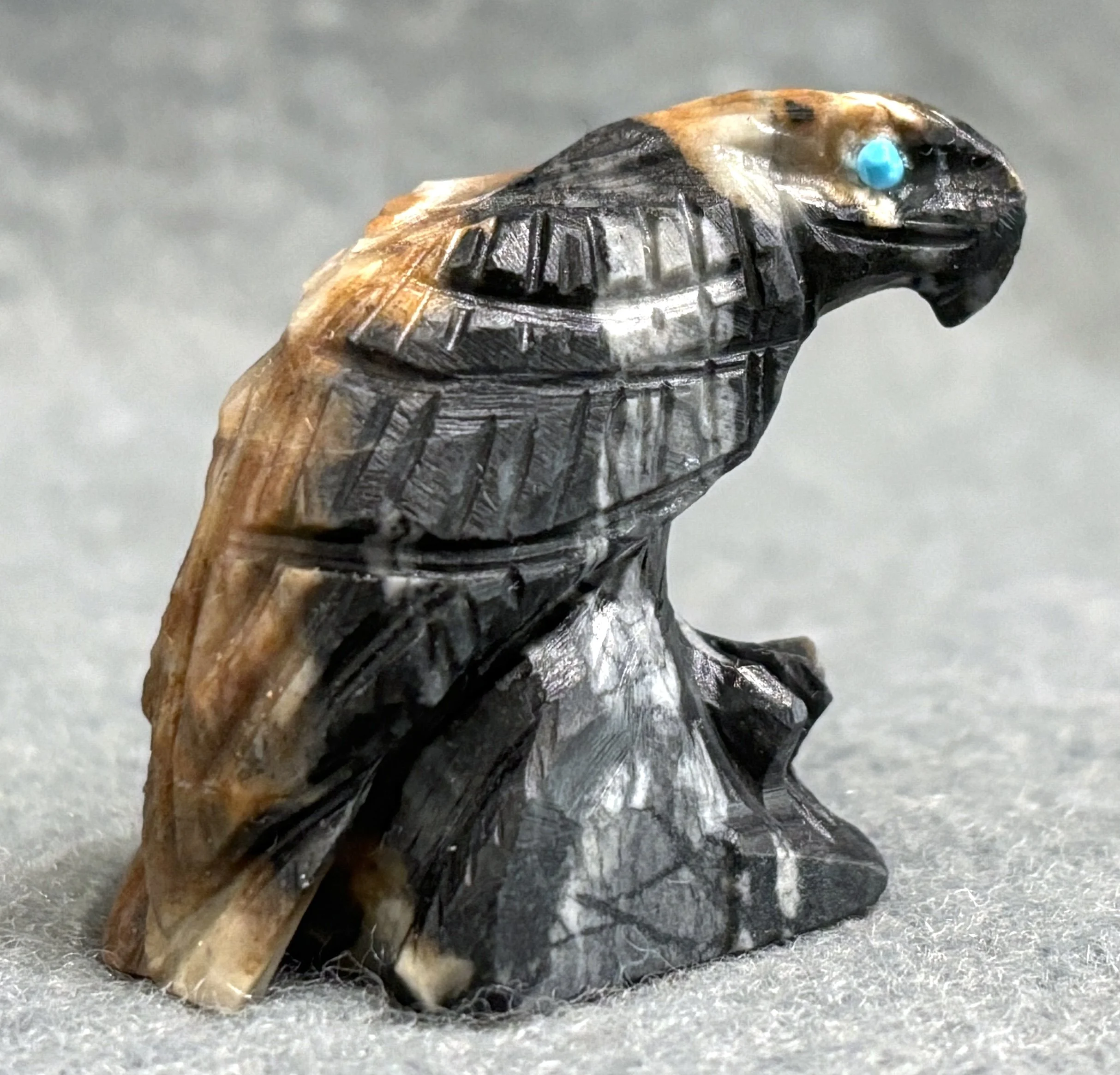 By Fabian Tsethlikai, a Quail covey is carved from picture jasper and is 2 1/8 inches long. $90.