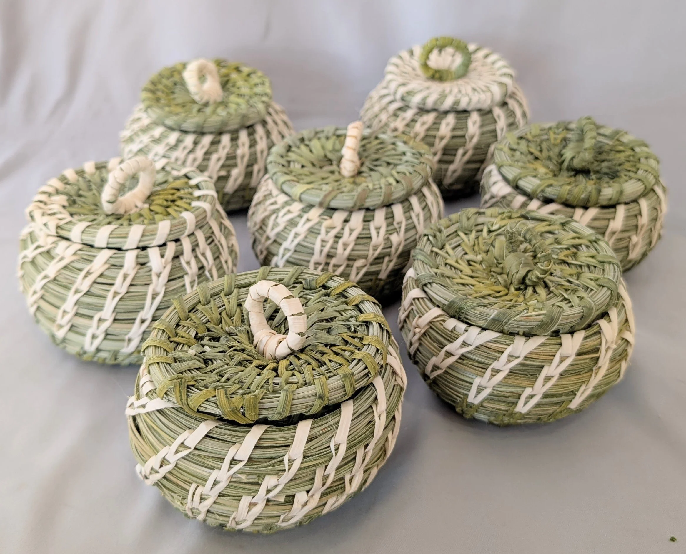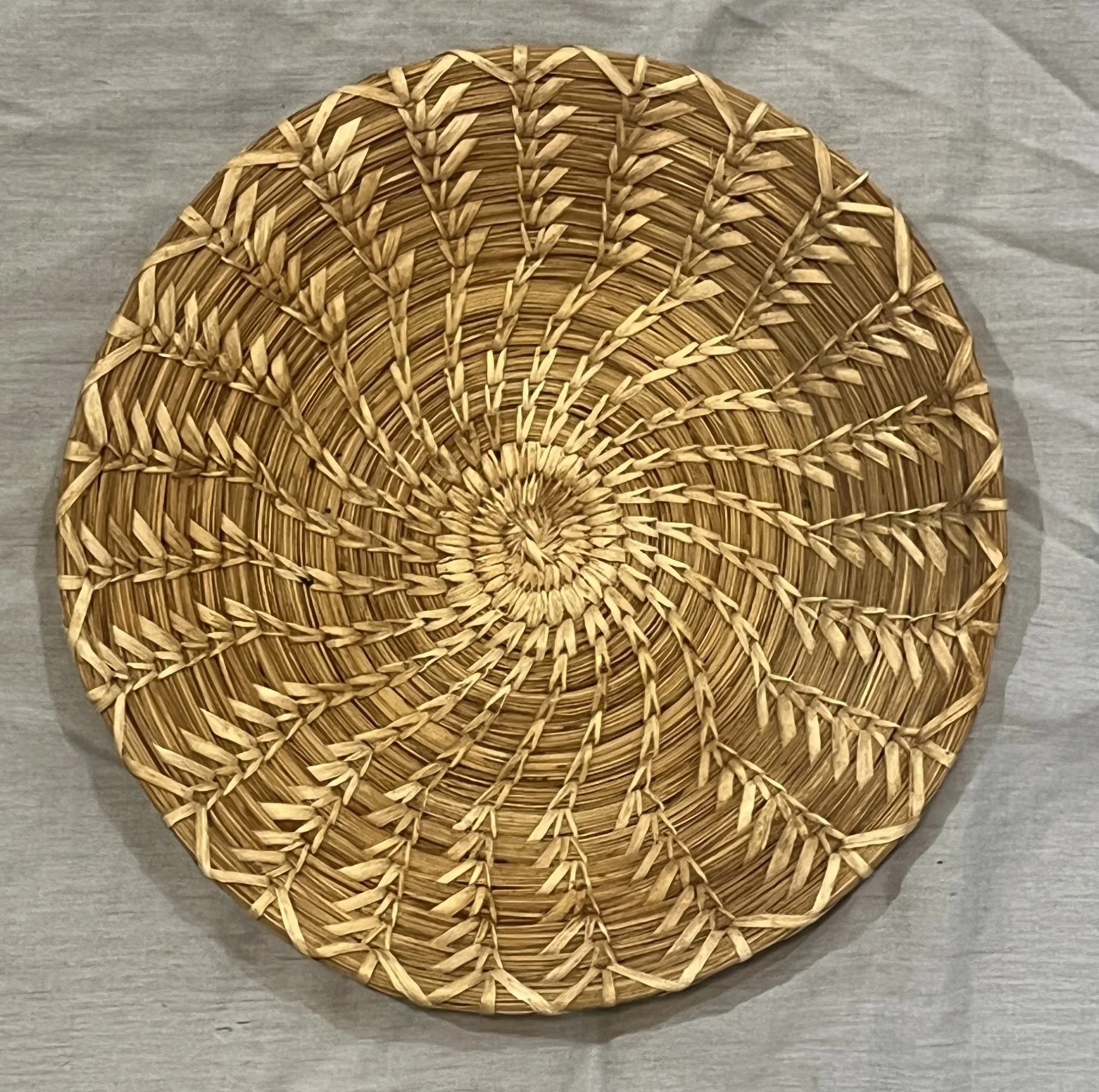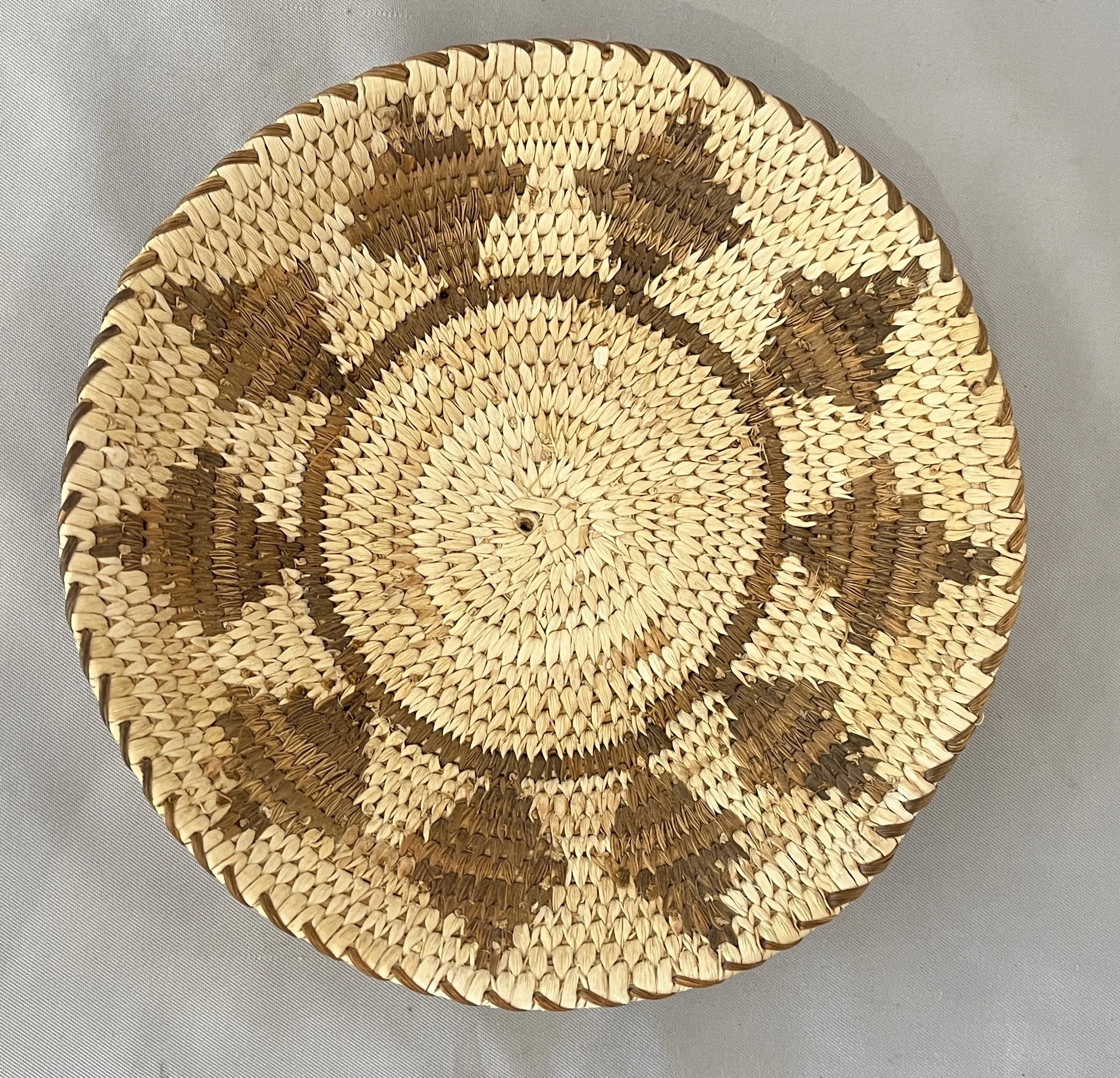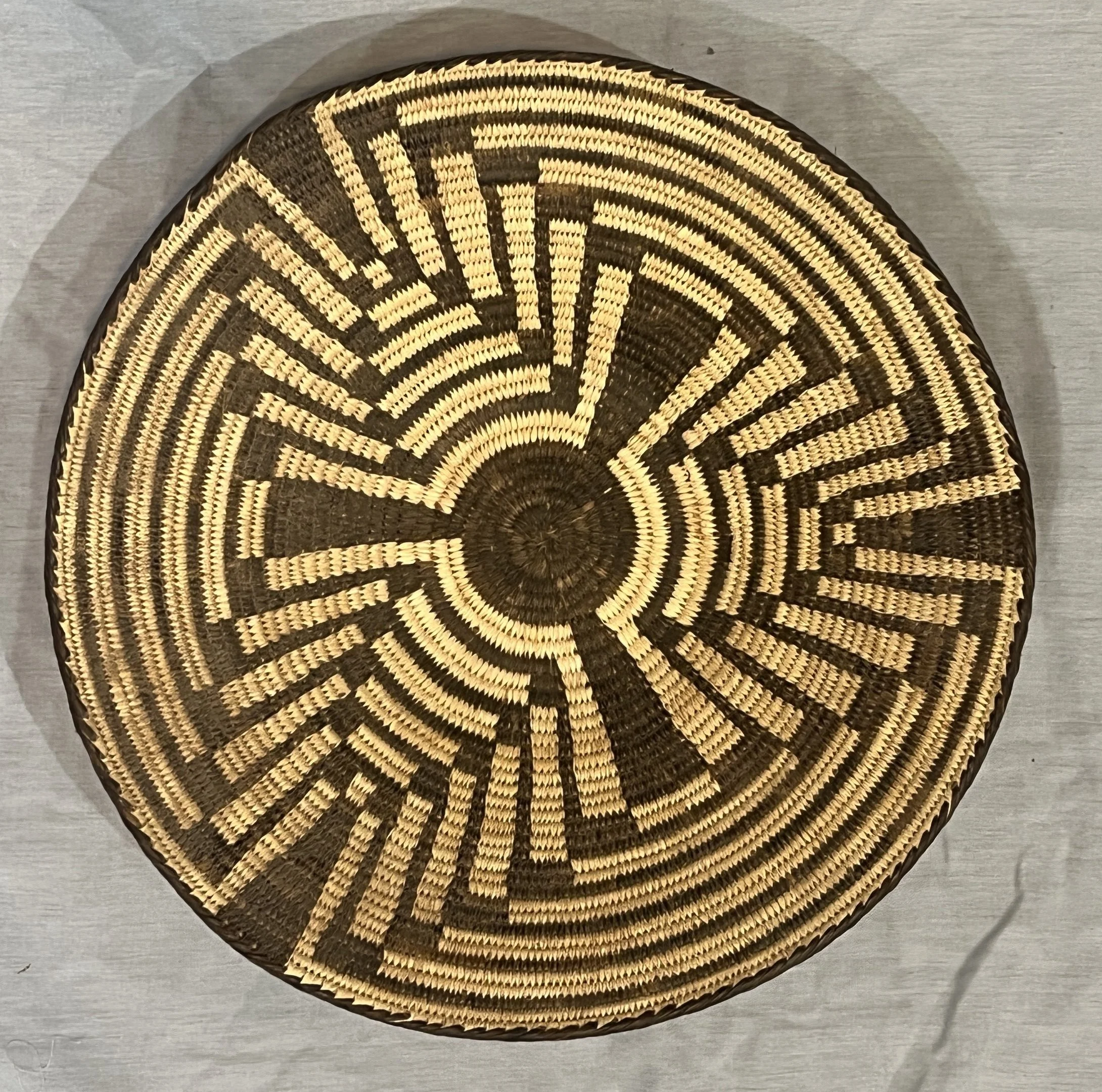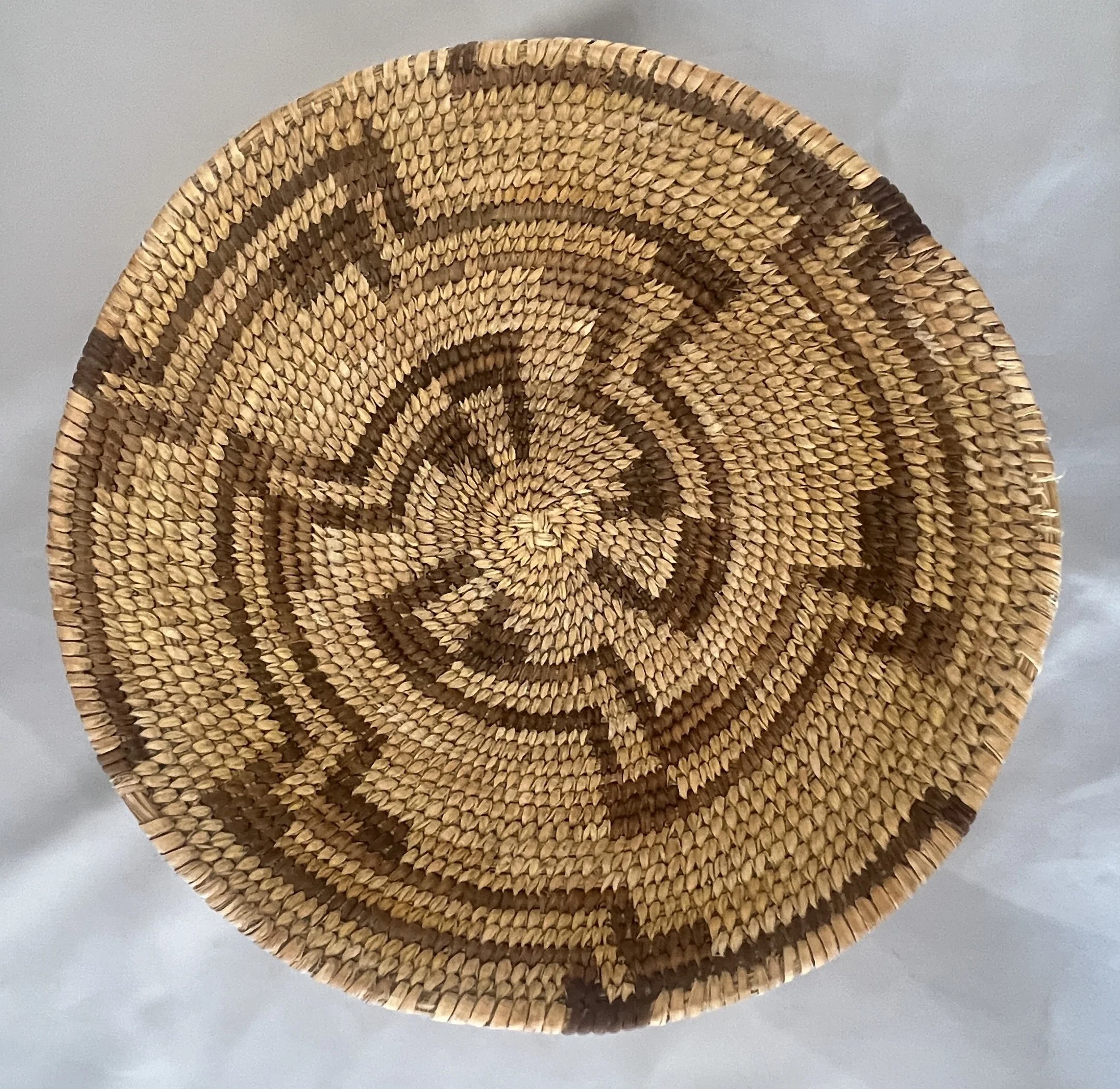 A finely woven maze basket by Doris José. 6 5/8 by .75 inches. $350. This unusual basket was woven by Francis Stevens. 7.75 inches and $150. This finely woven small bird basket was woven over 50 years ago. 5.5 inches and $110. By Francis Stevens, a shallow basket depicting flying birds. 7.5 inches and $125. (ALL IN TUCSON)