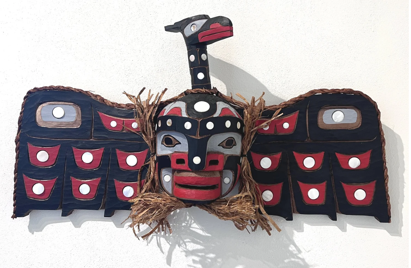 A show-stopping raven mask by Tim Alfred. Fully 6 feet long with an articulated beak and a bear face carved on the under side. $19,500. (Tucson)