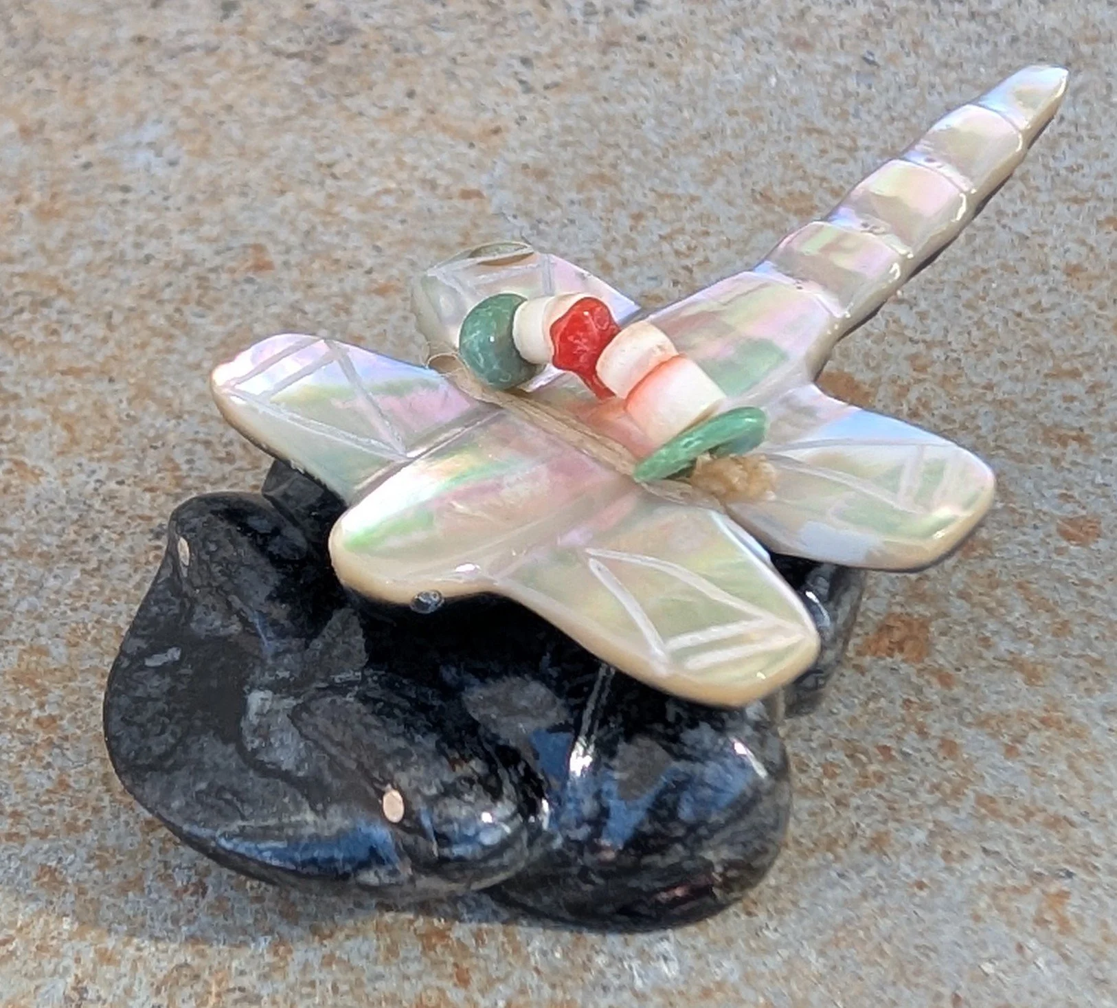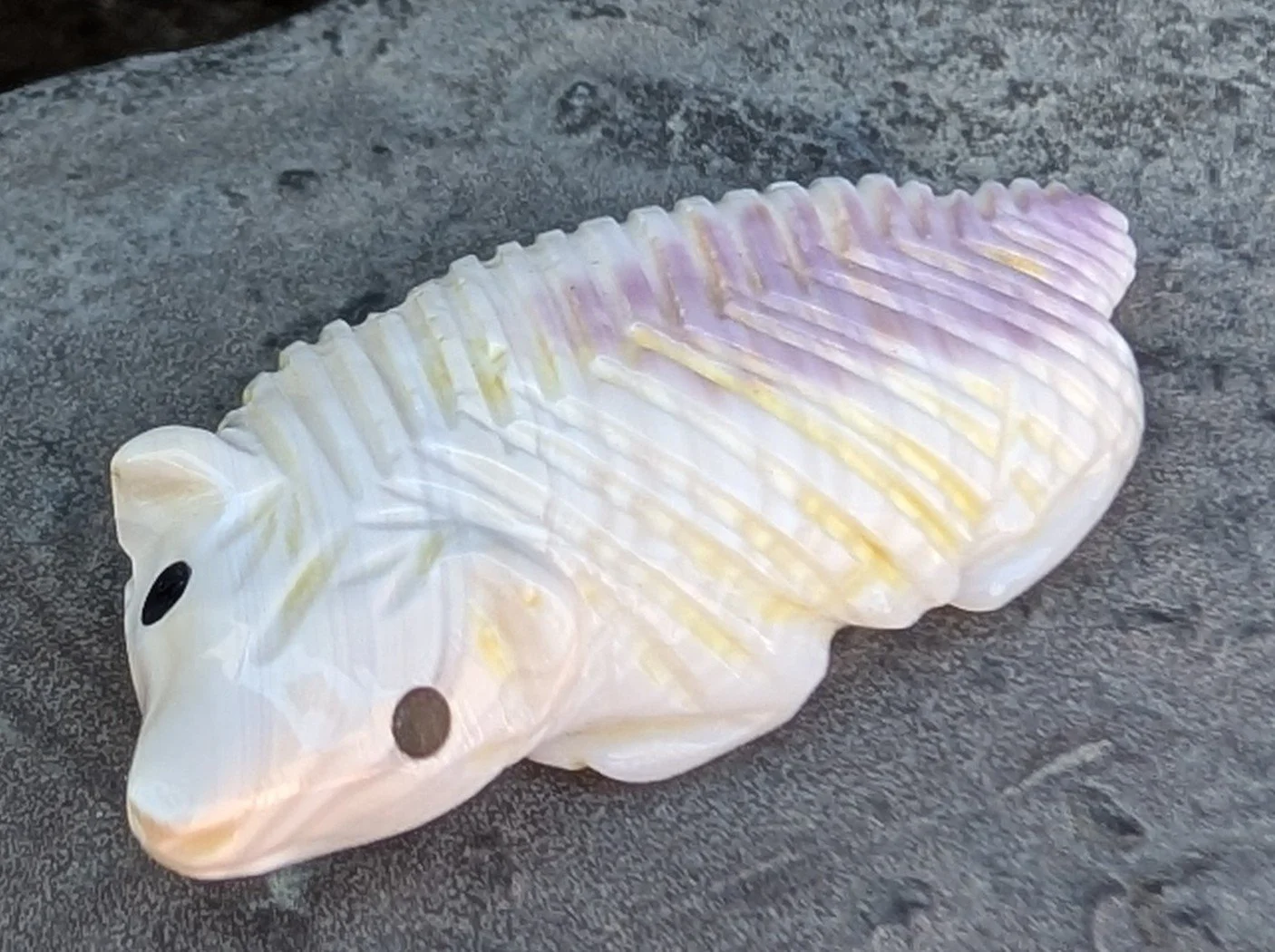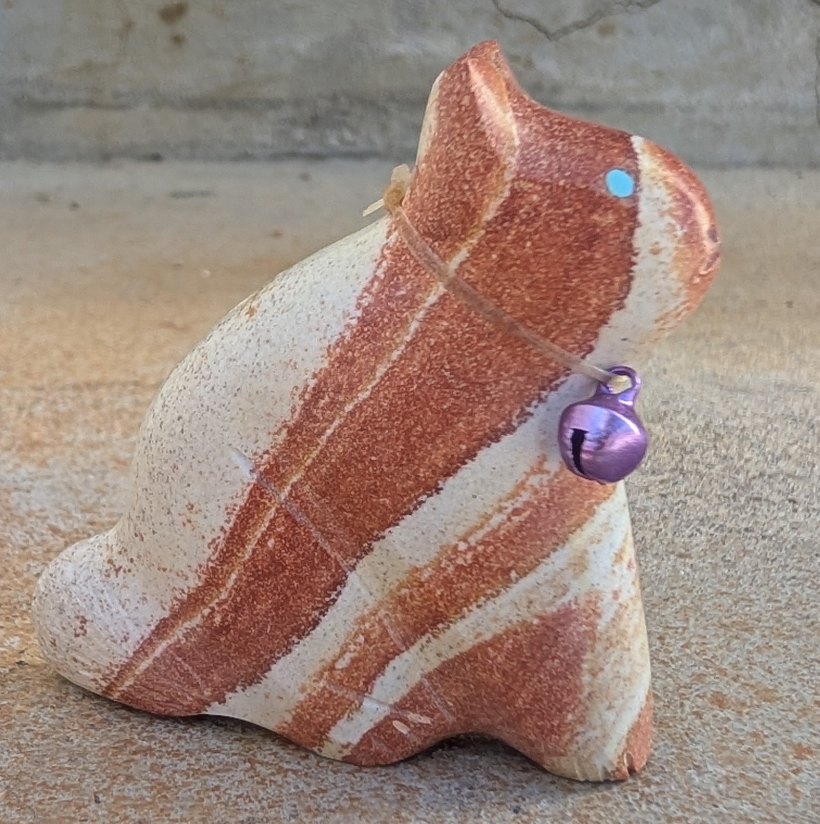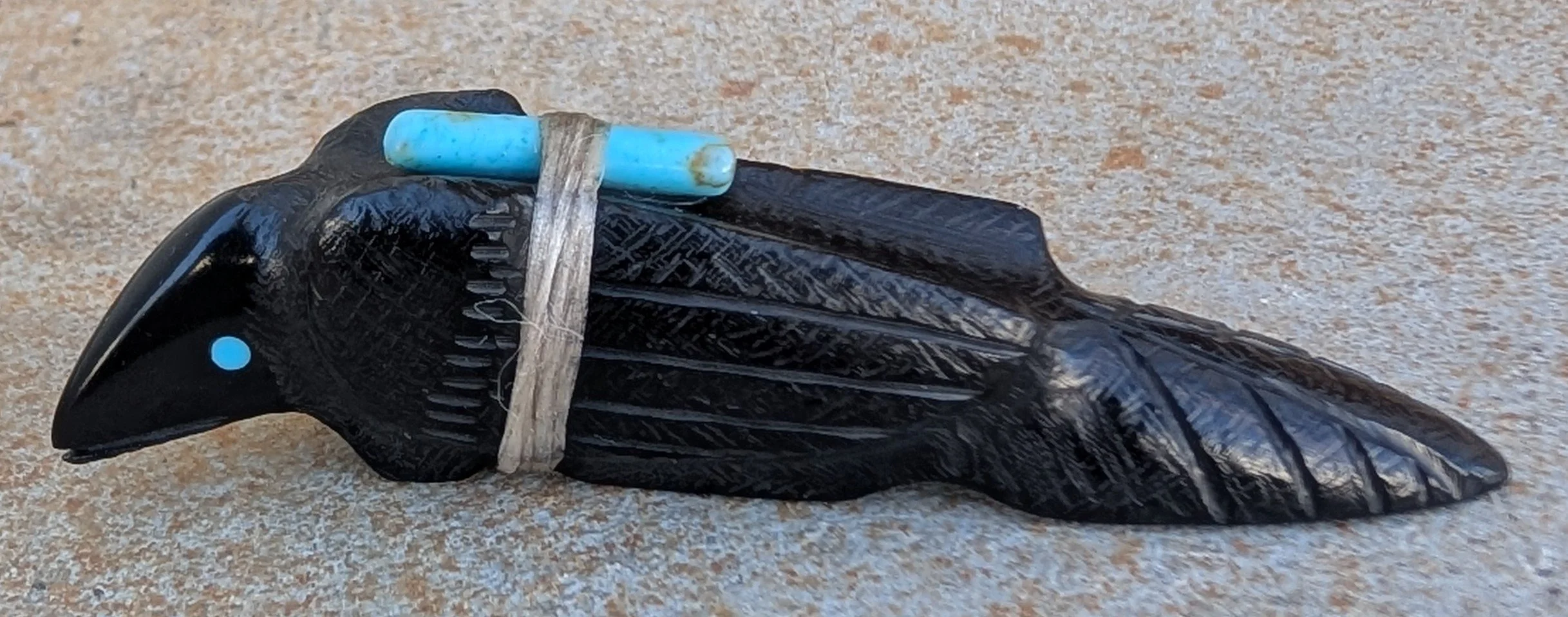 Claudia Peina made this antler corn maiden. 2.5 inches tall and $260. The elk antler Pueblo maidens were carved by Troy Sice. 3 inches tall and $375. The bear at right, who is clearly ready for a night on the town, was carved of an unusual piece of sodalite. Eddington Hannaweeke made good use of the pinkish inclusion in the stone. 2 1/8 inch tall and $125.