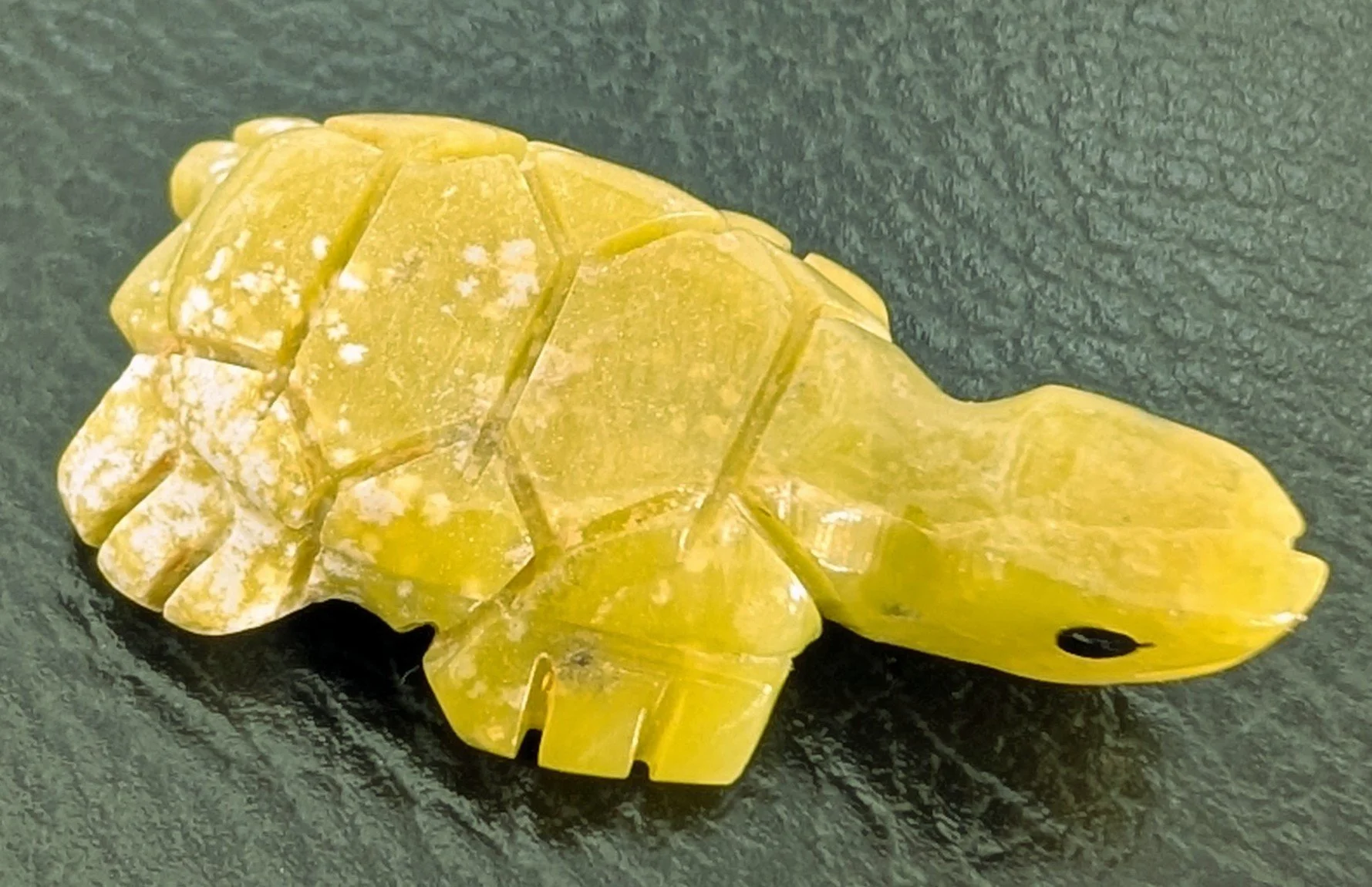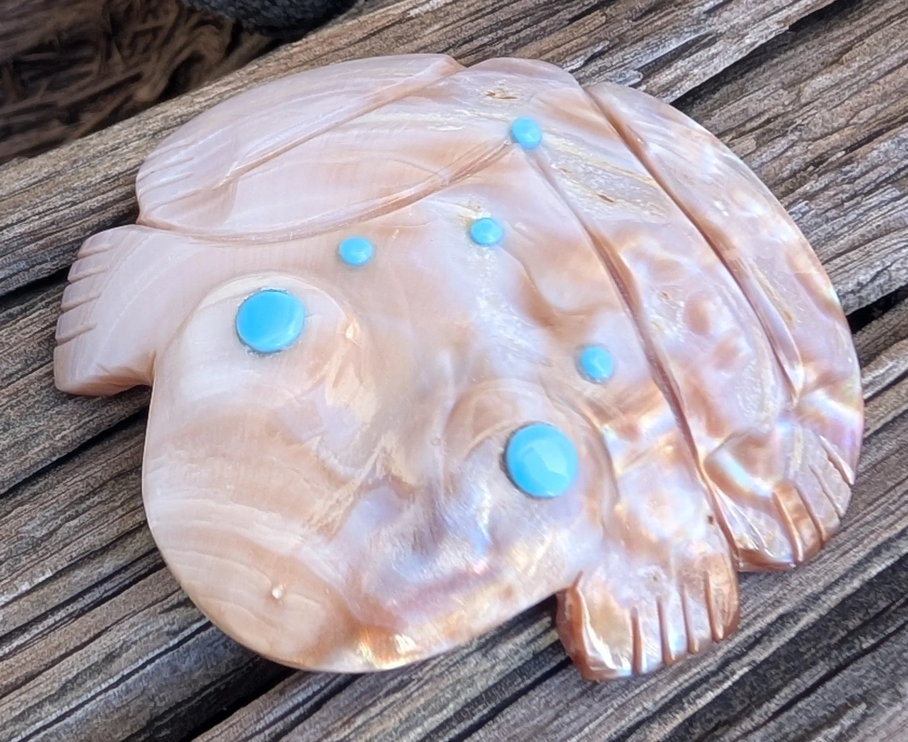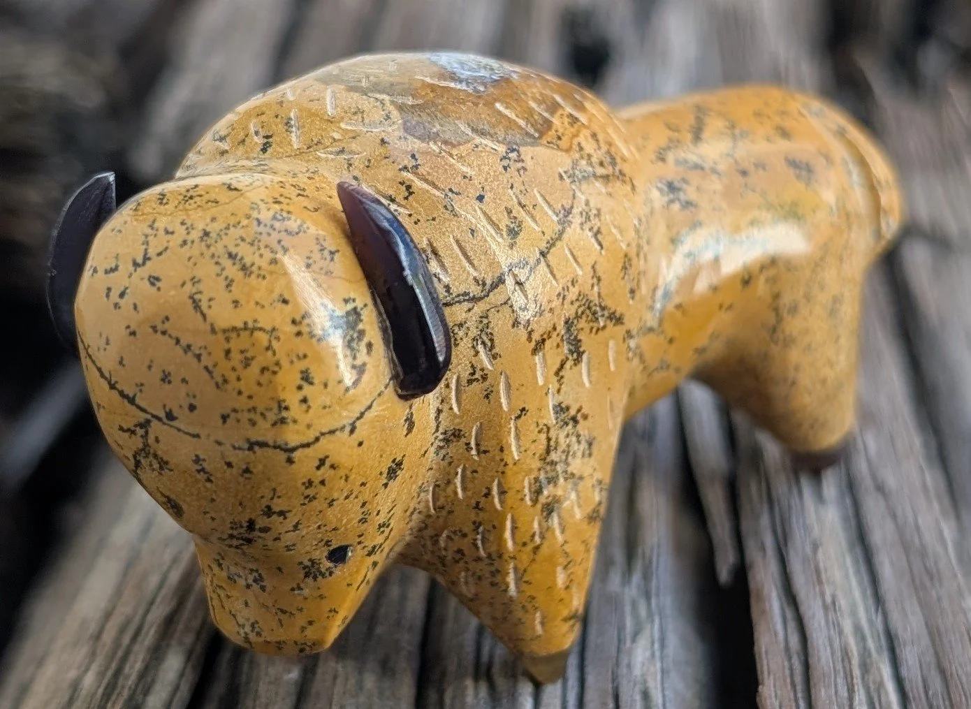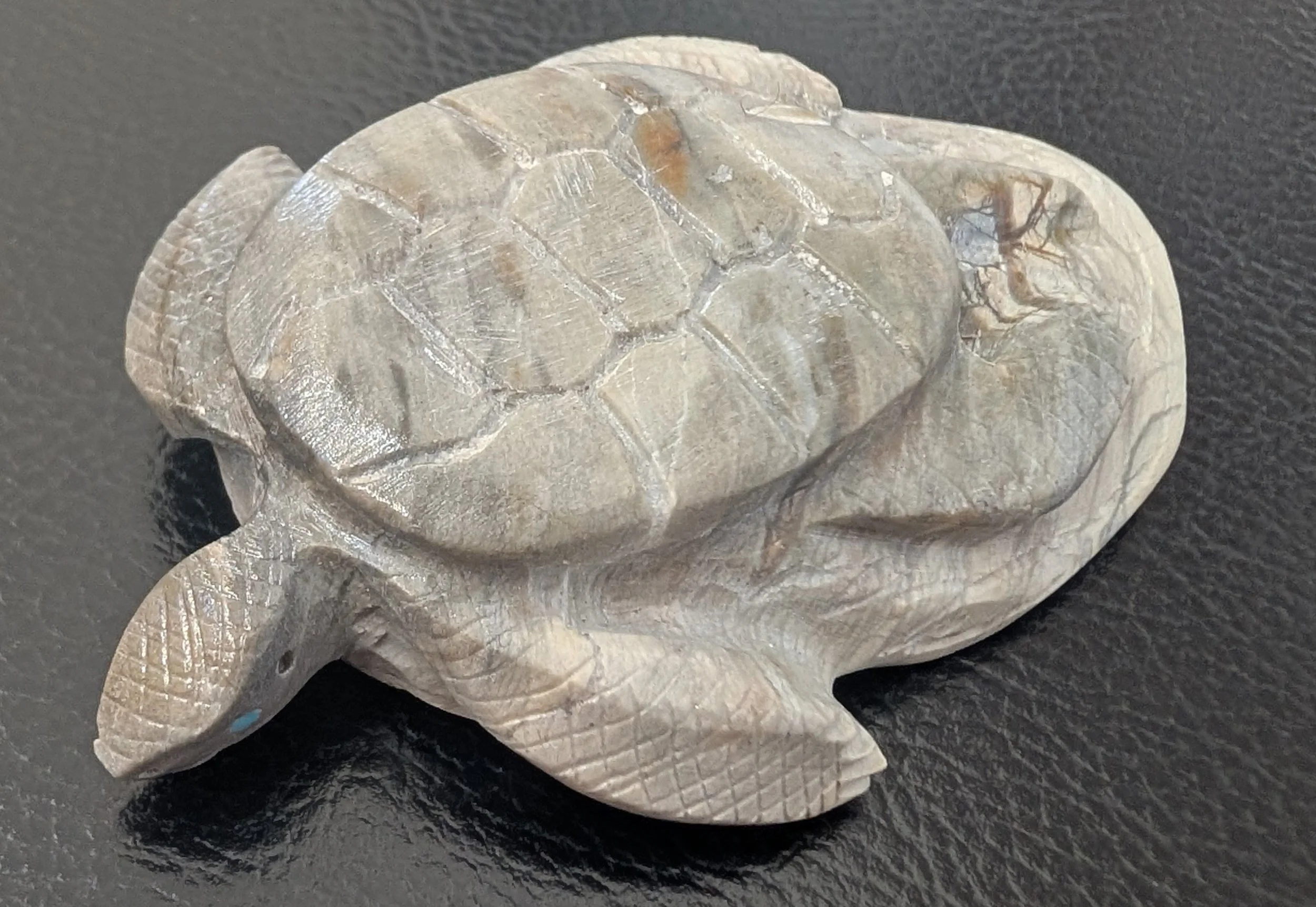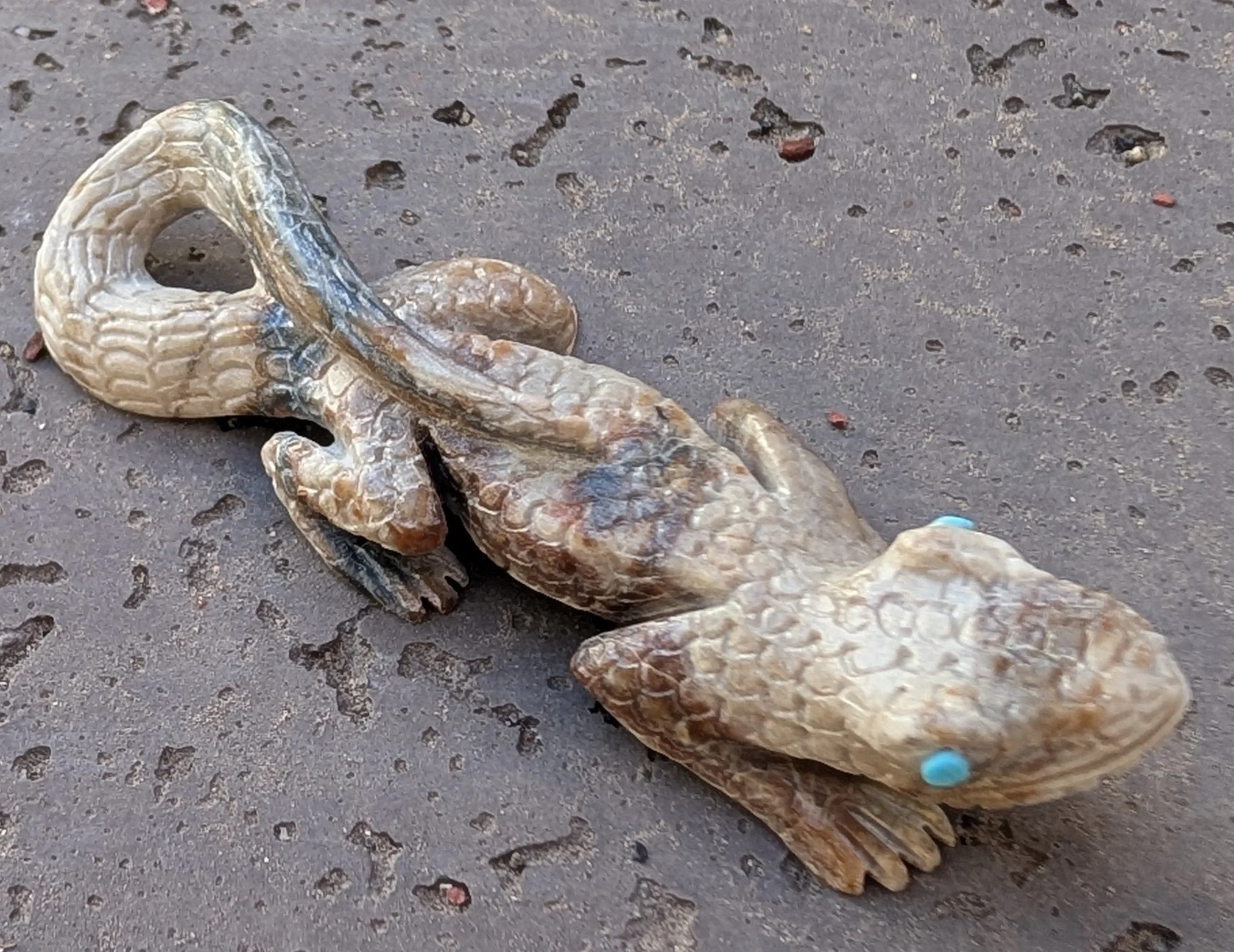 Claudia Peina made this antler corn maiden. 2.5 inches tall and $260. The elk antler Pueblo maidens were carved by Troy Sice. 3 inches tall and $375. The bear at right, who is clearly ready for a night on the town, was carved of an unusual piece of sodalite. Eddington Hannaweeke made good use of the pinkish inclusion in the stone. 2 1/8 inch tall and $125.