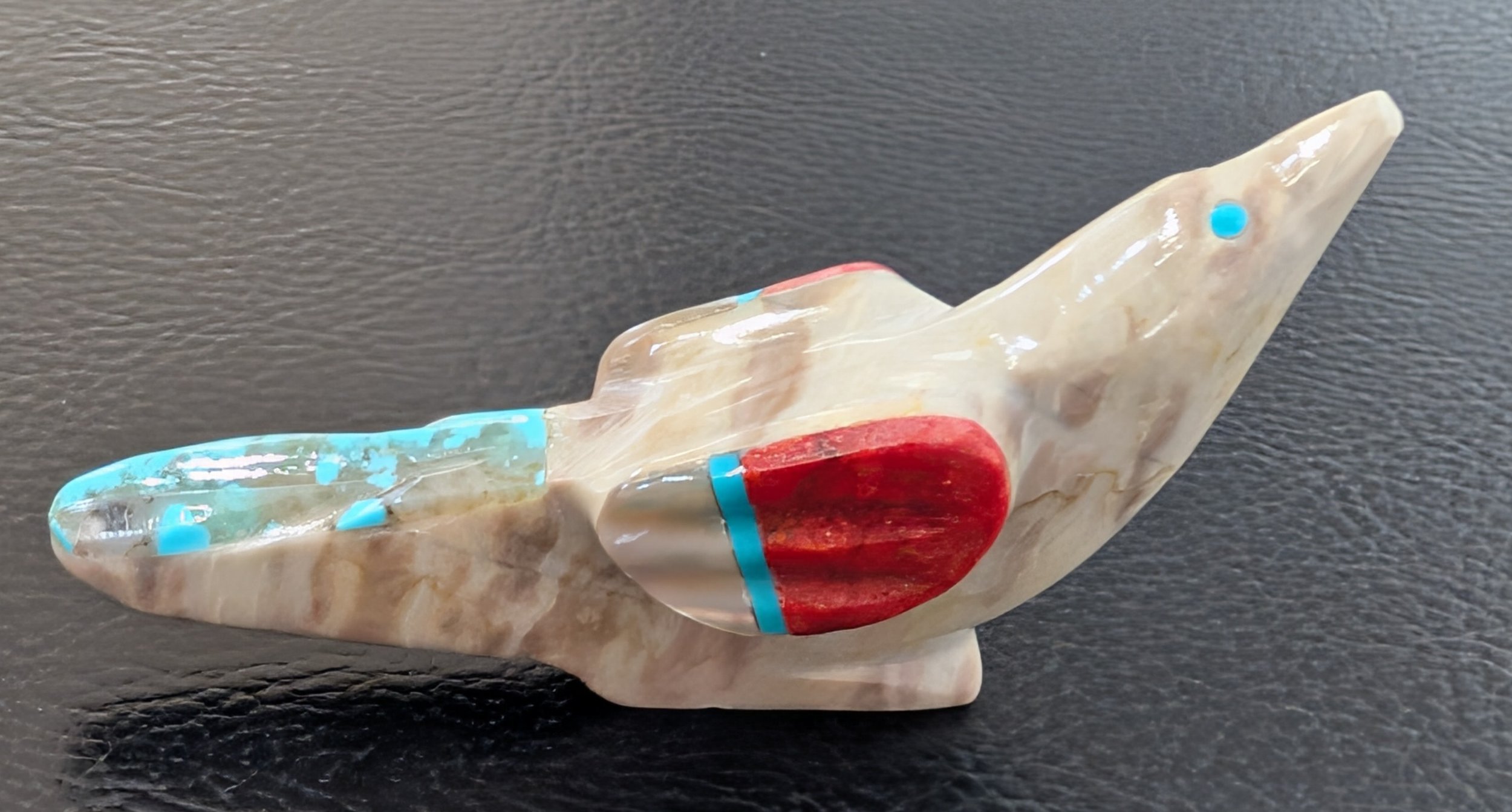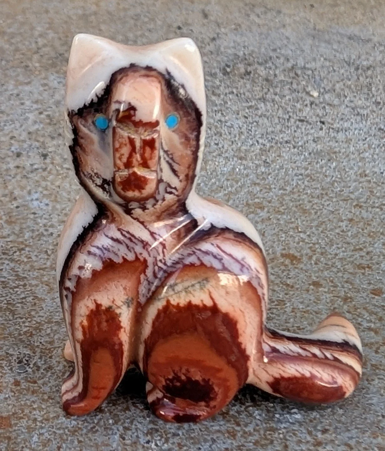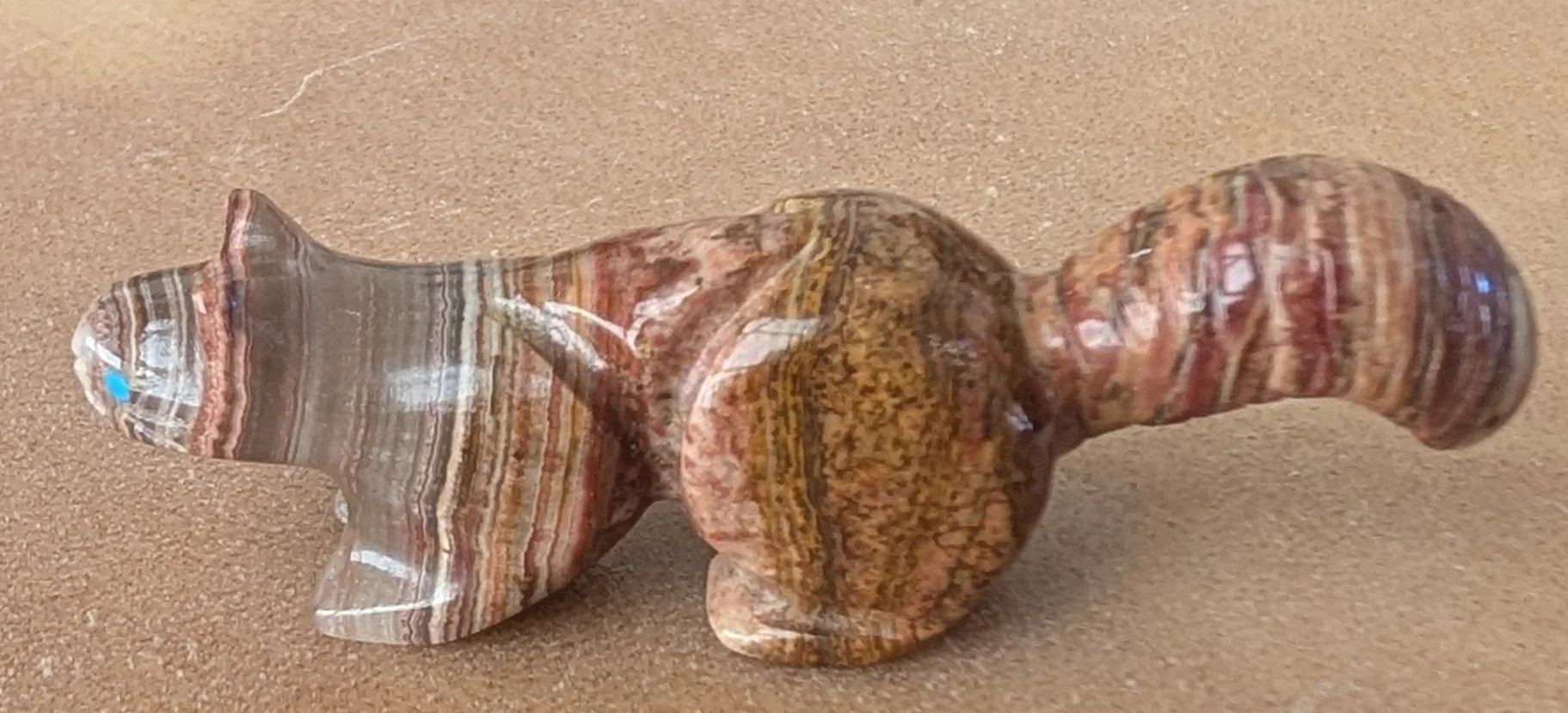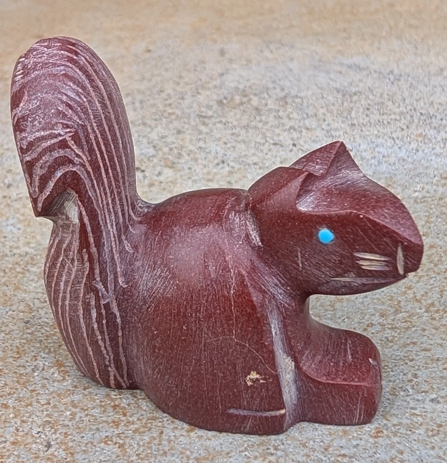 A onyx squirrel is by Rosella and Loubert Soseah. 2.5 inches and $60. This alabaster bird has inlayed wings and tail, by Delvin Leekya. 3 inches and $45. A Pueblo maiden carved of jet, with a mosaic back, by Chad Quandelacy. 2/5 inches tall and $300.