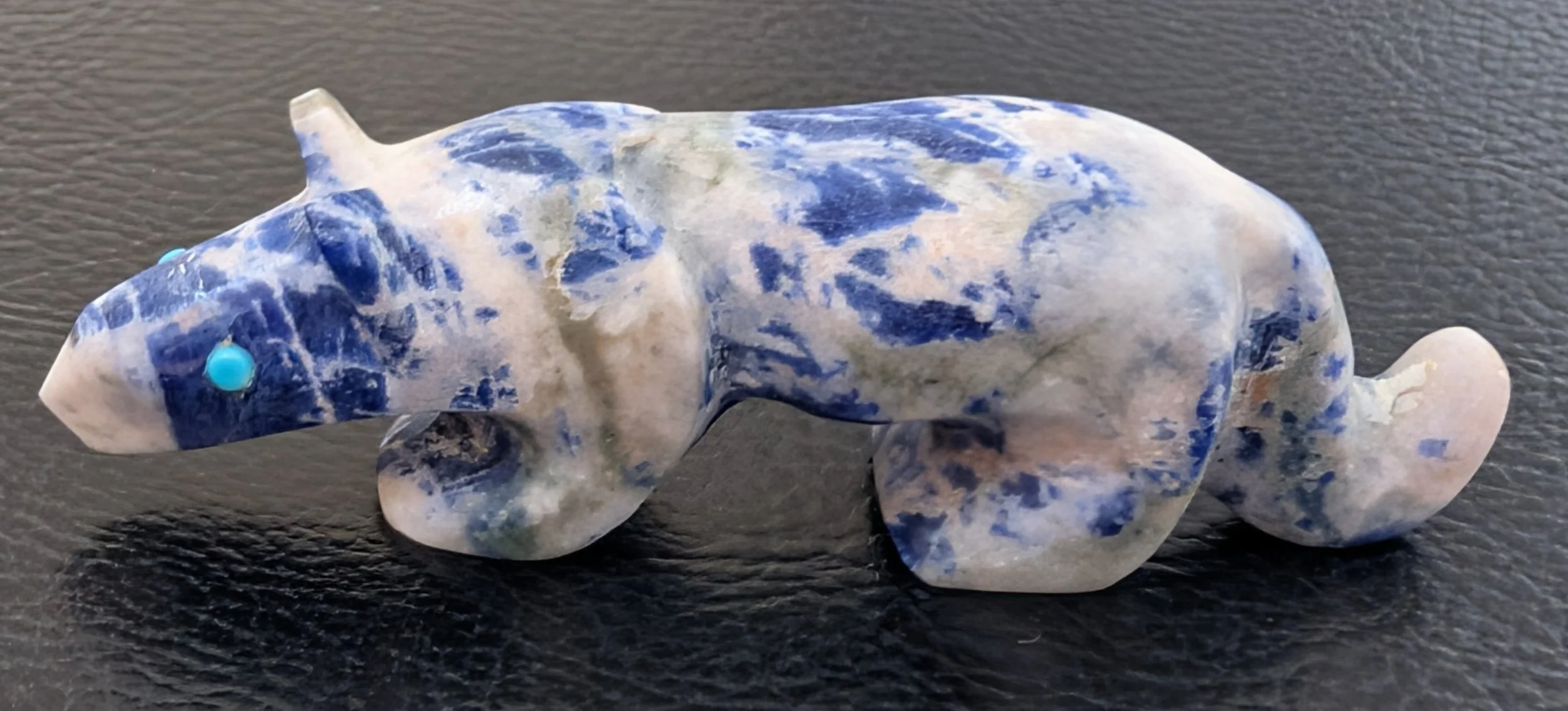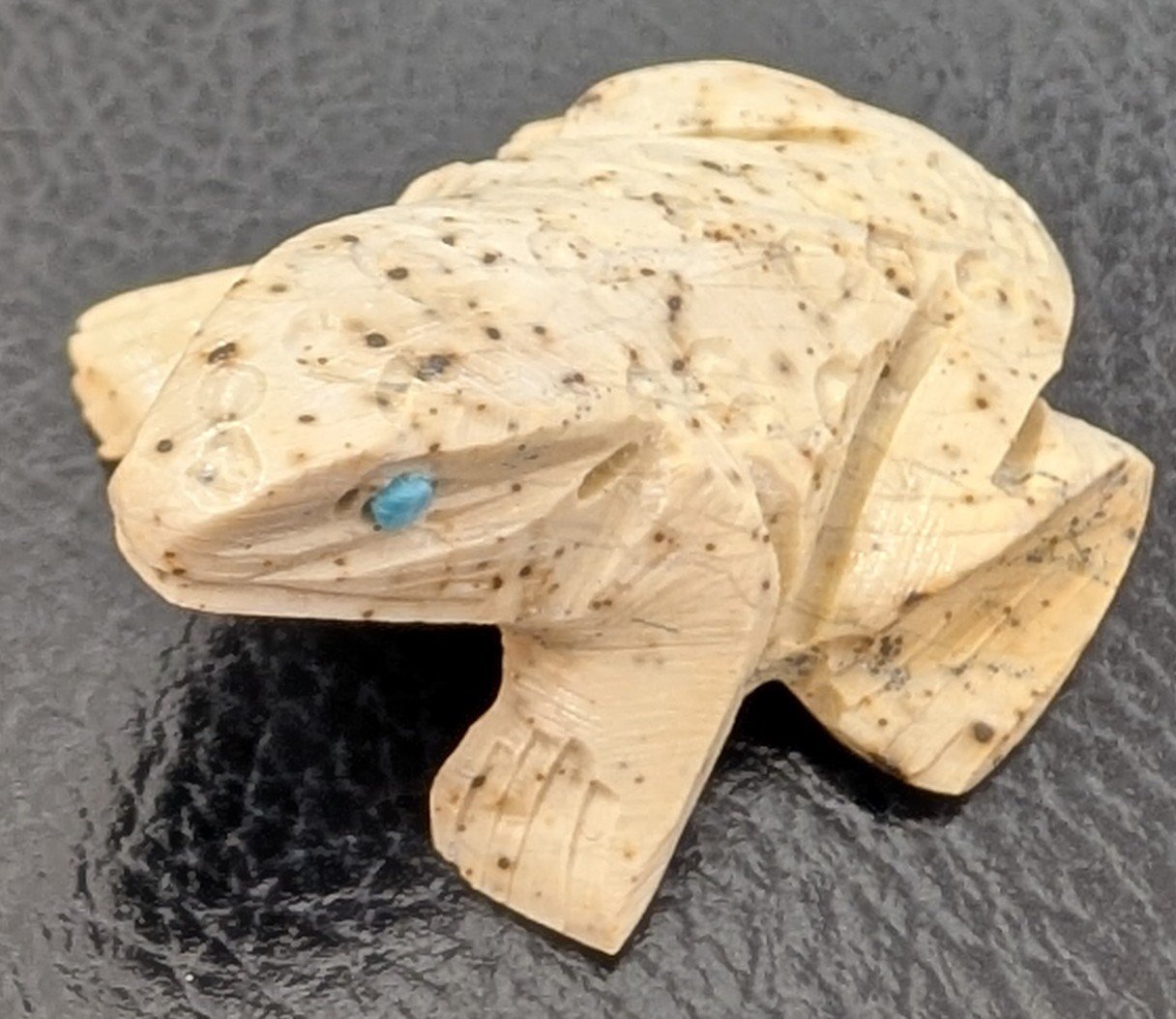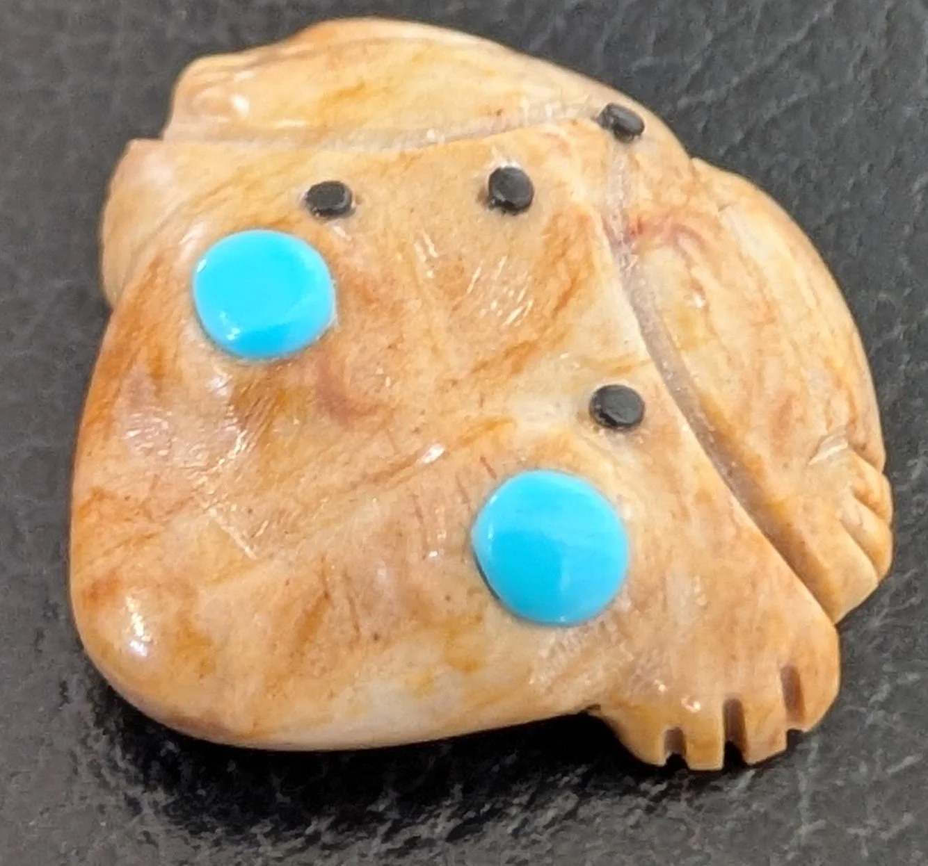 A onyx squirrel is by Rosella and Loubert Soseah. 2.5 inches and $60. This alabaster bird has inlayed wings and tail, by Delvin Leekya. 3 inches and $45. A Pueblo maiden carved of jet, with a mosaic back, by Chad Quandelacy. 2/5 inches tall and $300.
