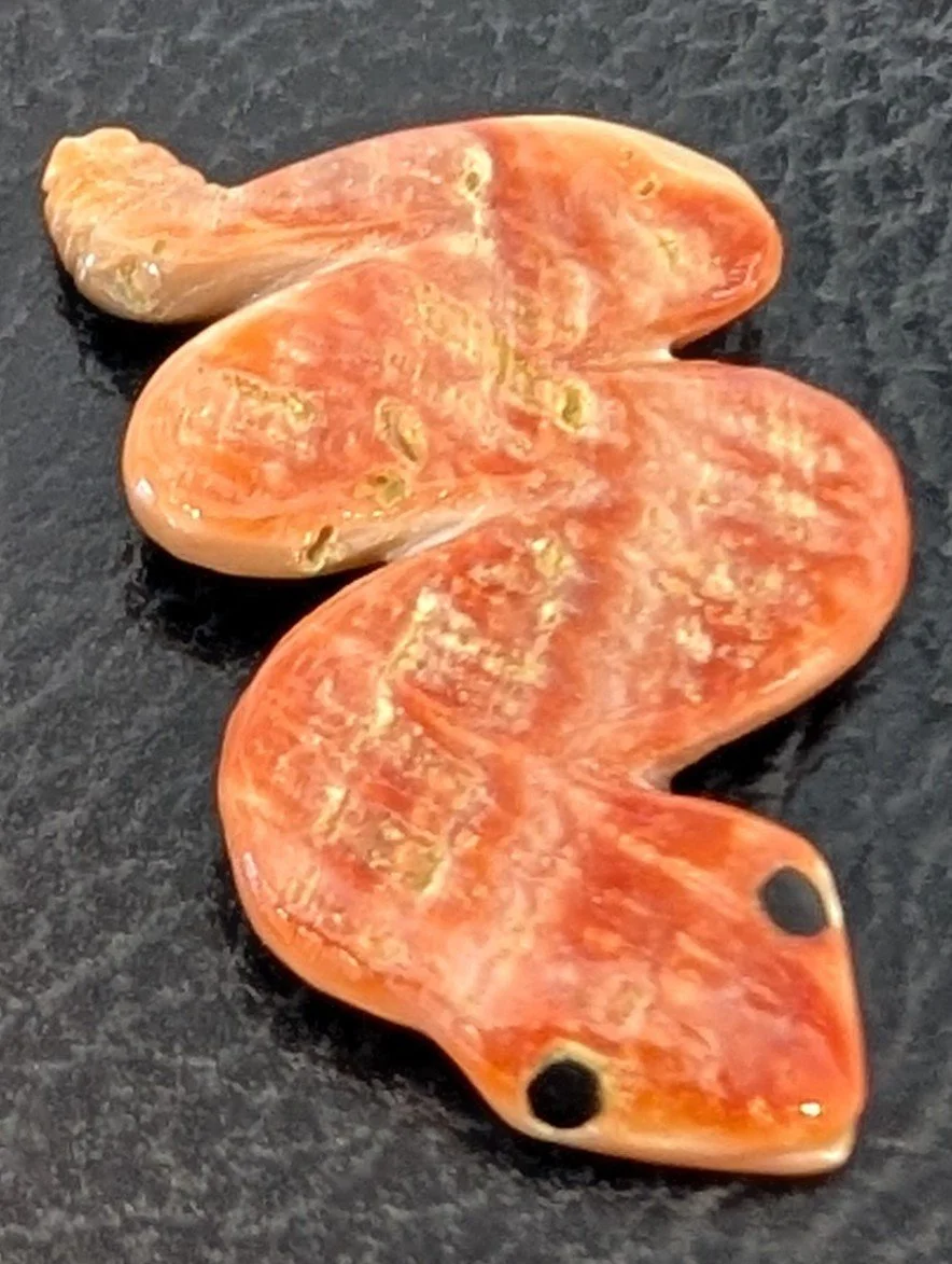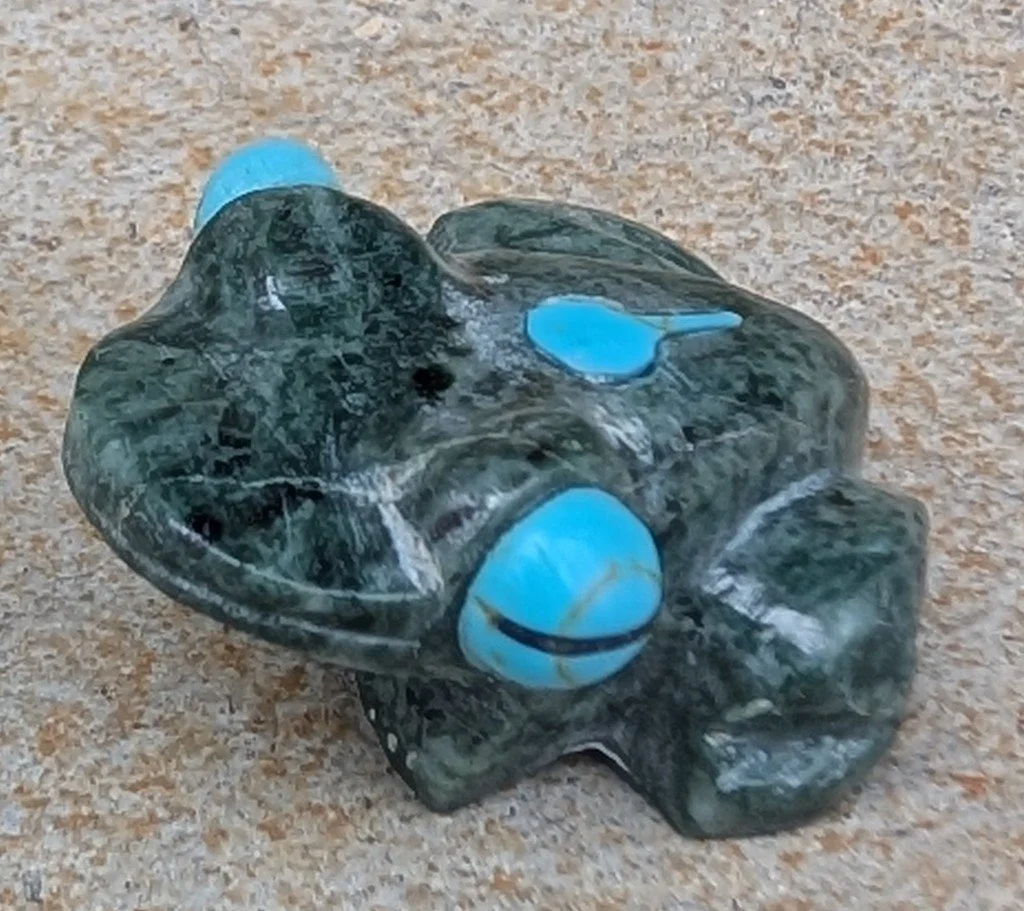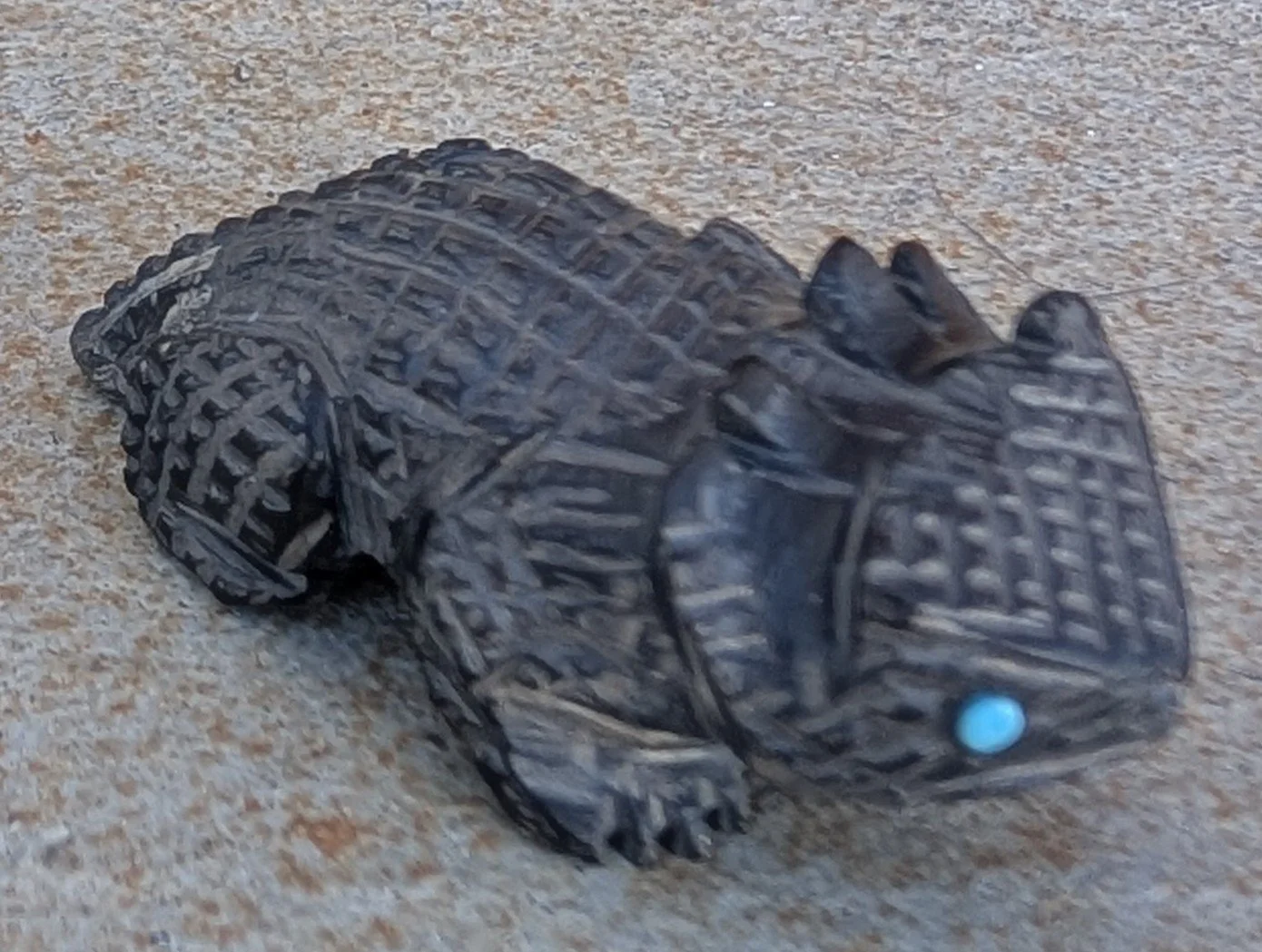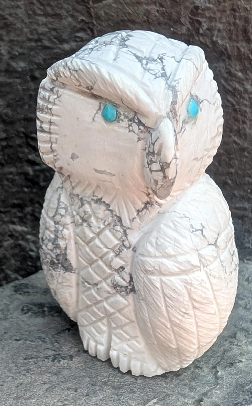 A onyx squirrel is by Rosella and Loubert Soseah. 2.5 inches and $60. This alabaster bird has inlayed wings and tail, by Delvin Leekya. 3 inches and $45. A Pueblo maiden carved of jet, with a mosaic back, by Chad Quandelacy. 2/5 inches tall and $300.