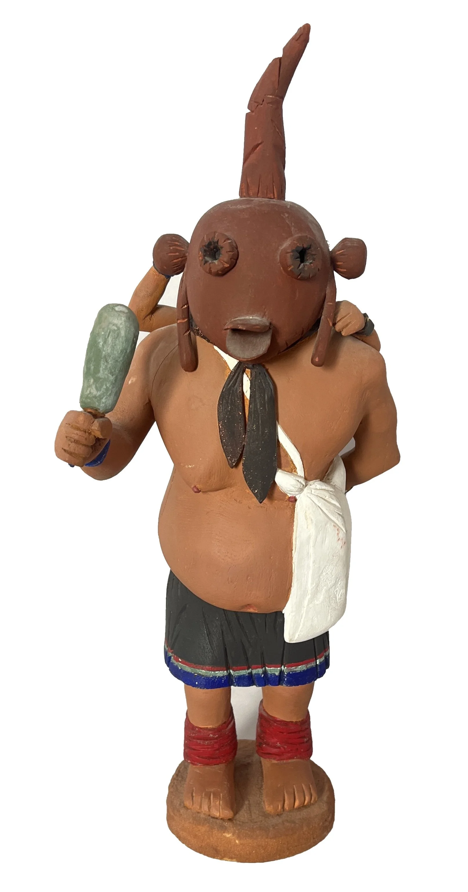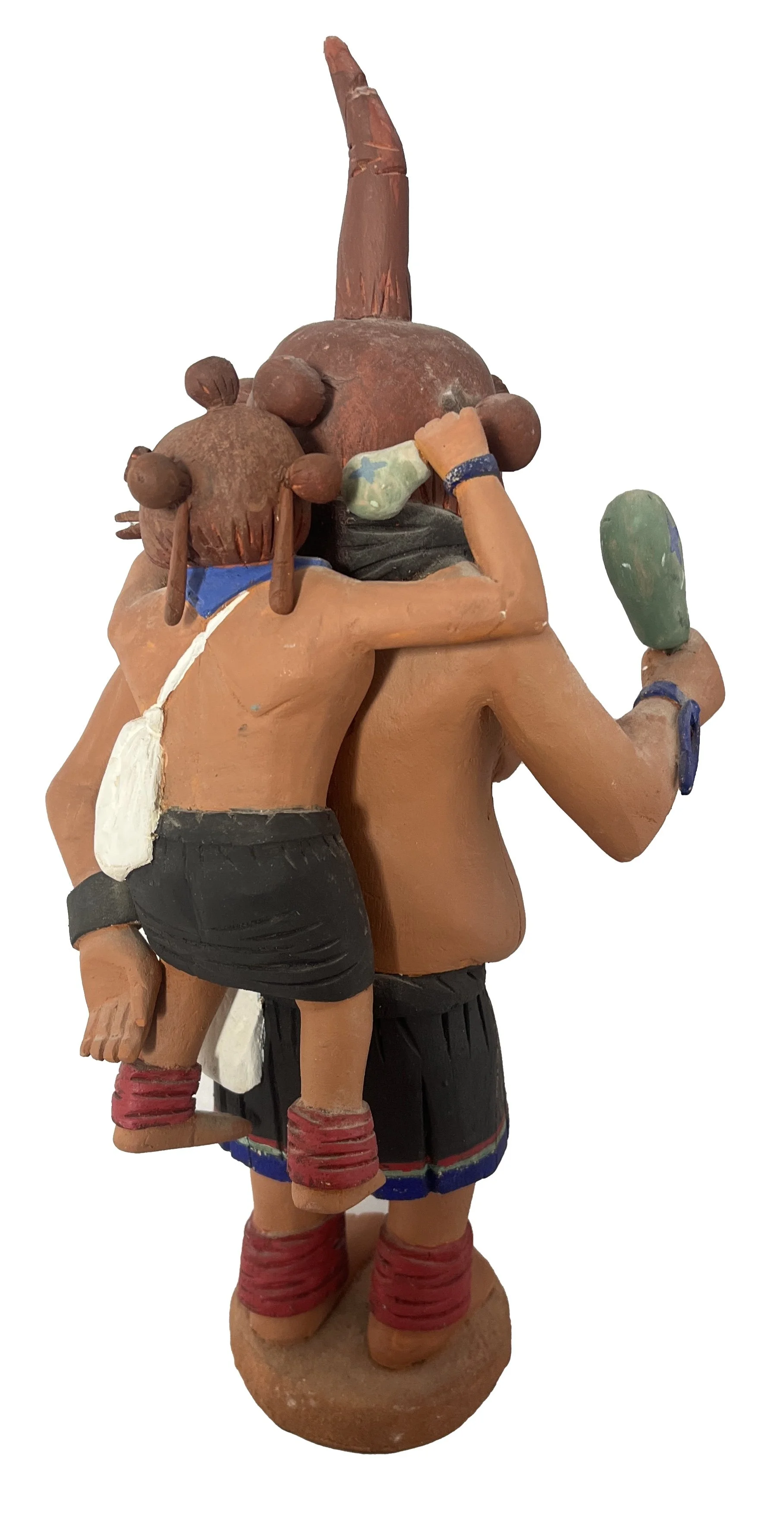Carved 50+ years ago, this piggyback Koyemsi carving measures 15.5 inches tall. Note: it has a vertical drying crack that was clearly there when it was carved. A mix of mineral paints and acrylic. $675. (TUCSON)