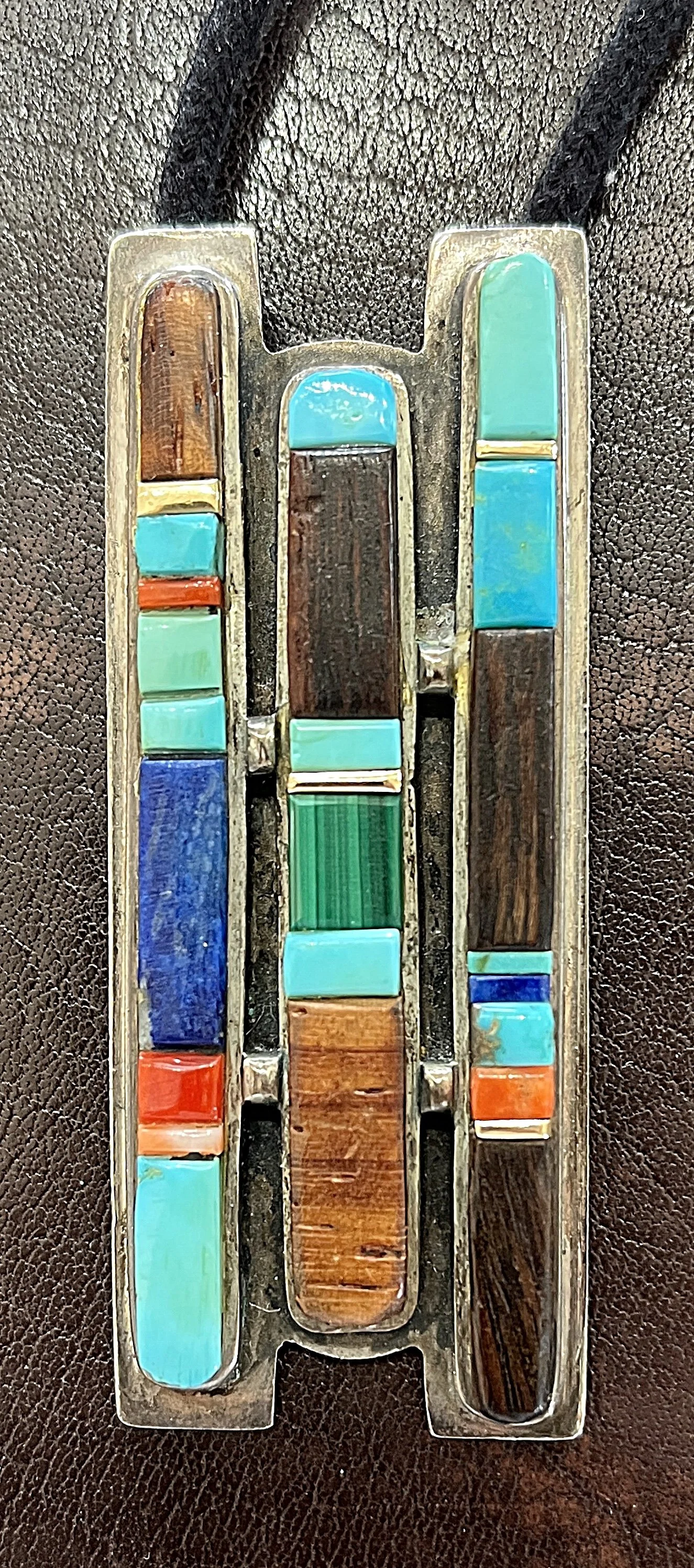 A beautiful pendant by Charles Loloma. This was made in the very late 1960s. Details in the Collector’s Gallery. (TUCSON)