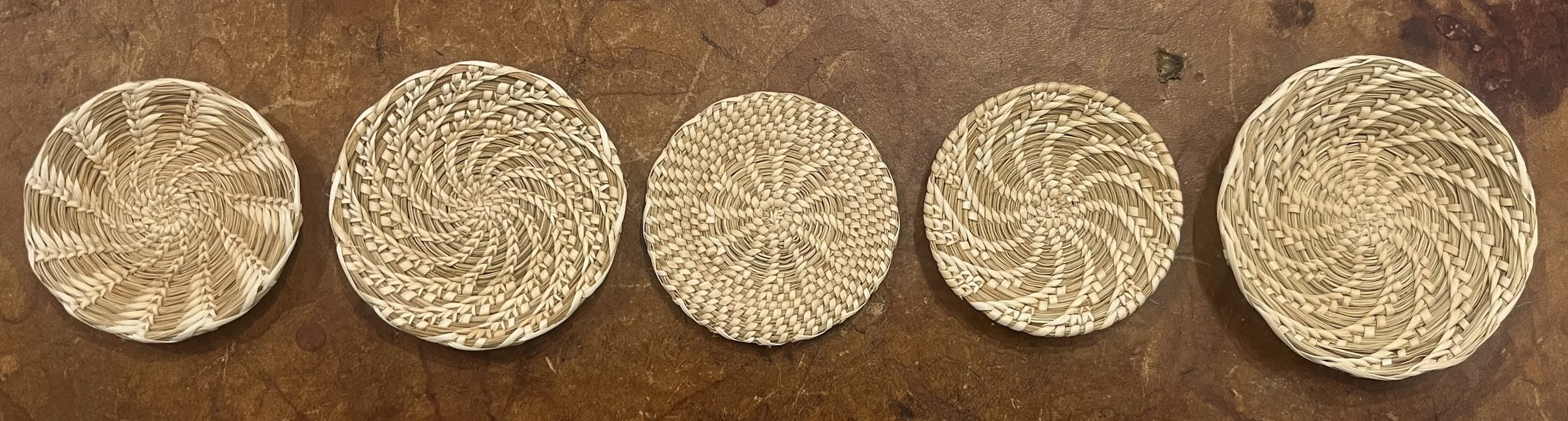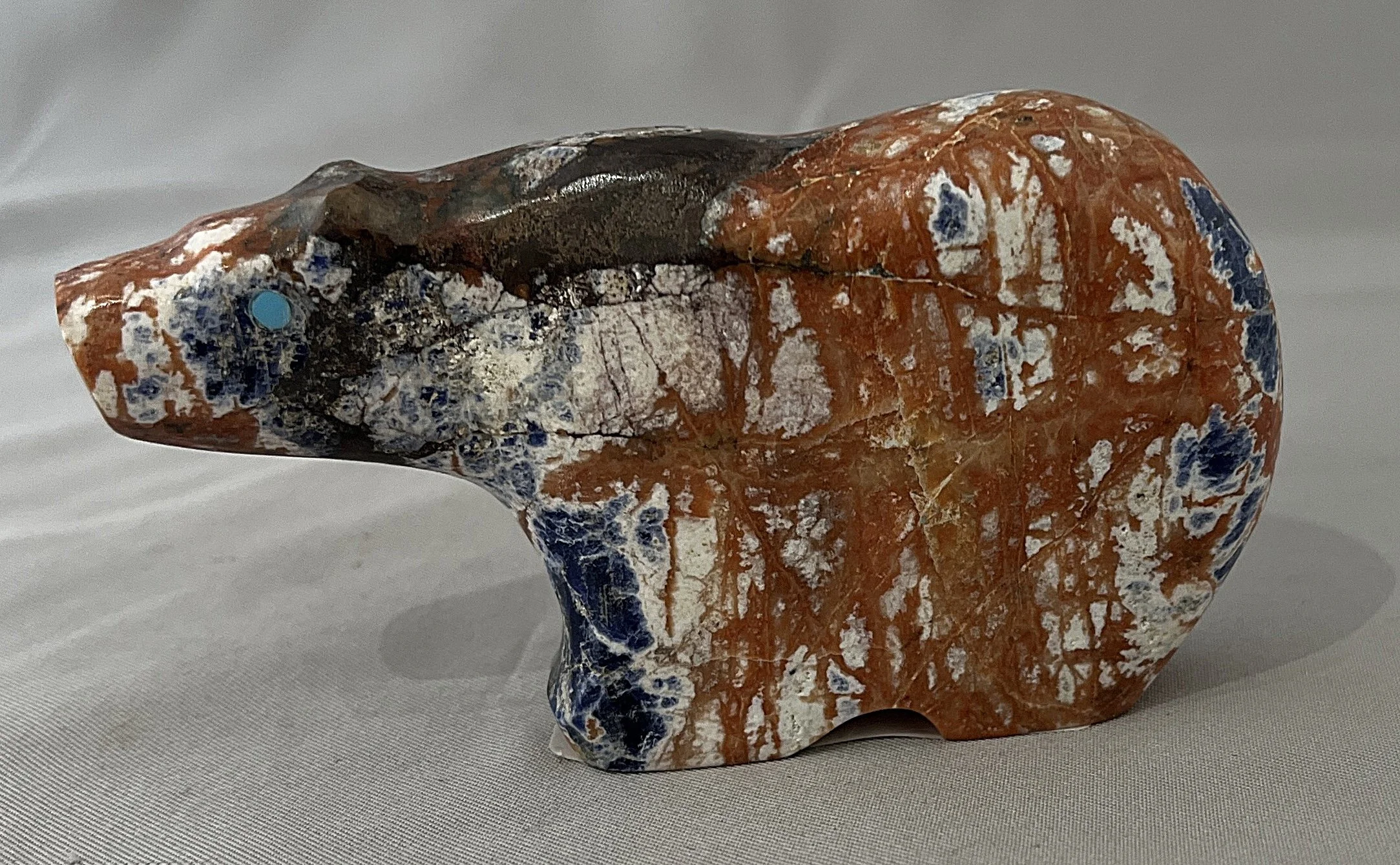 In the same vein as his marvelous ring below to the left, but executed in copper, which really enhances the overall appearance of his meticulous crafted inlay work. Sponydlus shell, lapis lazuli, natural turquoise, malachite and shell. 1/2 inch wide and made for a medium wrist/. $900. (TUCSON