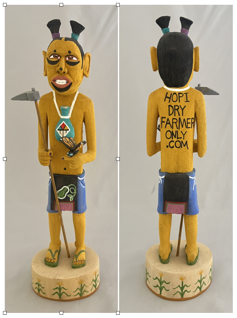 The Hopi clown-farmer at left was carved by Gary Tso and stands 12 inches high. It’s priced at $240. We will donate 100% of the proceeds to Bidii Baby Foods LLC and will ship it to the purchaser at no charge.