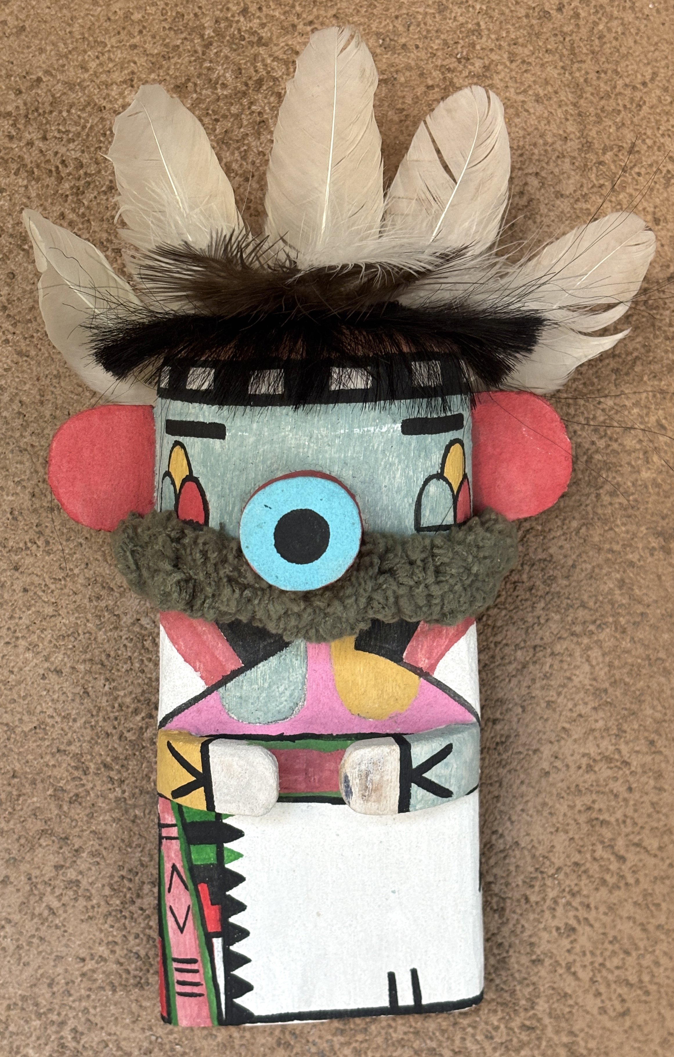 The Hooli katsina first appeared in a katsina ceremony in 1904 at Orayvi Village. His name means ‘dragonfly’ and refers to the dragonfly-like arrangement of the feathers on his head. There are warrior marks in the band across his face and some say that band represents lightning.