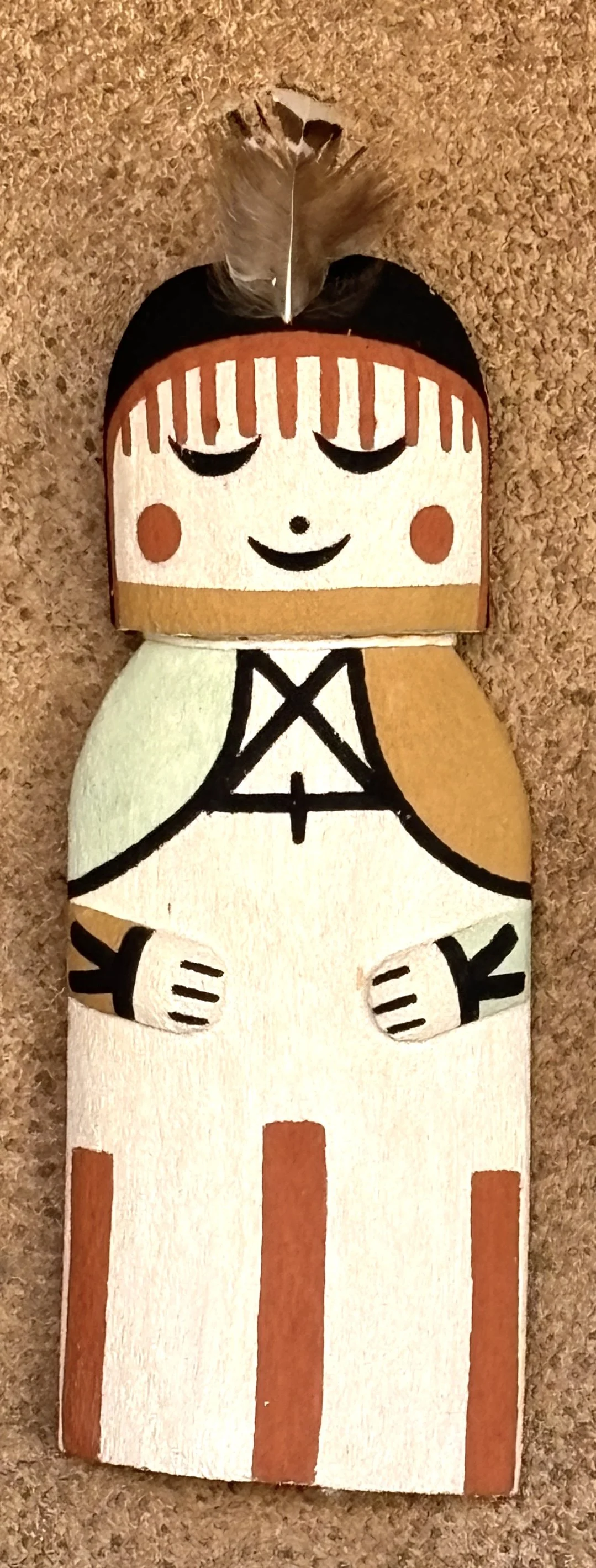 Also called "cradle dolls' because they are given to Hopi infants, Putsqatihut or flat dolls are the very oldest form of katsinas dolls among the Hopi. After a child has gone through his or her naming ceremony 20 days after birth, the first one received is the Hahay'i wuuhti or katsina grandmother. The next is the katsinmana or katsina maiden. After that they may receive any katsina doll. The katsinas themselves carve them for the young girls who continue to receive them (usually more fully formed and detailed ones as they grow older) until they are initiated into the Hopi Katsina Society.