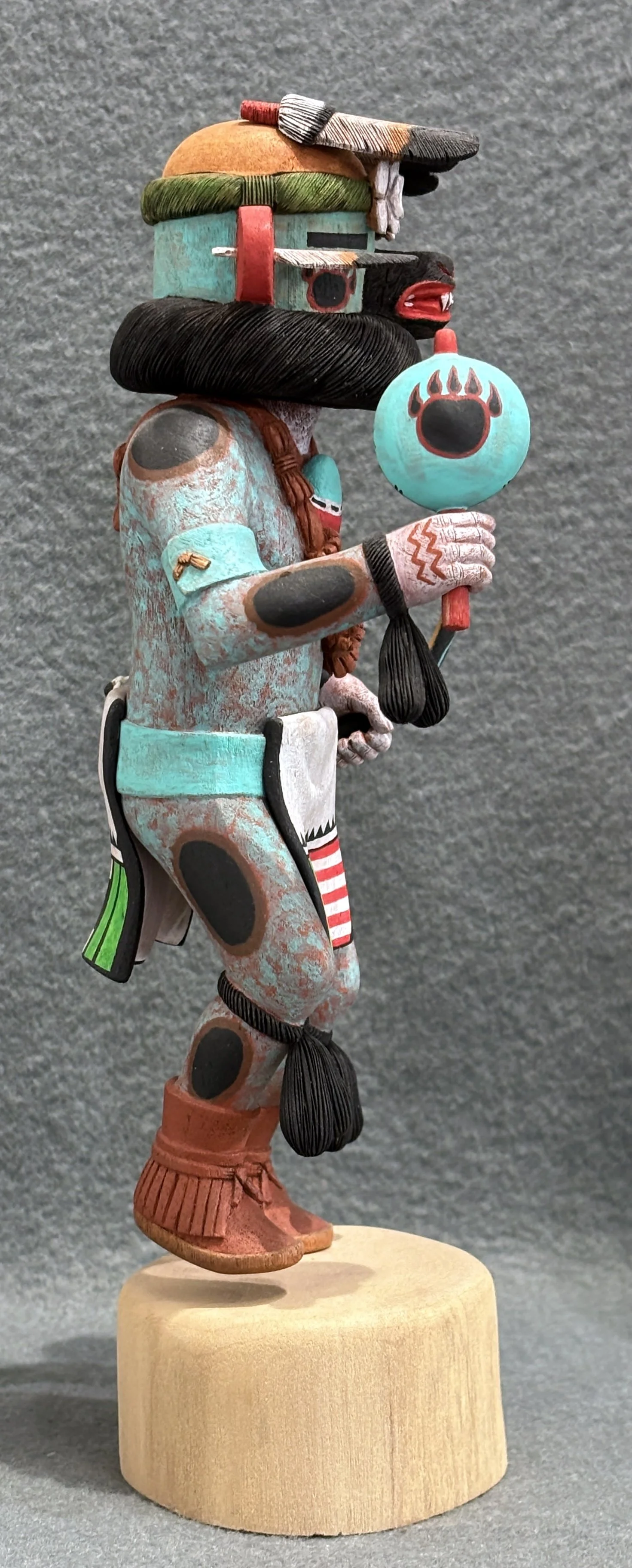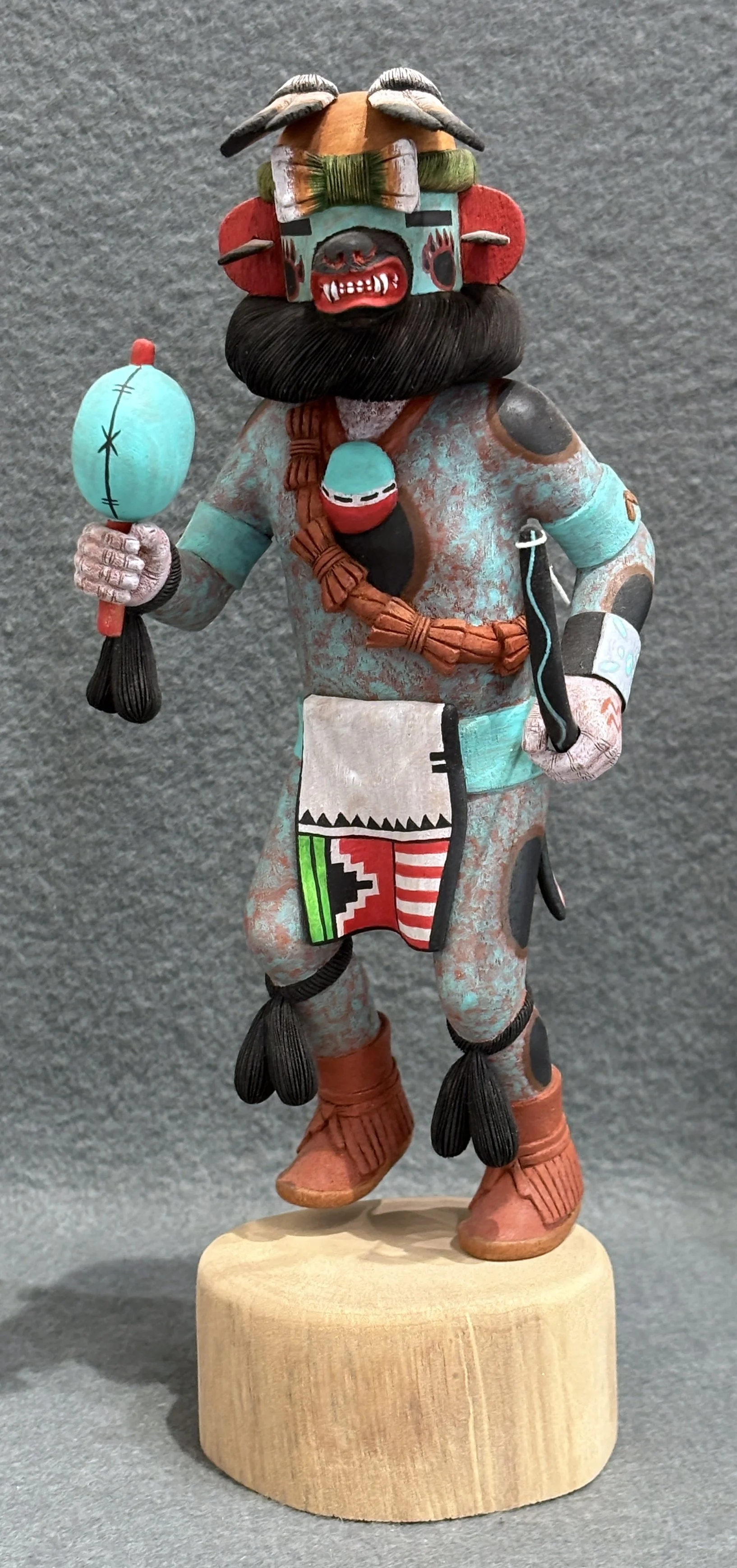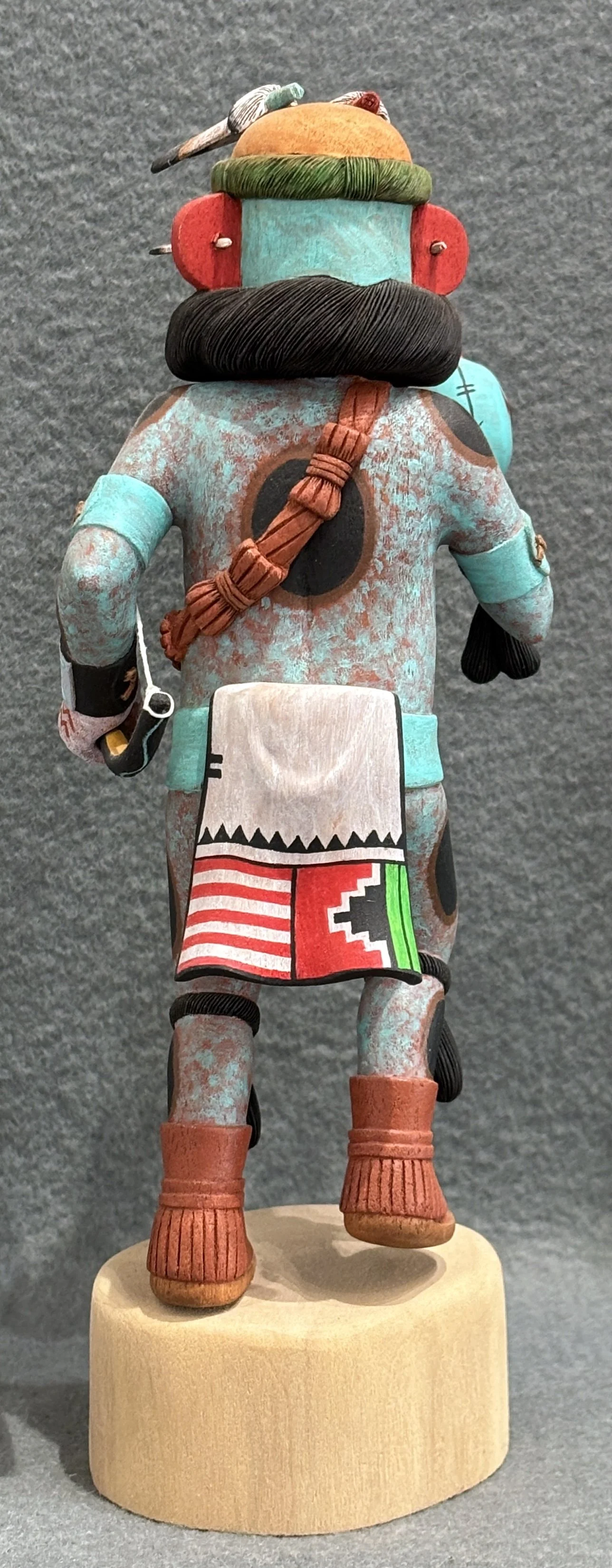 A beautifully detailed traditional style doll by Ethan Water. 11.5 inches tall (including base. He is depicted here as he would appear in one of the summer dances - with gifts for both boys and girls. $800. (SANTA FE)