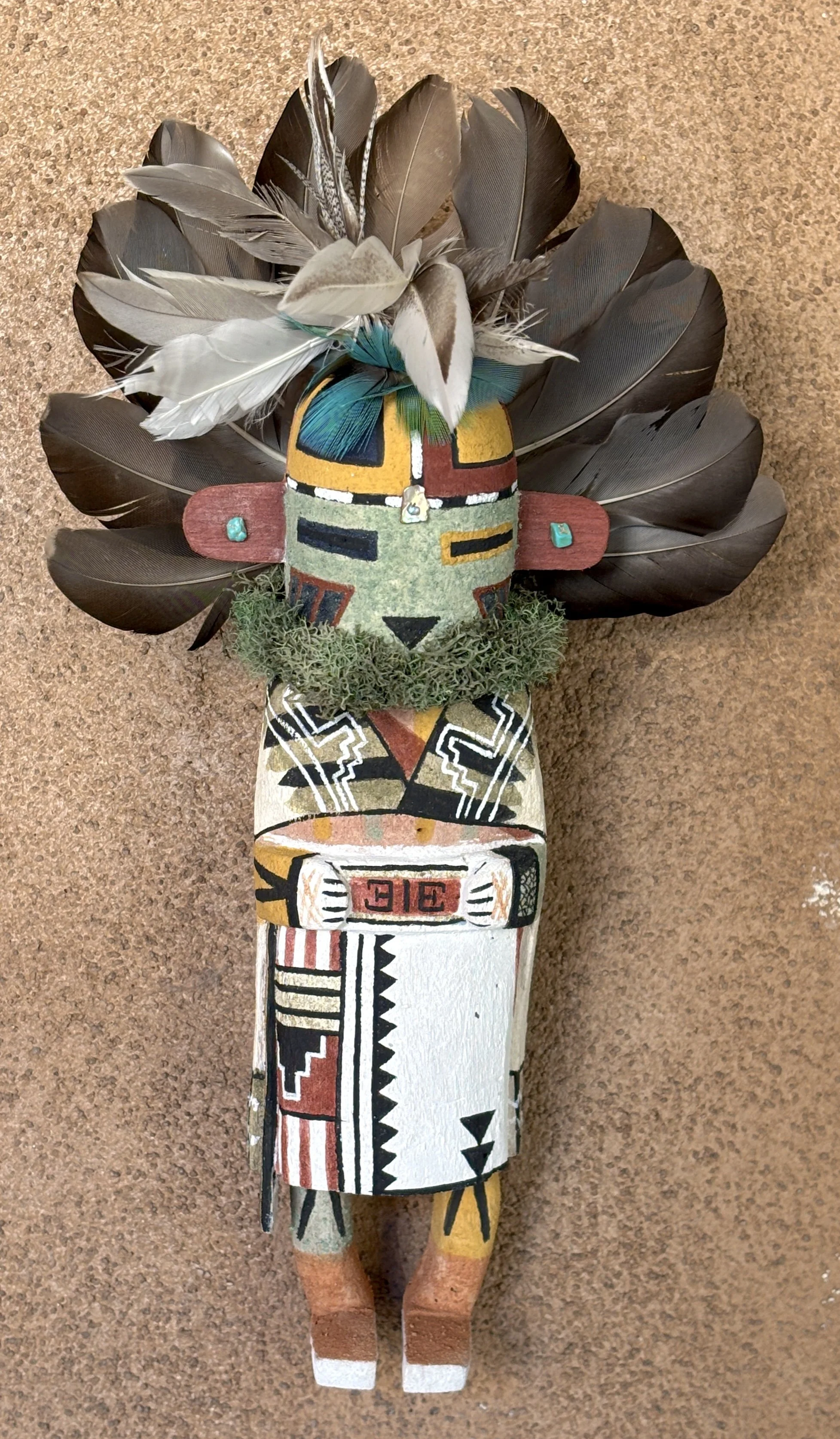 A Kowaako Mana or Chicken Maiden by Wayland Namingha Jr. This one is 11.75 inches high to feather tip and $280. At right is a Talwíipiki or Lightning katsina by Raynard Lalo. This one is 14.5 inches high and $400. A Huuhuwa* or Cross-legged katsina by Max Curley. 8 7/8 inches high and $260. An Omaw by Ryan Gashweseoma 12.25 inches tall and $425. (ALL in Santa Fe)