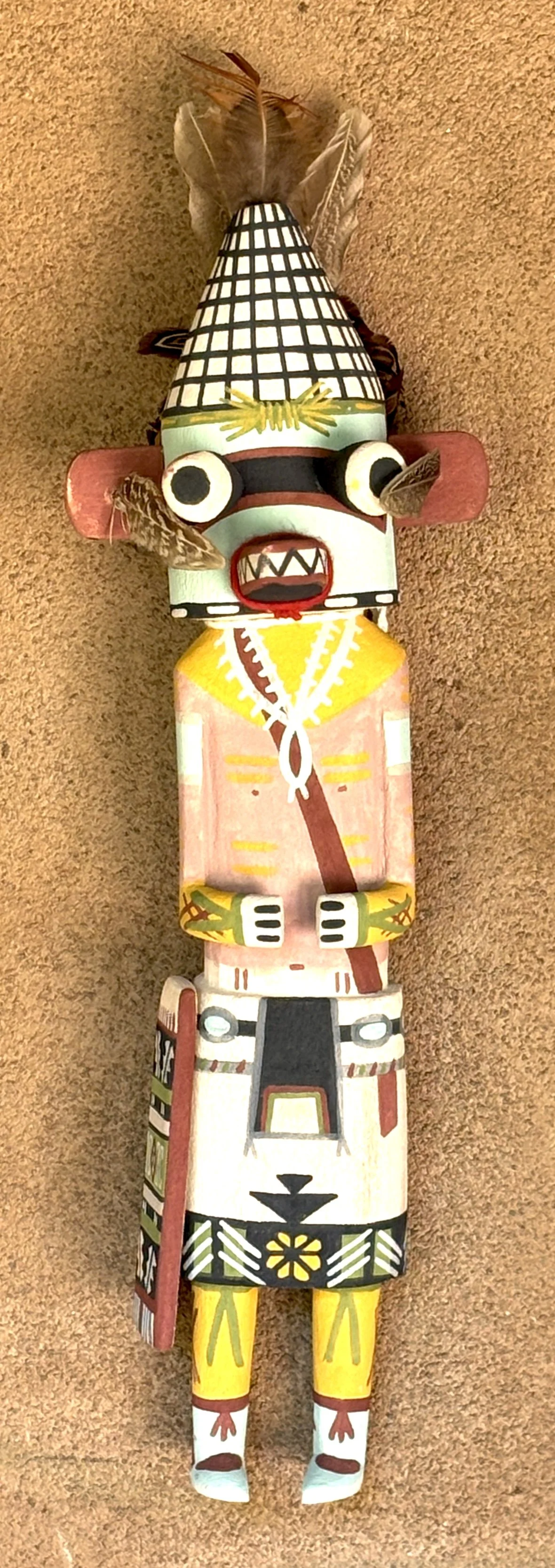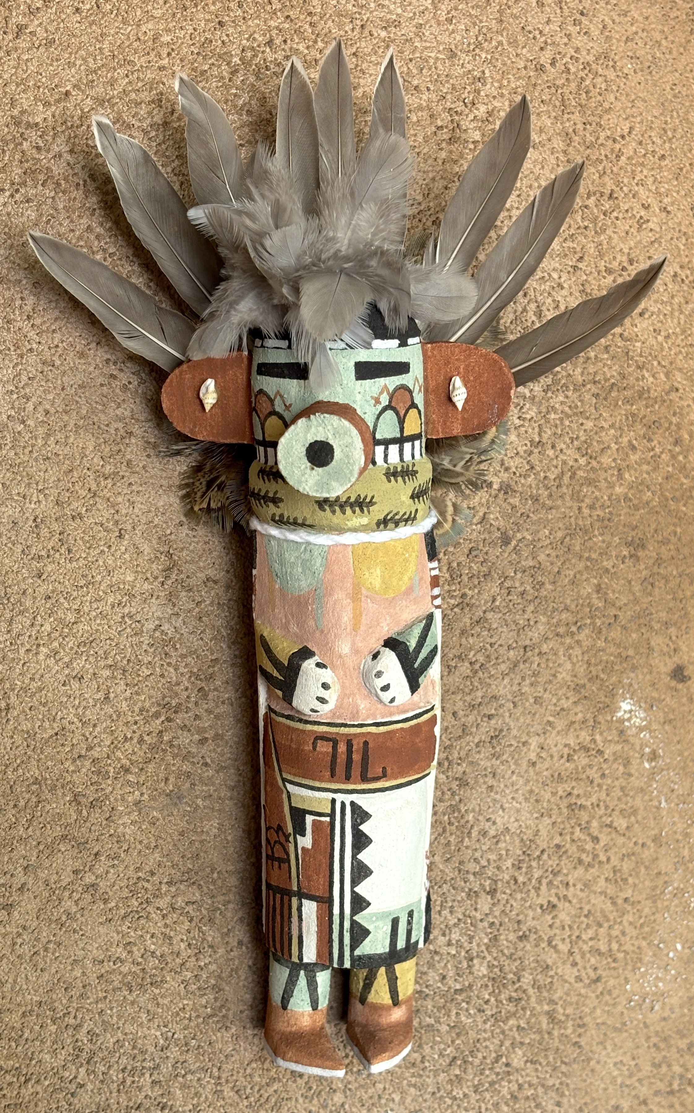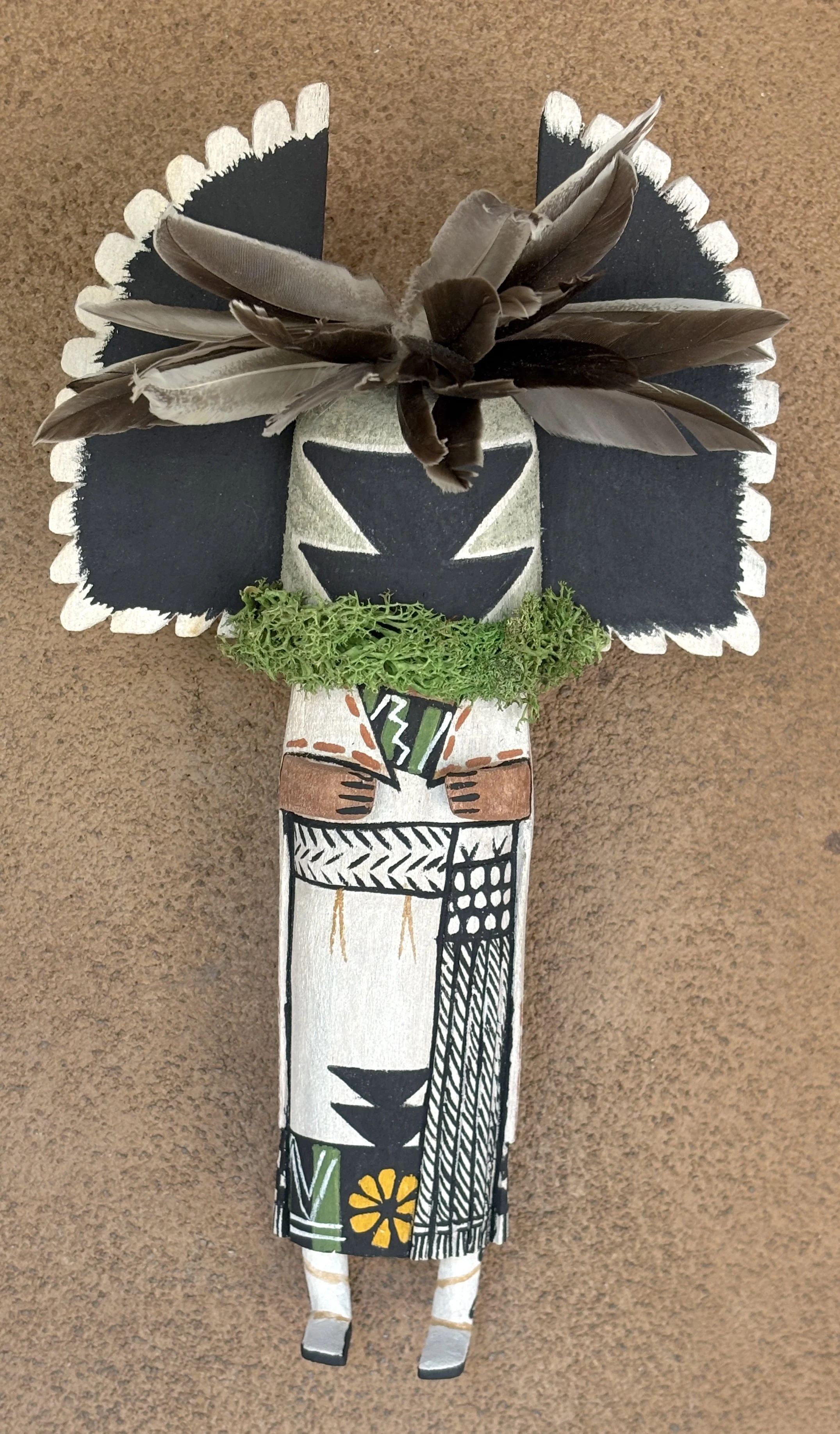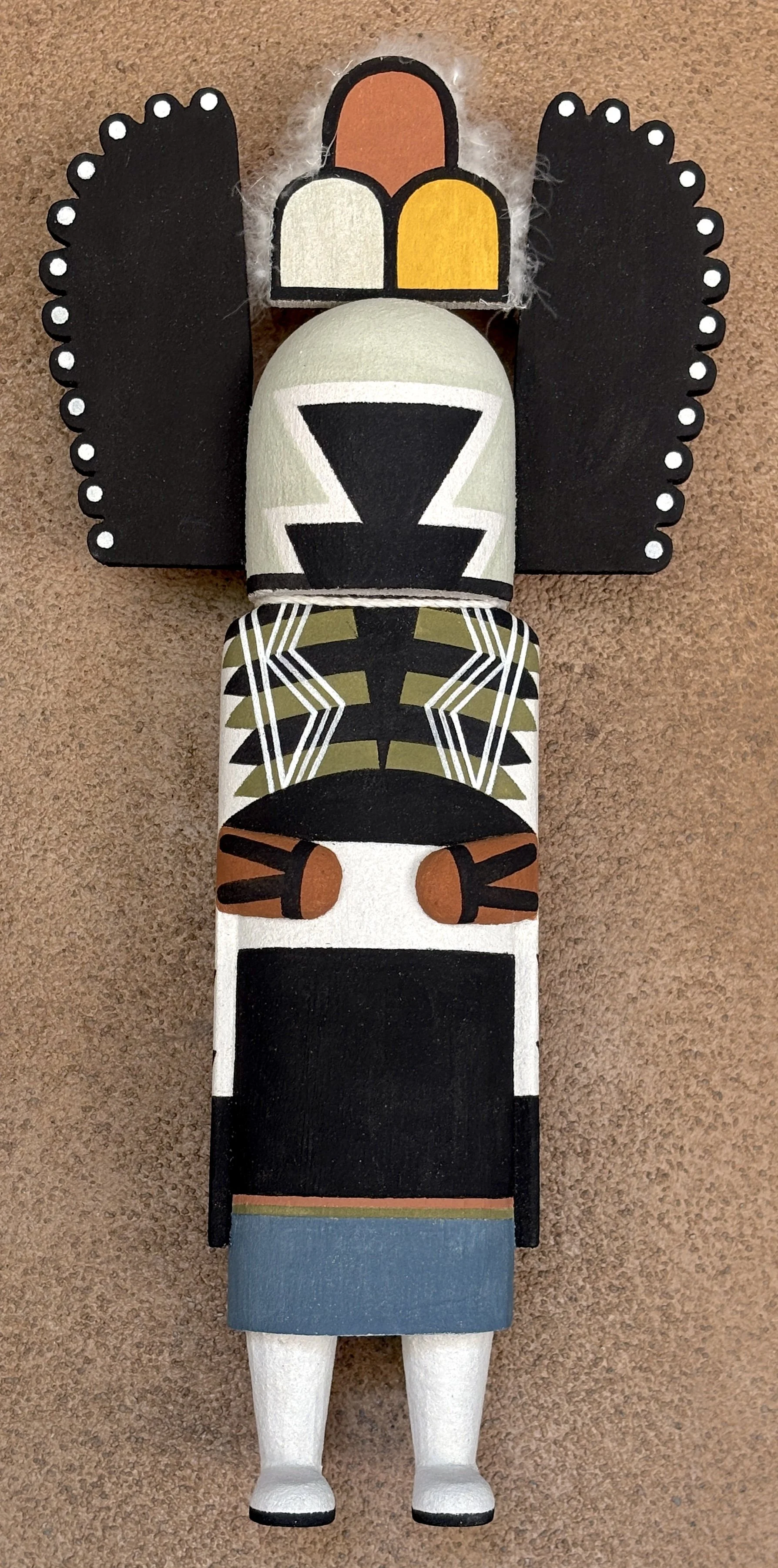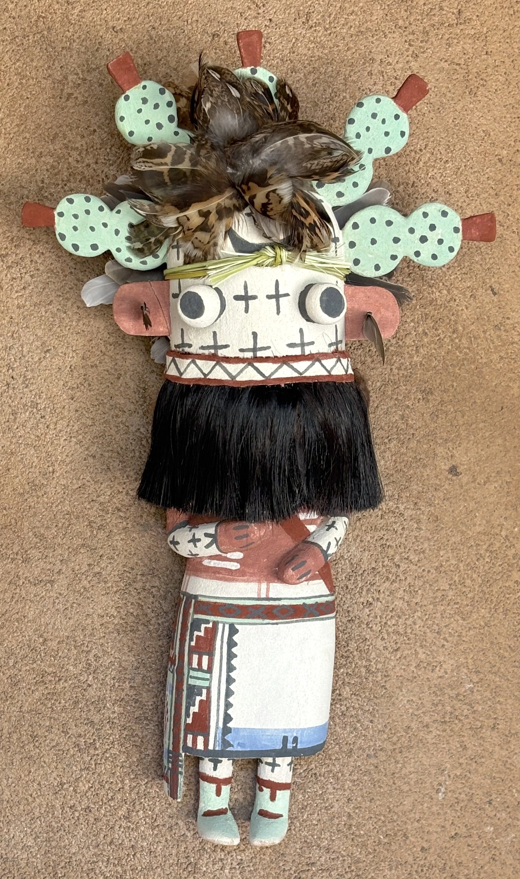 The Hoho Mana is by Ryan Gashweseoma and is 9 inches. $350. (TUCSON) A beautiful Angwusanomtaqa (in this form, wearing a Hopi white wedding robe, she is called Crow Bride) by Sandra Suhu. 10.75 inches high to wing tips and $400. (SANTA FE) The Yögötsina or Cactus katsina was made by Clark Tenakhongva. It is just over 14 inches high and $500. (SANTA FE) A Talavay or Early Morning katsina by Jared Quamahongnewa. 10 3/8 inches high to feather tip and $200. (SANTA FE)