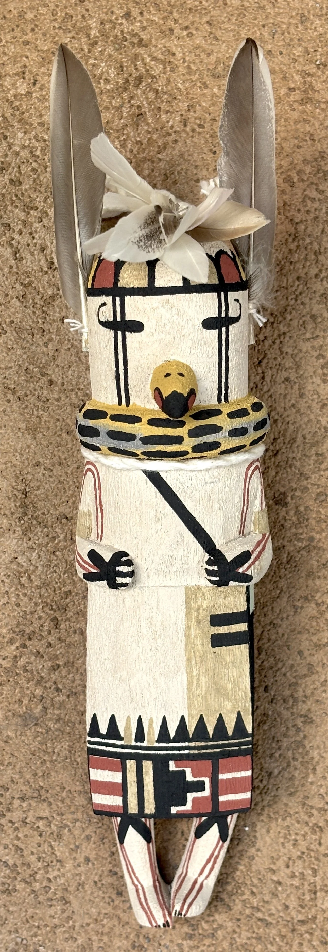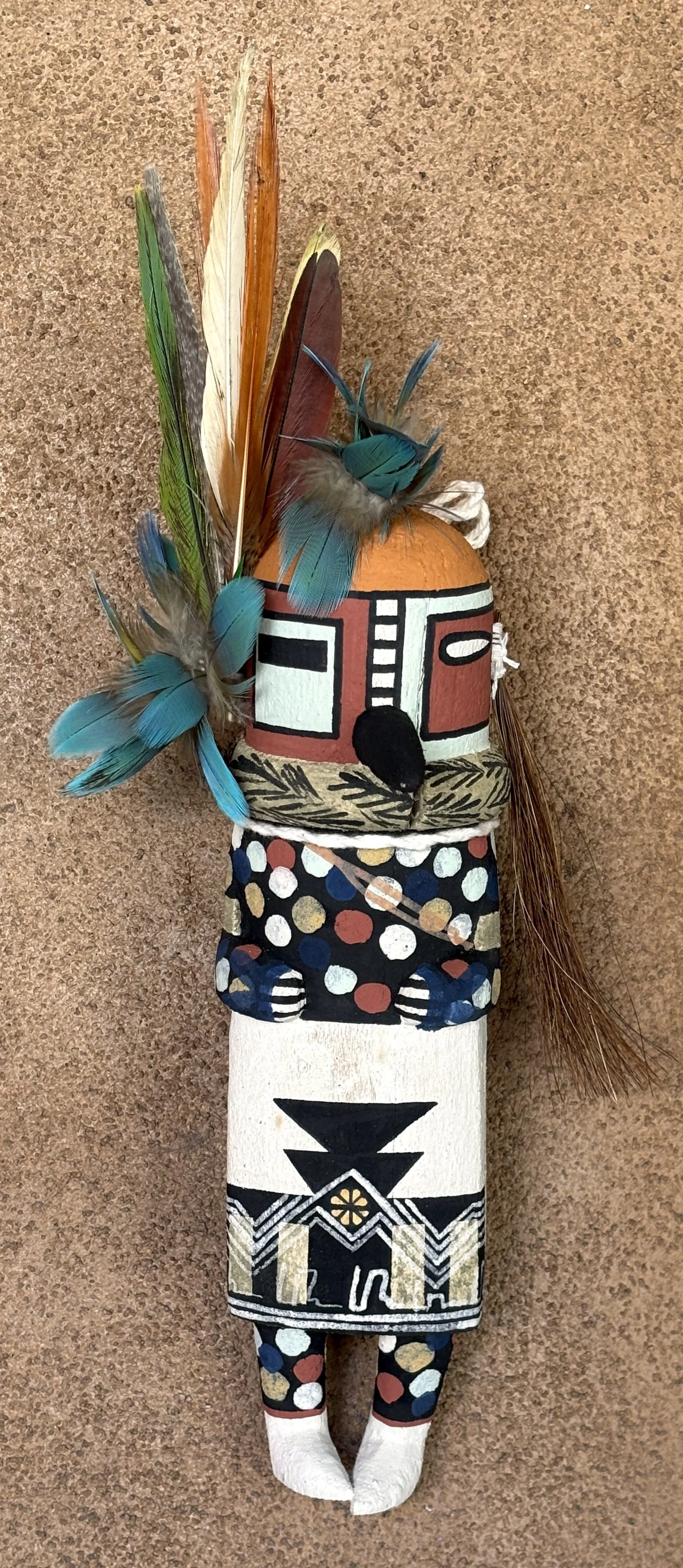 Three dolls by Ryon Polequaptewa of the Sun Clan from the village of Songóopavi on Second Mesa. Ryon took inspiration from the dolls carved by his great-grandfather, Wilson Tewaquaptewa (1873-1960), who was the last traditional kikmongwi of Orayvi Village. Ryon created these dolls in Tewaquaptewa’s iconic style, which is a mixture of attributes from several katsinas, something Tewaquaptewa began in the 1920s and were not meant to represent a particular katsina or concept. The range from 10 to 11 inches without the feathers and are $450 each. (ALL THREE IN TUCSON)