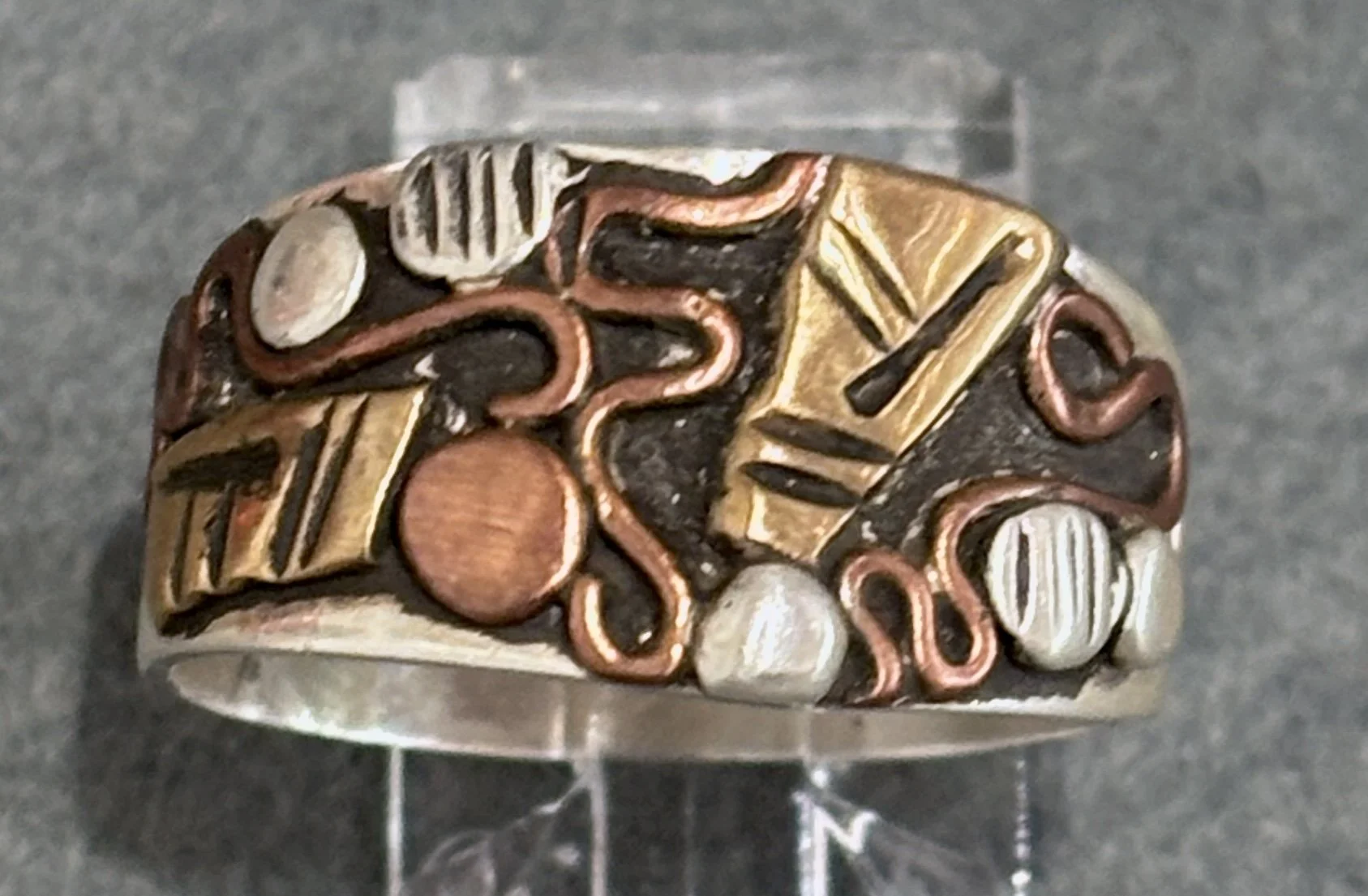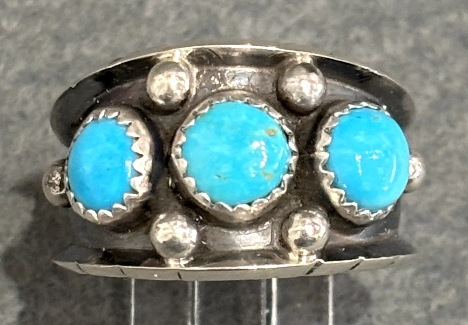 From left to right: Set with an unusual cut natural Royston turquoise, it measures 1.5 by 1 inch and is a size 11. $400. With a chiseled bezel, the next one is a size 9 1/2 and measures 1 1/4 by 1 1/8. Natural turquoise by Craig Agoodie, SOLD. Also by Craig is this ring set with natural turquoise from the Pilot Mountain Mine, size 9.5 and is $520. Lastly, a ring by Dean Brown that is set with natural turquoise from the Kingman region. A size 8, it is 2 by 1.5 inches. $285. (ALL IN TUCSON)