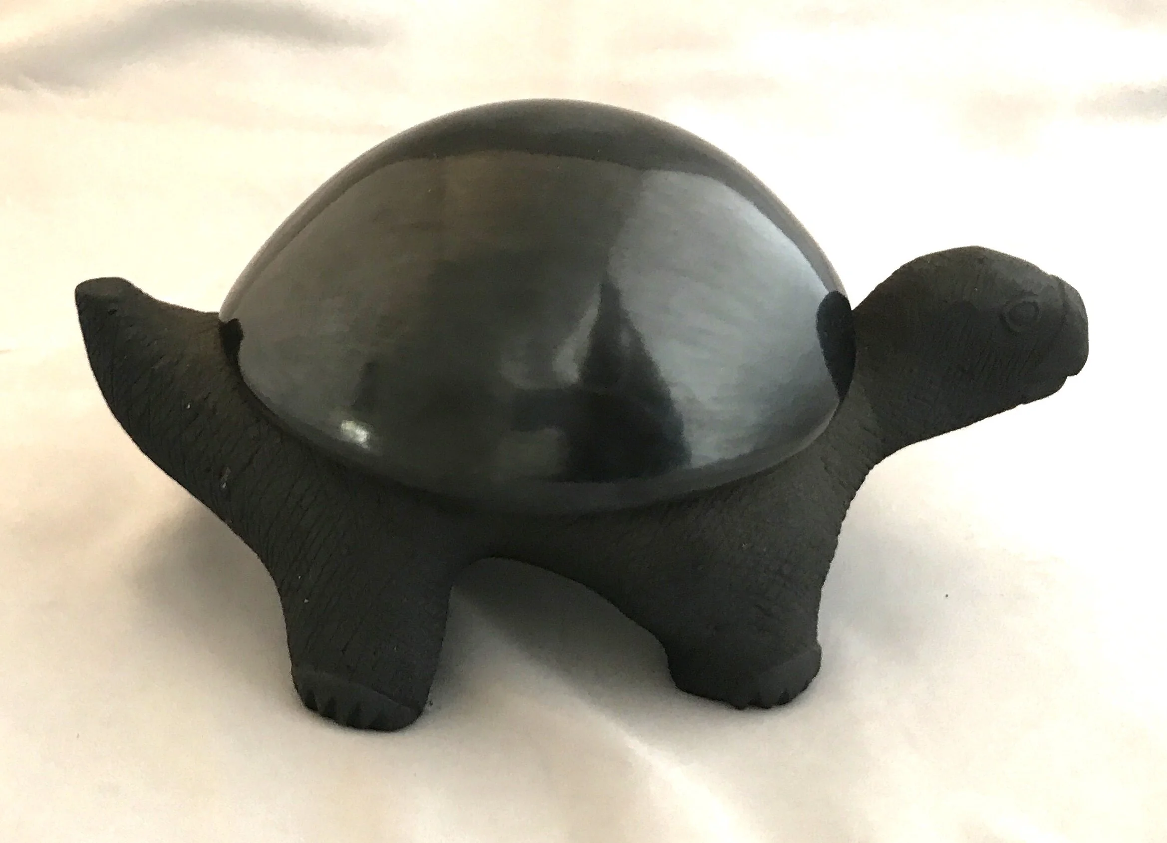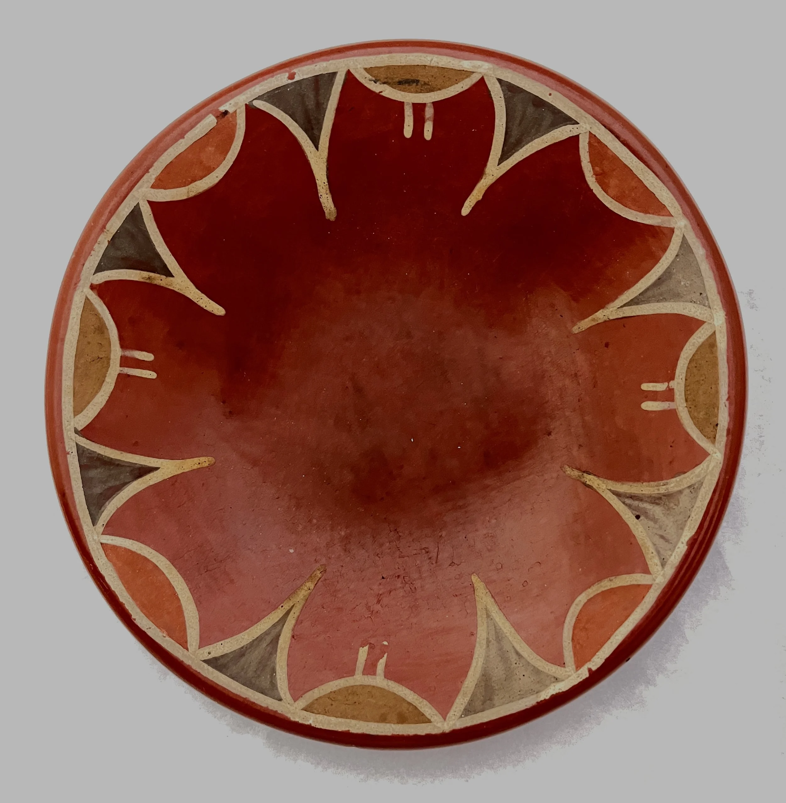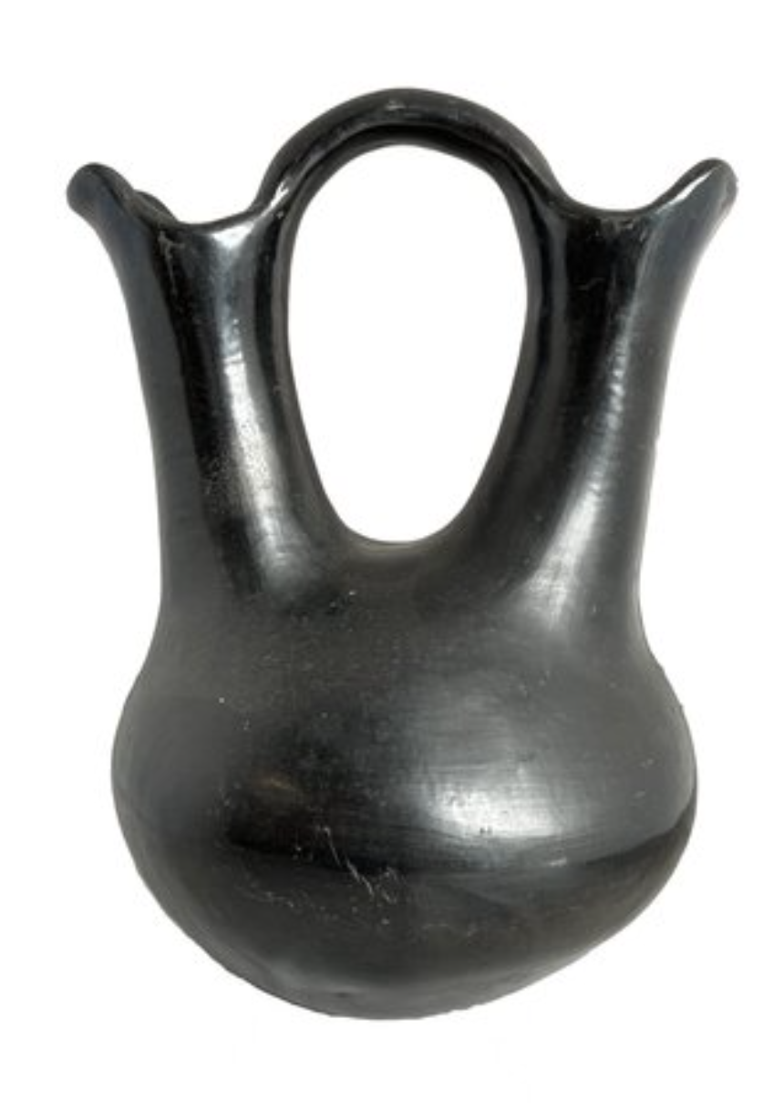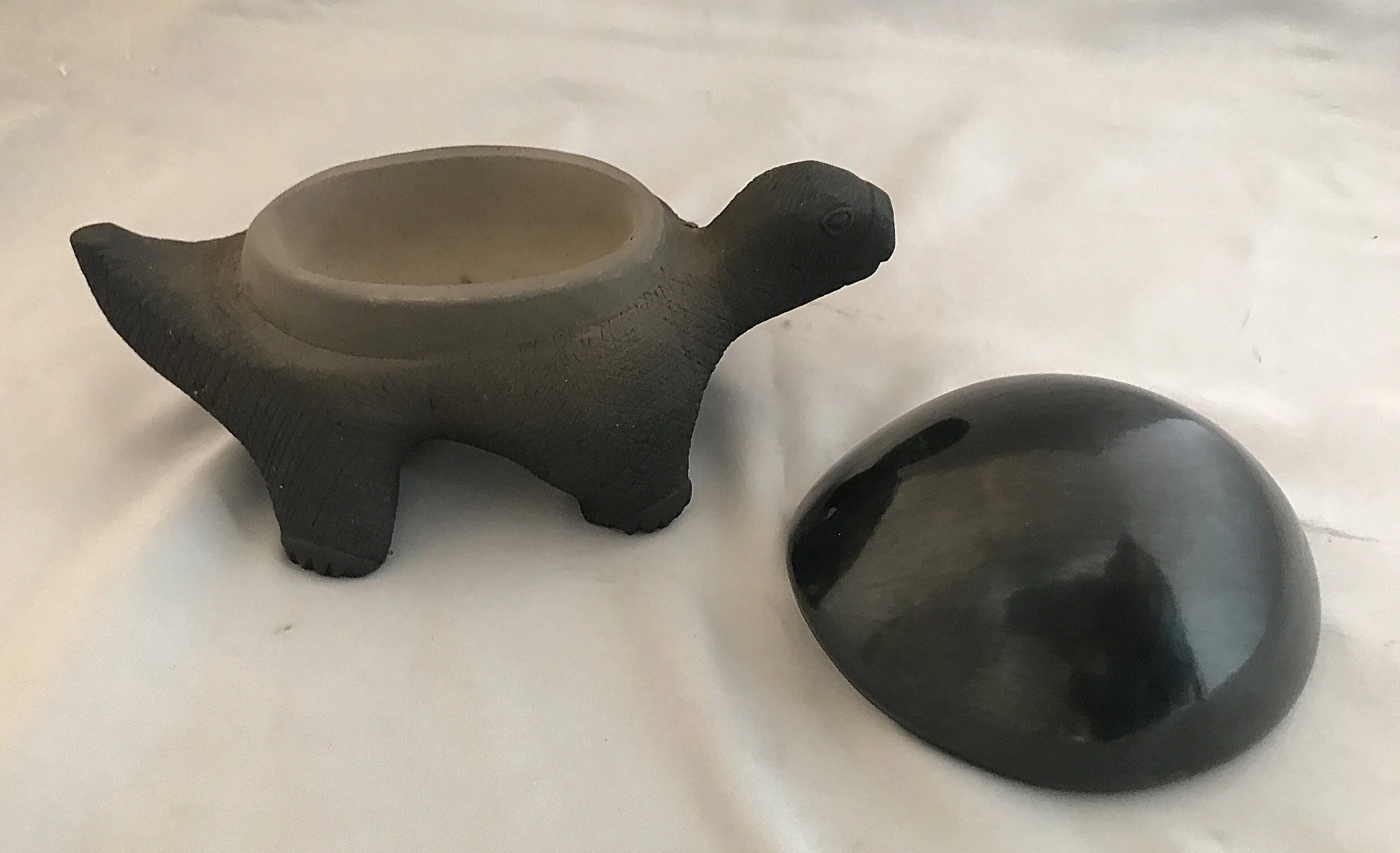 Ryan Roller created this one-of-a-kind lidded redware jar with an Avanyu (Water Serpent) pattern carved into the base and added a sculpture of the avanyu on the lid, In a first for him, he added a blue-green stone, found while elk hunting, for the horn and then carved and painted a piece of walnut for the water issuing from it’s mouth. (Also something unique, as most potter have lightning issuing from its mouth. A terrific work in clay! $1000.