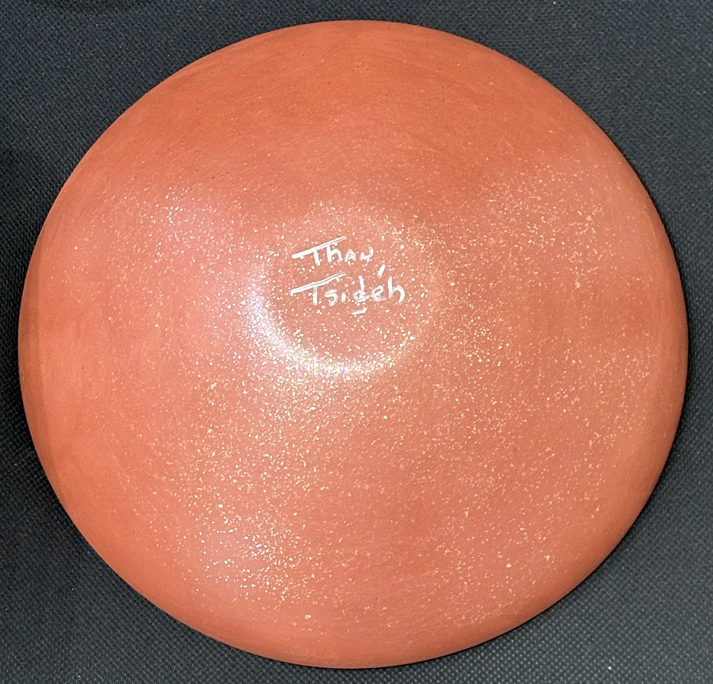 A first glance his striking bowl by Than Tsideh (Eric Fender) looks like a Dia de los Muertos image, but look closer. It’s comprised of traditional Pueblo imagery: dragonfly, star, lightning, bird, cloud and prayer feather motifs all came together to create this unique piece of clay art, which is inset with ten pieces of turquoise. The photo at right is to show the reverse of the bowl. Just over 3.5 inches high and 12” in diameter. $1,800. (SANTA FE)