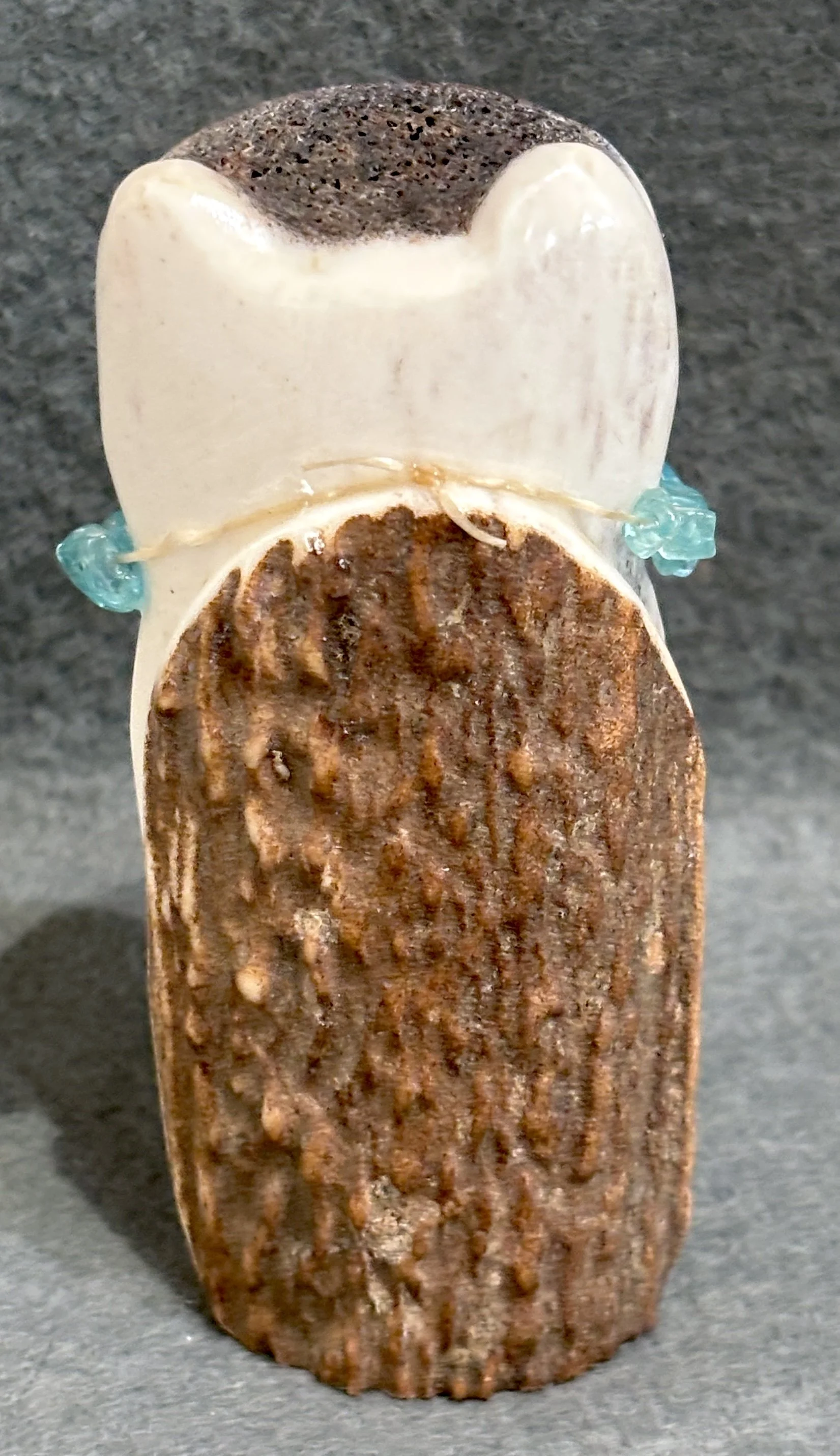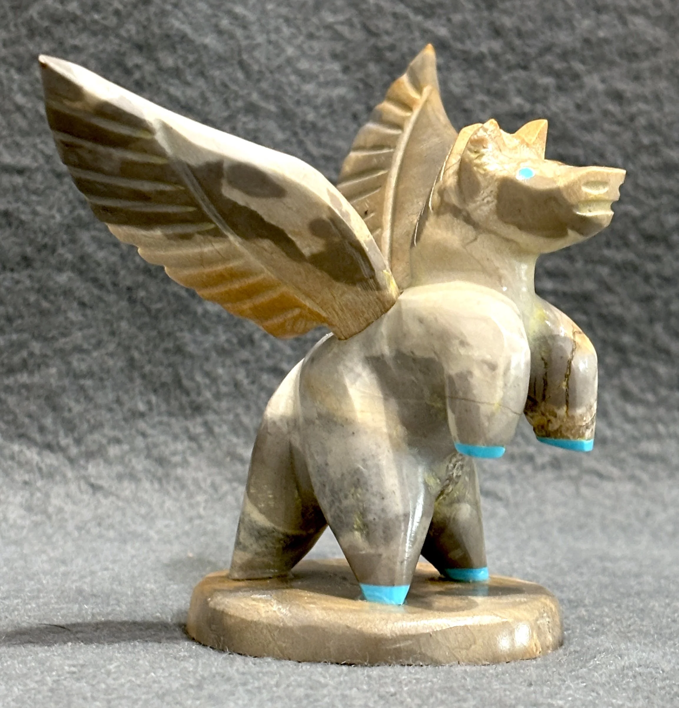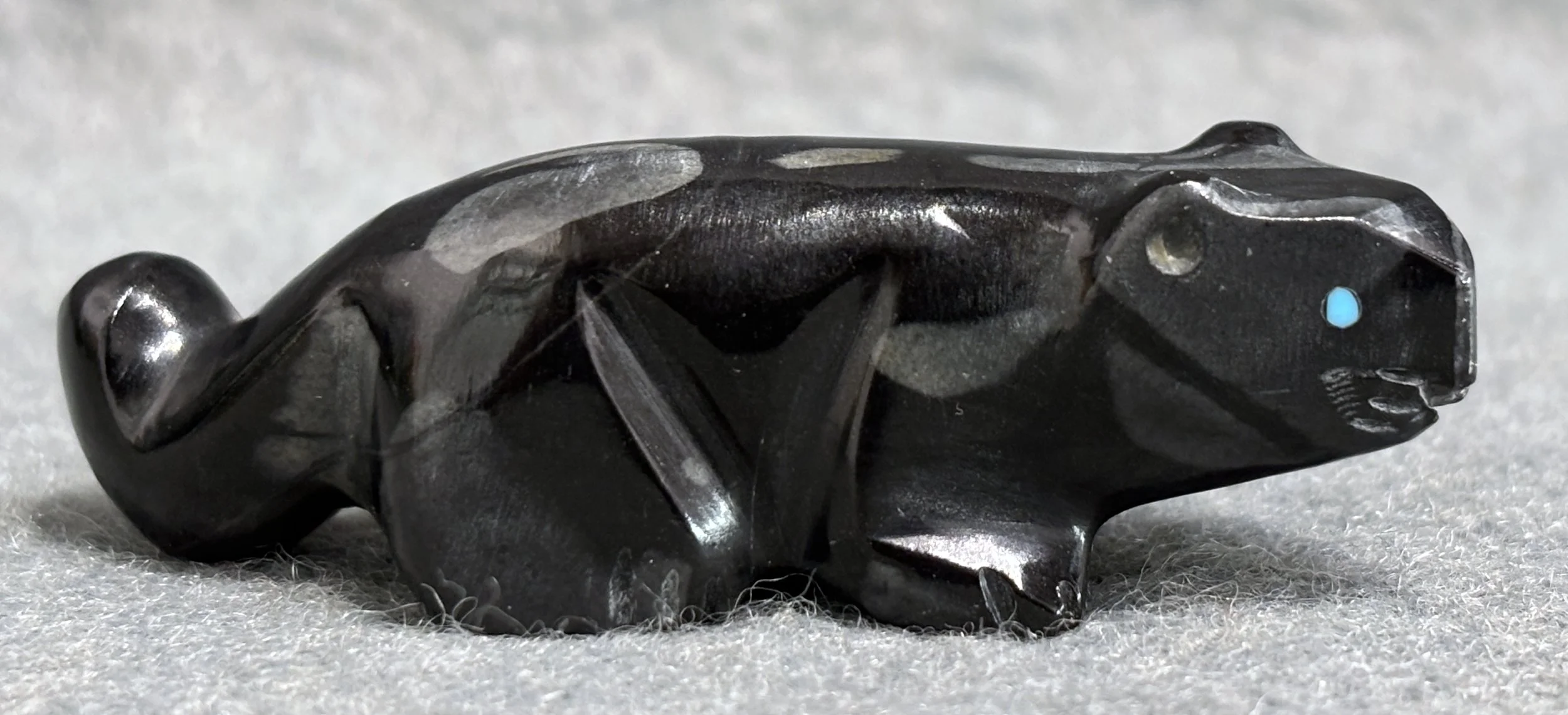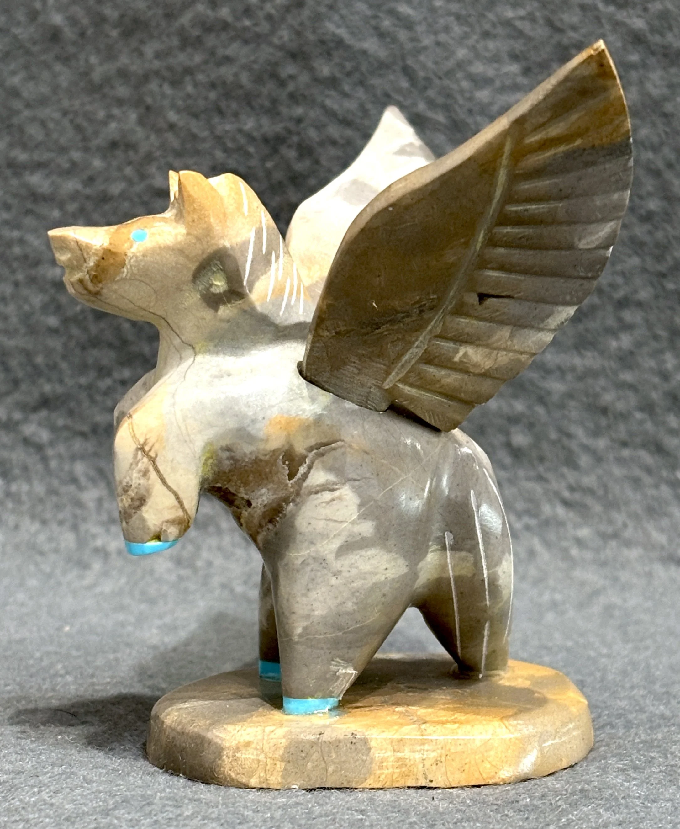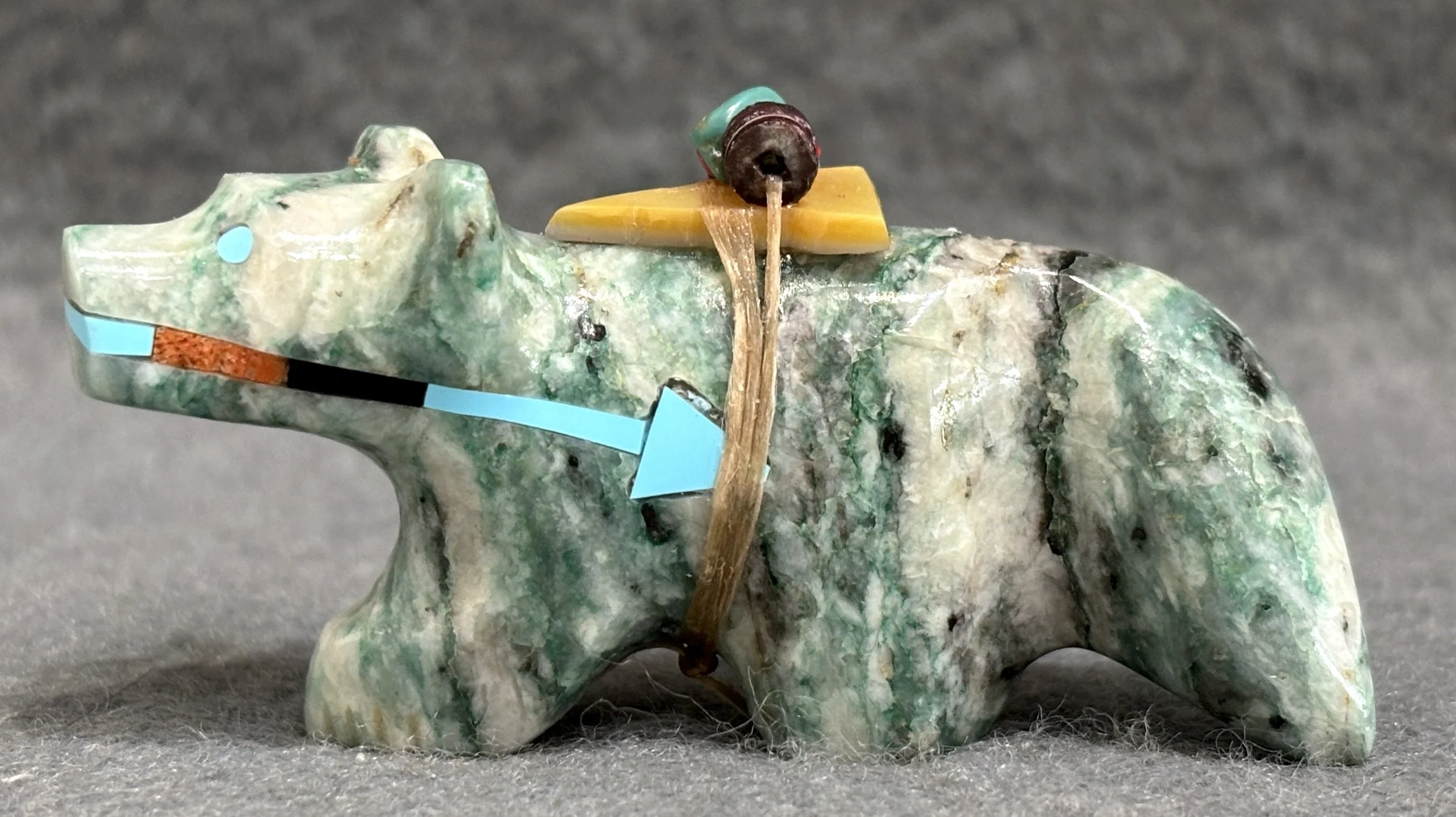 At left are two Zunistone figures carved by Freddie Leekya. The one at left has a bag of turquoise slung on his left shoulder, it is 4.75 inches high and $150. The one at right with his walking stick is 4.25 inches high and $150. The fishing bear, complete with his sterling silver fishing rod, was made by Chris Gchachu. The bear is carved of serpentine, while the fish is a piece of shell. Just under 2.5 inches high and is $250.
