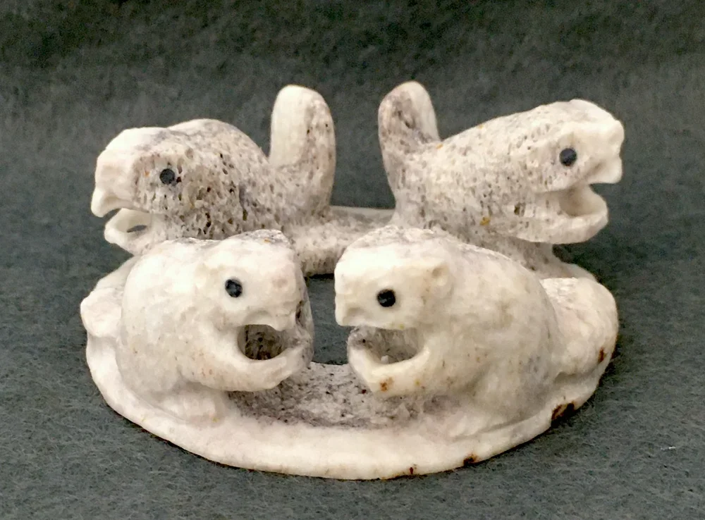 At left is a beautifully carved fossilized ivory musk ox by Inupiaq artist Norbert Thomas. This one is 2.25 inches long and $400. At right is a Picasso marble giraffe by Bernard Laselute, 1.75 inches high and $70.