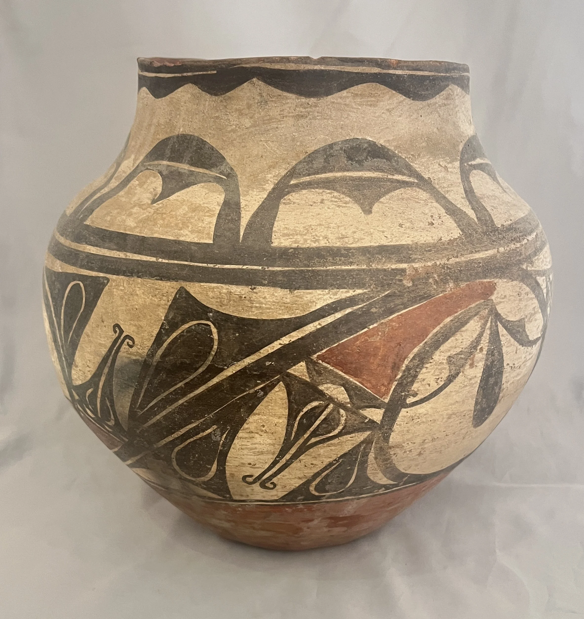 Two jars by Dina Yepa and her husband Ed. Each is 5 by 5.5 inches $250. The plate is by Annette (Tafoya) Romero from the Keres pueblo of Cochiti. The sister of potter Juan Tafoya, she was born in 1944 in Santa Clara Pueblo. She started out making Tewa blackware but switched to making storytellers in the 1980s, having learned from her aunt but she also took classes in pottery-making at the Institute of American Indian Art, which her husband also attended. Her husband Wilson Romero, is one of two fetish carvers in Cochiti. She is best known for her storyteller figurines and rarely makes plates or bowls. 11.5 inches and $200