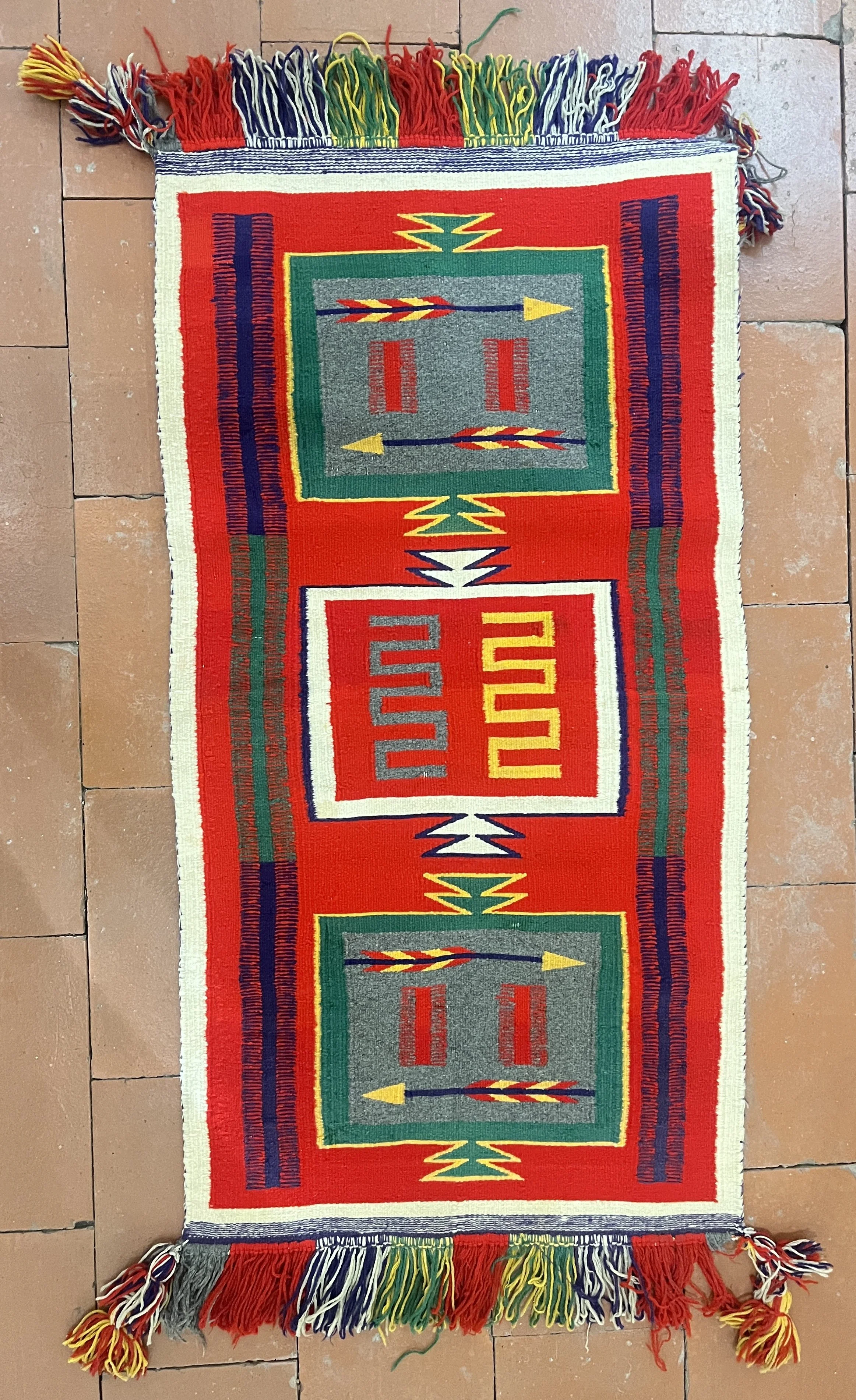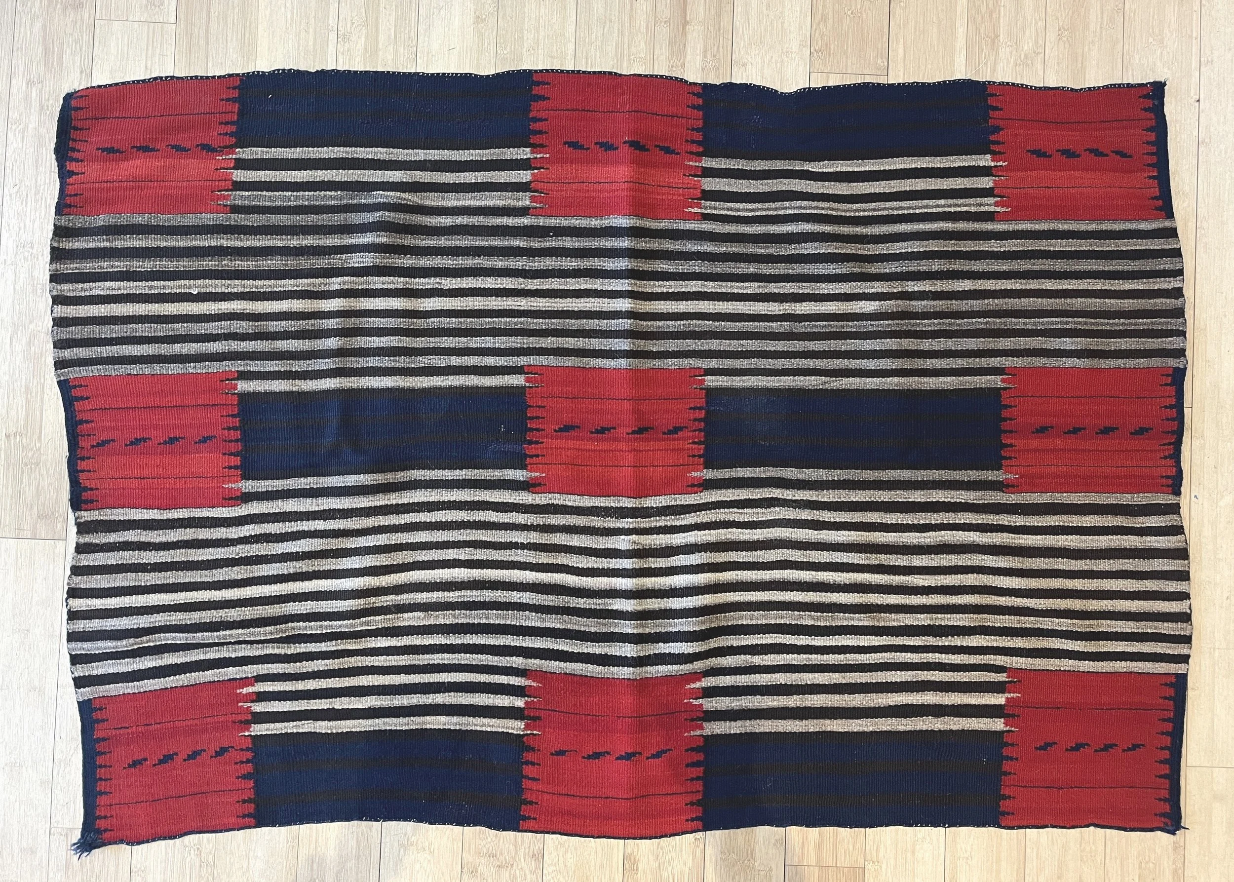 Circa 1880, this Chief’s blanket pattern textile was woven of natural grey wool, aniline dye red and indigo blue. It measures 53 by 35 inches. Very good condition with minimal restoration