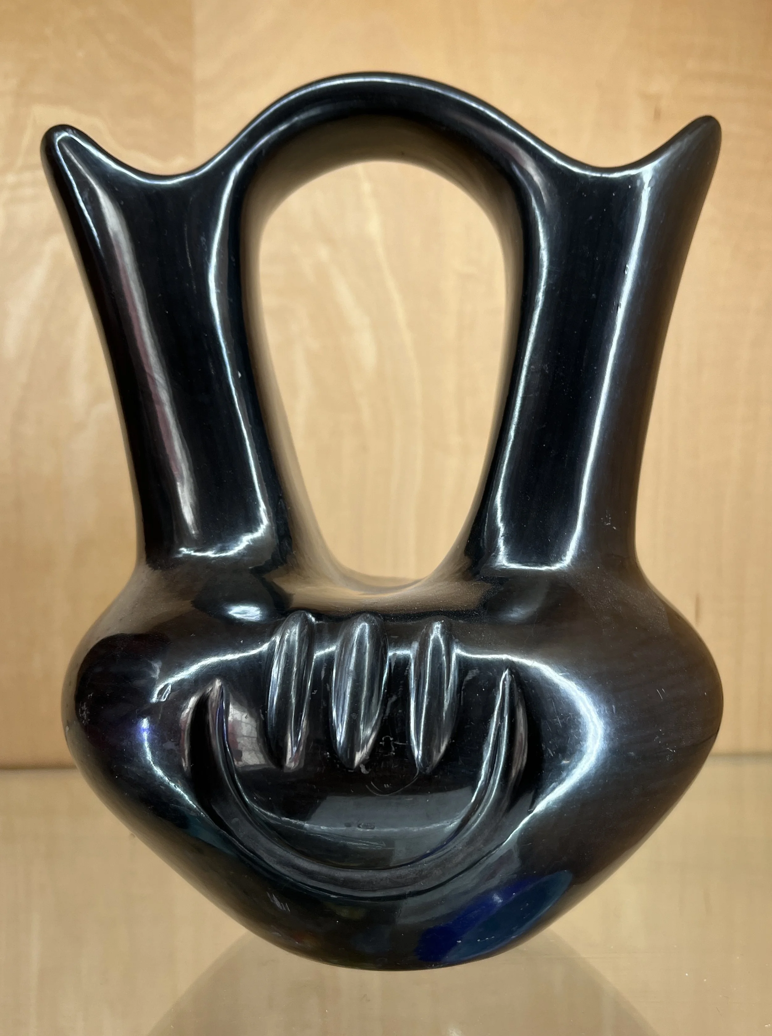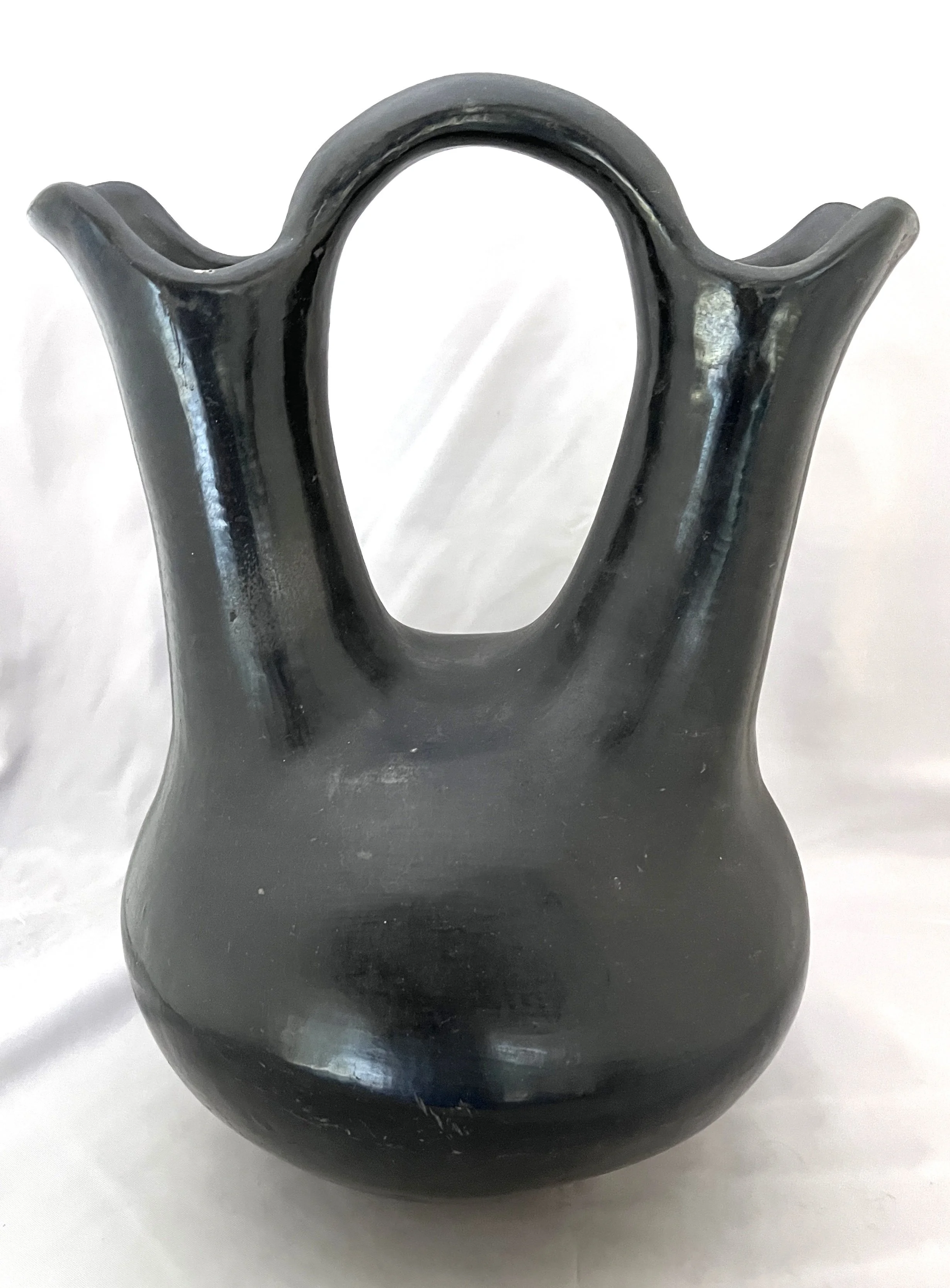 Two views of a wedding vase by Gloria Mahle, who has been working in clay since she was 15 years old. The pattern is that of the Butterfly Maiden dancer, with cloud, rain and bird motifs in her tablita (Kopaltsoki in Hopi) The handle is also painted with stylised bird and cloud motifs. 8.5 inches high and $350.